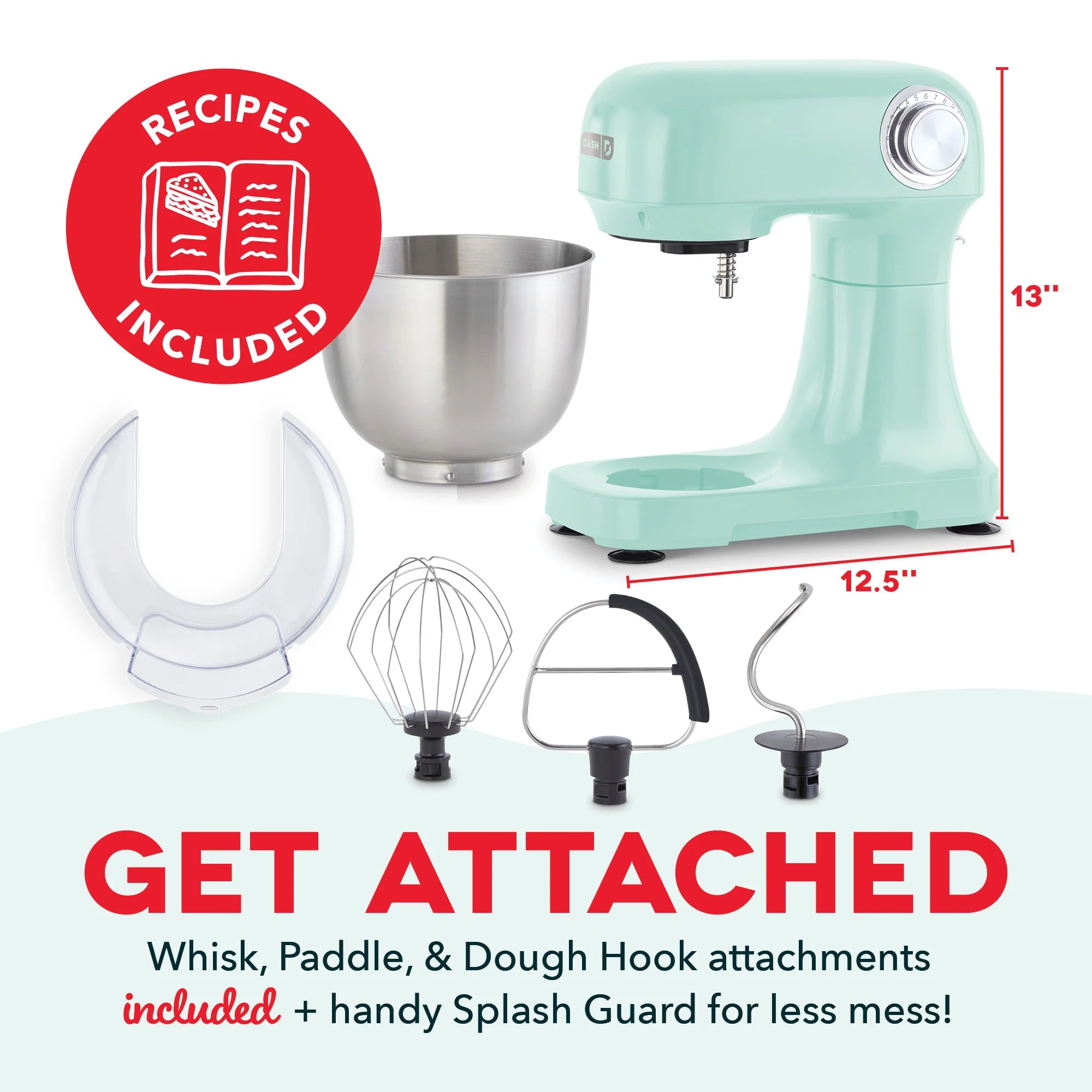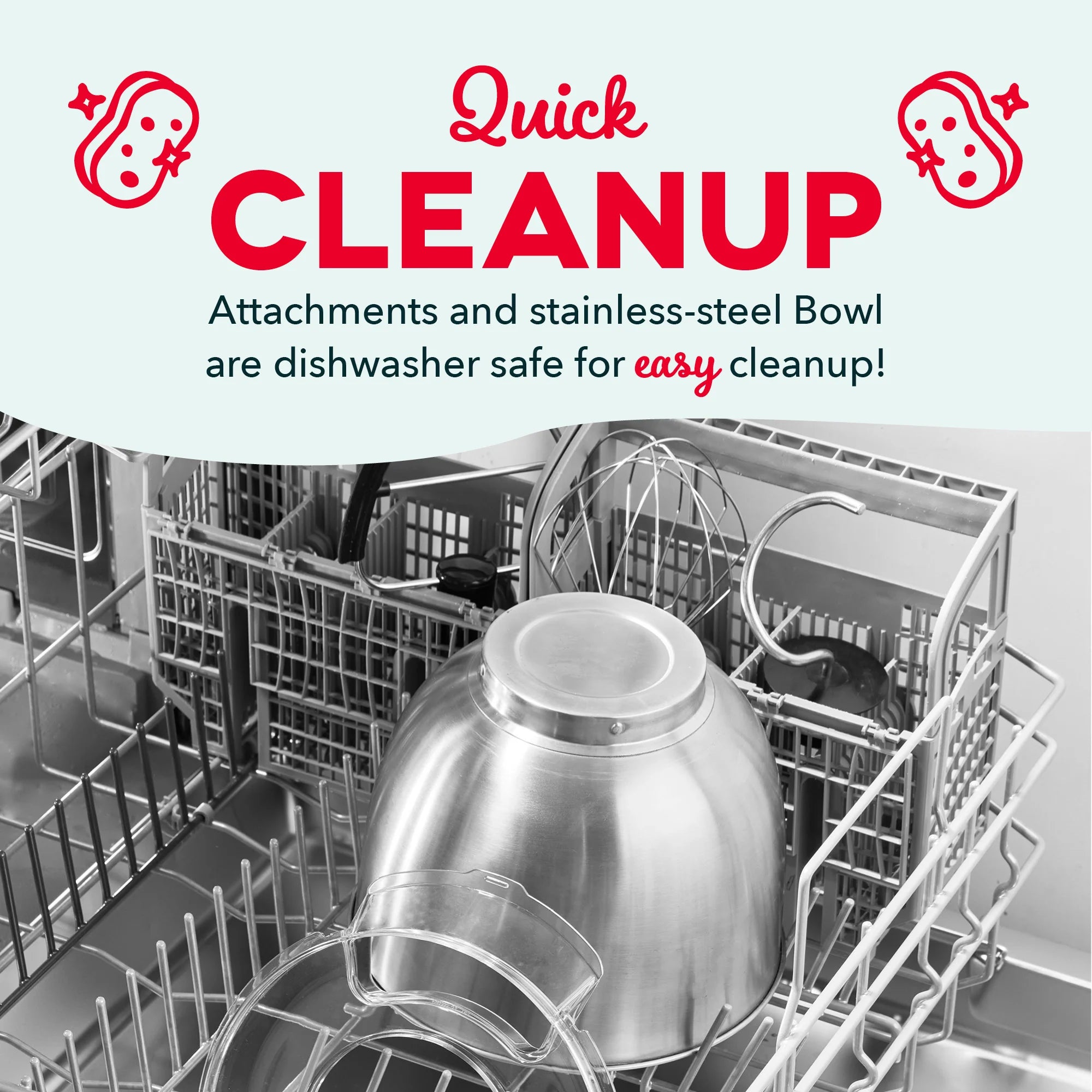 The baking buddy you never knew you kneaded! At 3.5QT capacity, it’s great for baking needs big and small! Lightweight but powerful with 350 watts,12 Speeds, and 3 Attachments, it can cream, whip, whisk, beat, and knead with ease. Go full tilt with full-range Tilting Head that makes it easy to remove Mixing Bowl and adjust attachments. And whisk away with less mess thanks to included Splash Guard, complete with handy Ingredients Chute for adding your flavorites while you mix. Mixing Bowl is sturdy stainless steel for carefree mixing. Paddle Attachment is great for batters, frosting, cookie dough, and creaming butter and sugar. The Whisk Attachment tackles eggs and whip cream in a dash—also marvelous for meringues! And the Dough Hook does all the work when it comes to kneading out pizza and biscuit dough. Bowl & Attachments are dishwasher safe—easy baking, easy cleanup! Don’t know what to throw into the mix? Recipes are included—can’t beat that!