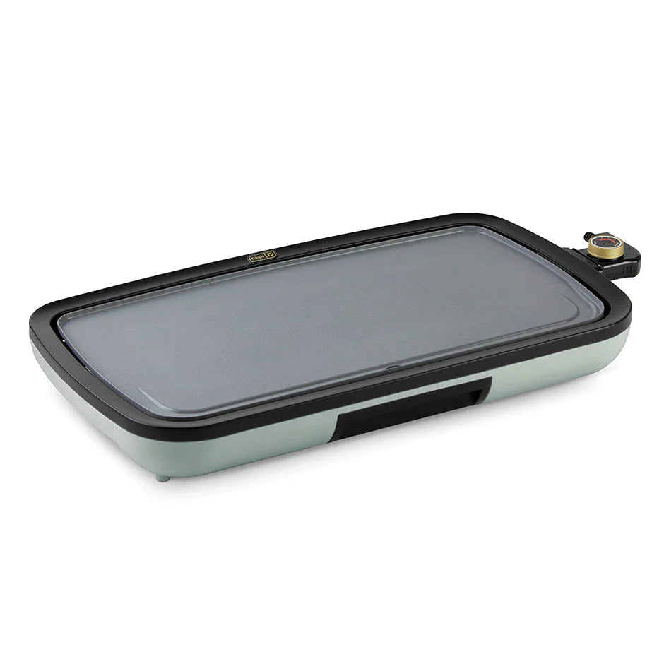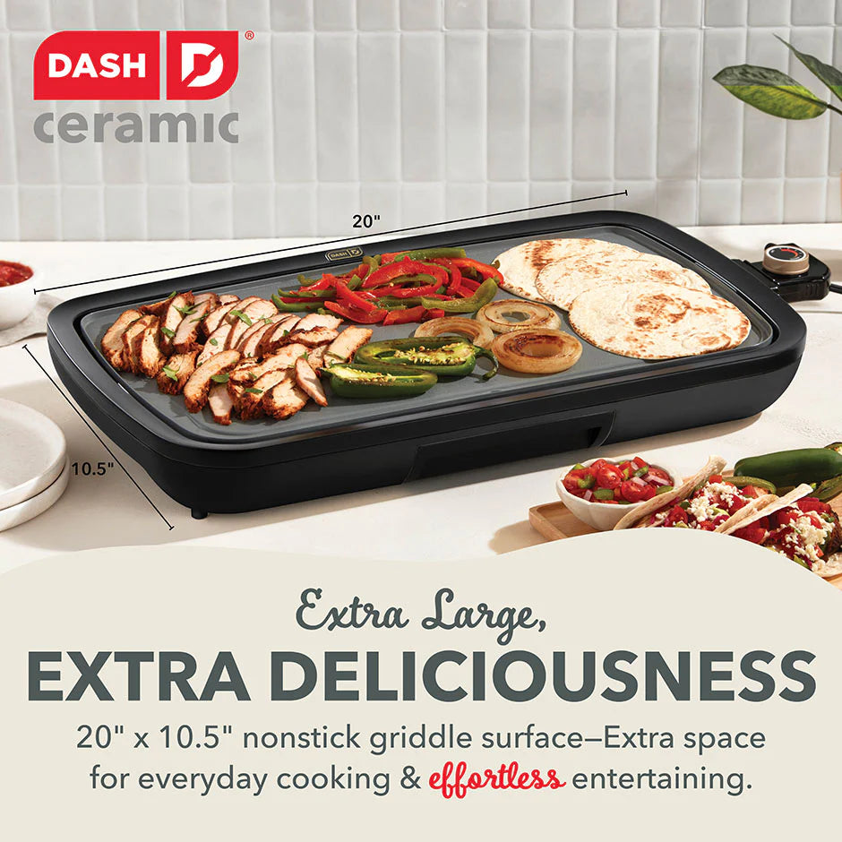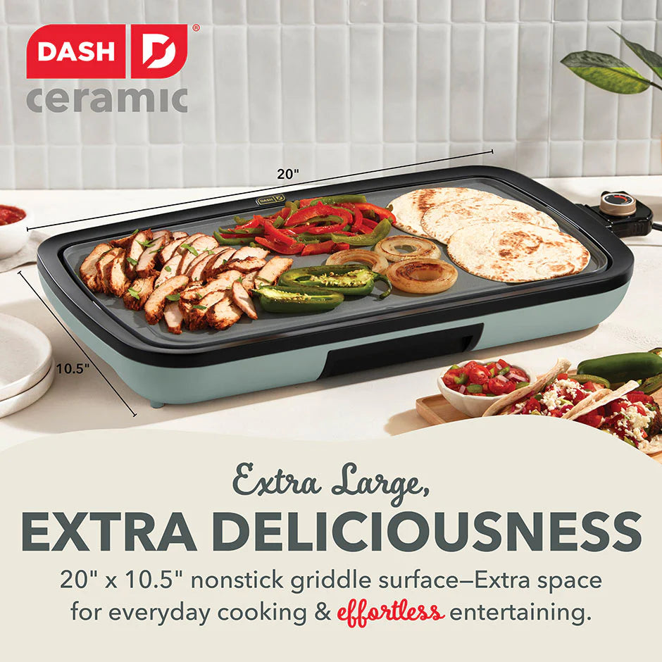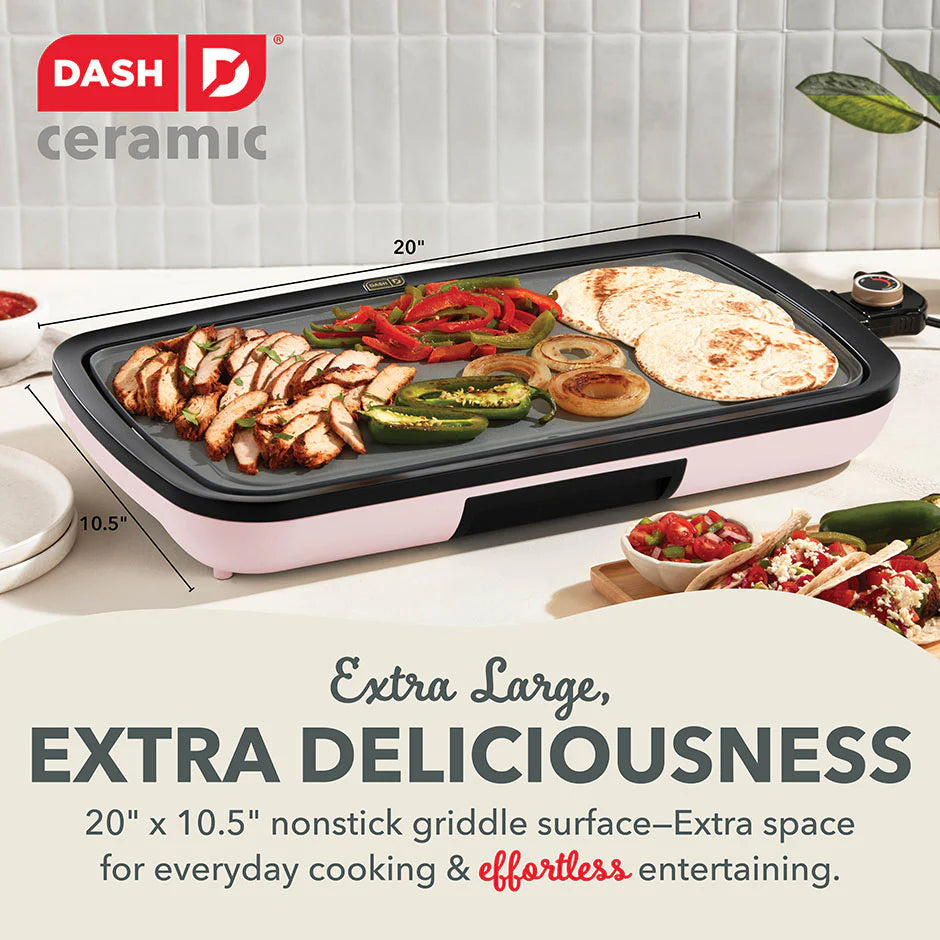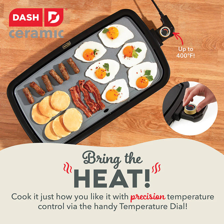 Big family meals are easier than ever with a griddle help from Dash! Extra large for extra deliciousness, the Dash Ceramic Everyday Griddle features a 20x10.5” cooking surface perfect for everything from breakfast to burgers. Bring the heat and cook it just how you like it with precision temperature control via the handy Temperature Dial. The cooking surface heats and cooks quickly and evenly—no more hot spots thanks to intuitive placement of the Griddle’s heating element. Laboratory-tested and FDA-approved to be food-safe, our advanced Safe Ceramic Nonstick coating boasts our easiest food release yet for picture-perfect dishes and quick cleanup. Easy food release means less oil is required for cooking, and the included Drip Tray channels grease away from food. The result is less grease and healthier griddling! Breakfast, lunch, or dinner, this hardworking hero is excellent for entertaining and family gatherings as well as everyday meals that require a griddle extra space.