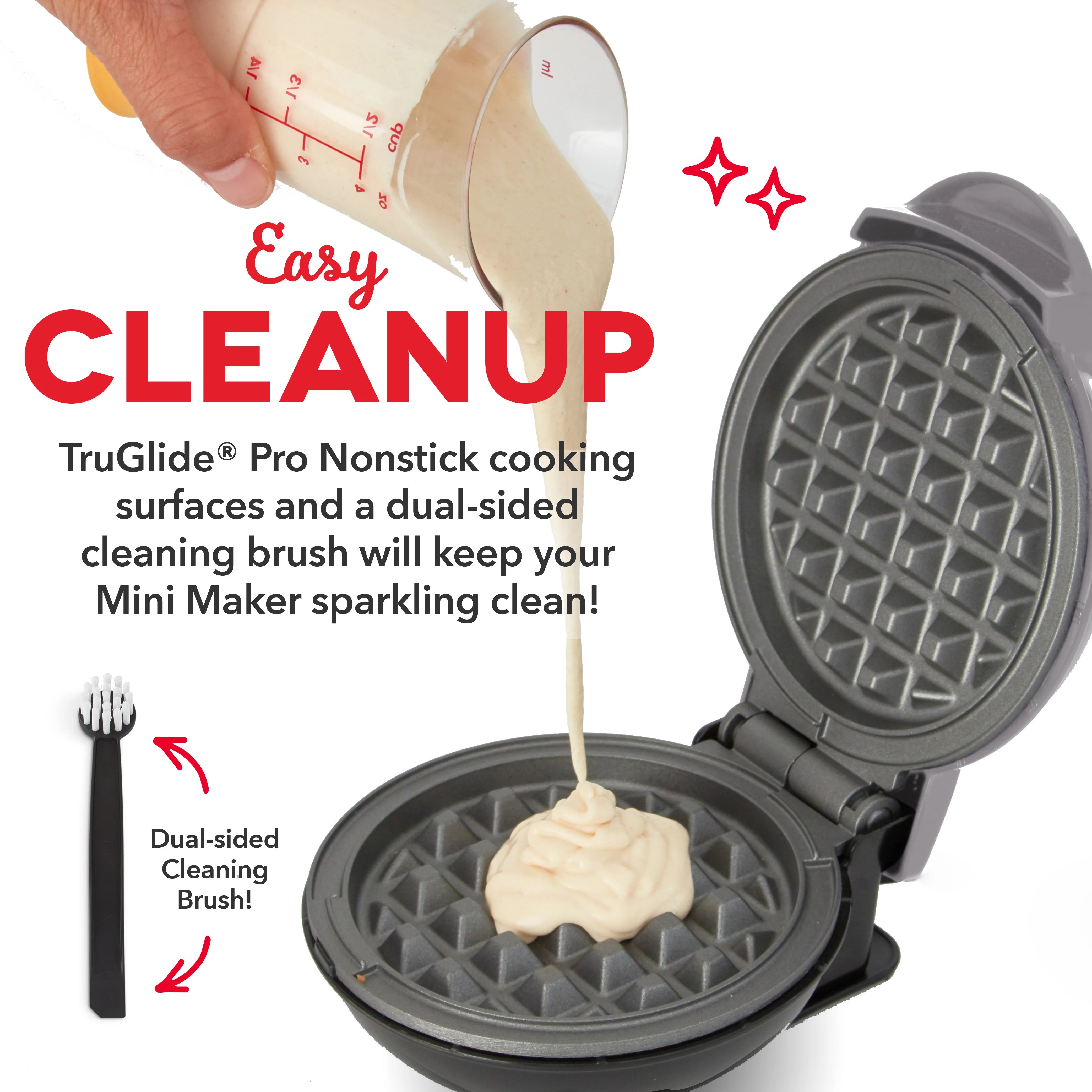 Mini is mightier than ever with the PTFE nonstick Dash Deluxe Mini Waffle Maker! Serve up your favorite 4” mini waffles from improved and extra durable TruGlide® Pro Nonstick cooking surfaces, which heat evenly for consistent, delicious results. When you’re done cooking, the dual-sided cleaning brush makes removing even burnt-on food and oil a breeze. The Deluxe Mini Waffle Maker has the conveniently small footprint of the original while featuring a cord wrap on the base for compact storage. Fun and easy to use, the Deluxe Mini Waffle Maker can be used to waffle other ingredients like hash browns, eggs and cookie dough. With the included recipe guide, you can cook the classics with confidence or branch out to try new creations in a dash!