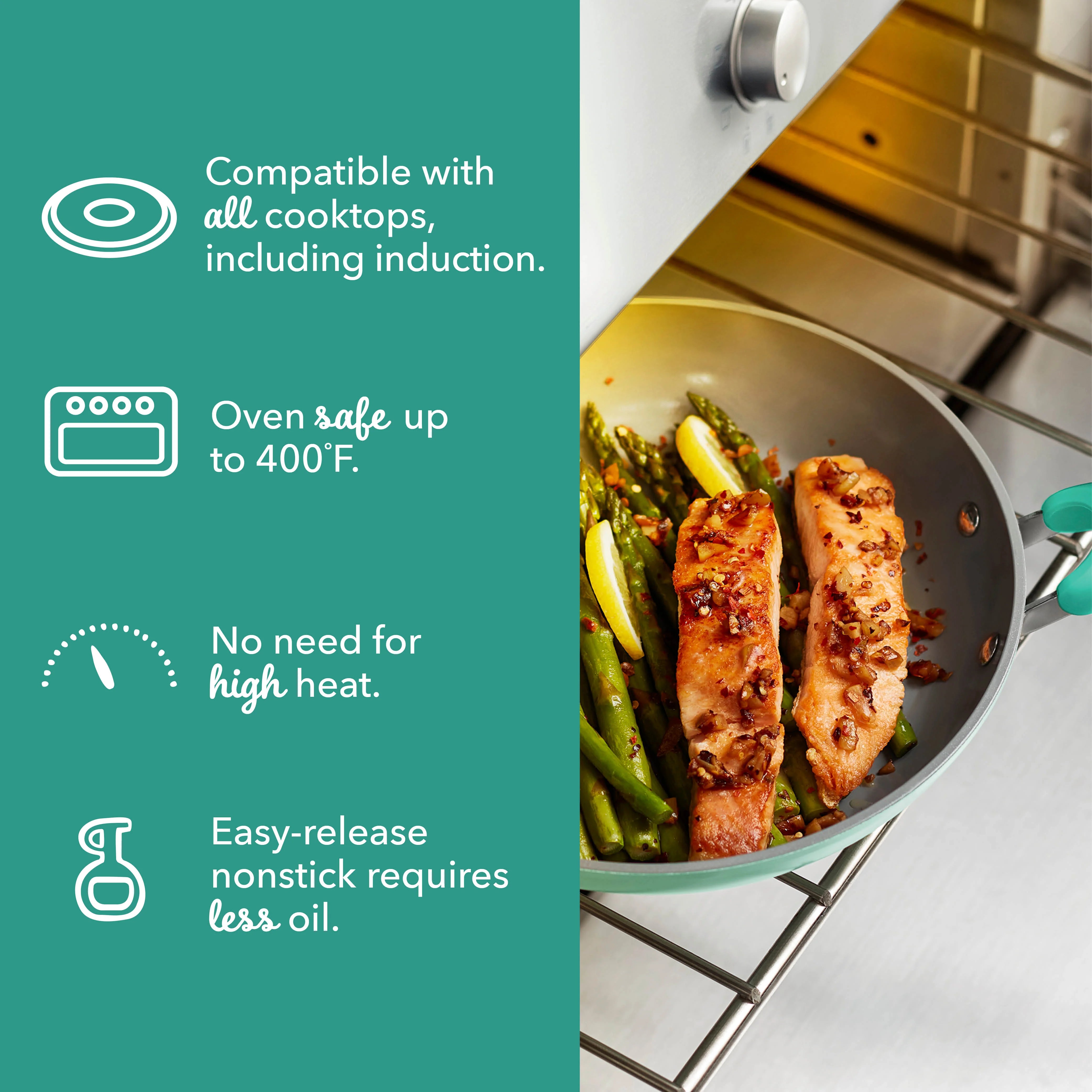 Upgrade your kitchen cookware and help prevent waste with the Dash Dream Green Recycled Aluminum 2-Piece Fry Pan Set! These pans are constructed with 100% recycled aluminum bodies, and 71% of the total product is made out of recycled materials, which prevents waste and helps the environment. Each pan is induction compatible and features a thick aluminum construction that maximizes heat distribution and retention, as well as our CleanCoating™ Safe Ceramic Nonstick coating. Stainless steel handles are wrapped in silicone and designed with comfort in mind, and the set includes four bamboo utensils that are easy to use with the cookware. Includes one 8” and one 10” fry pan, perfect for cooking smaller or larger meals!