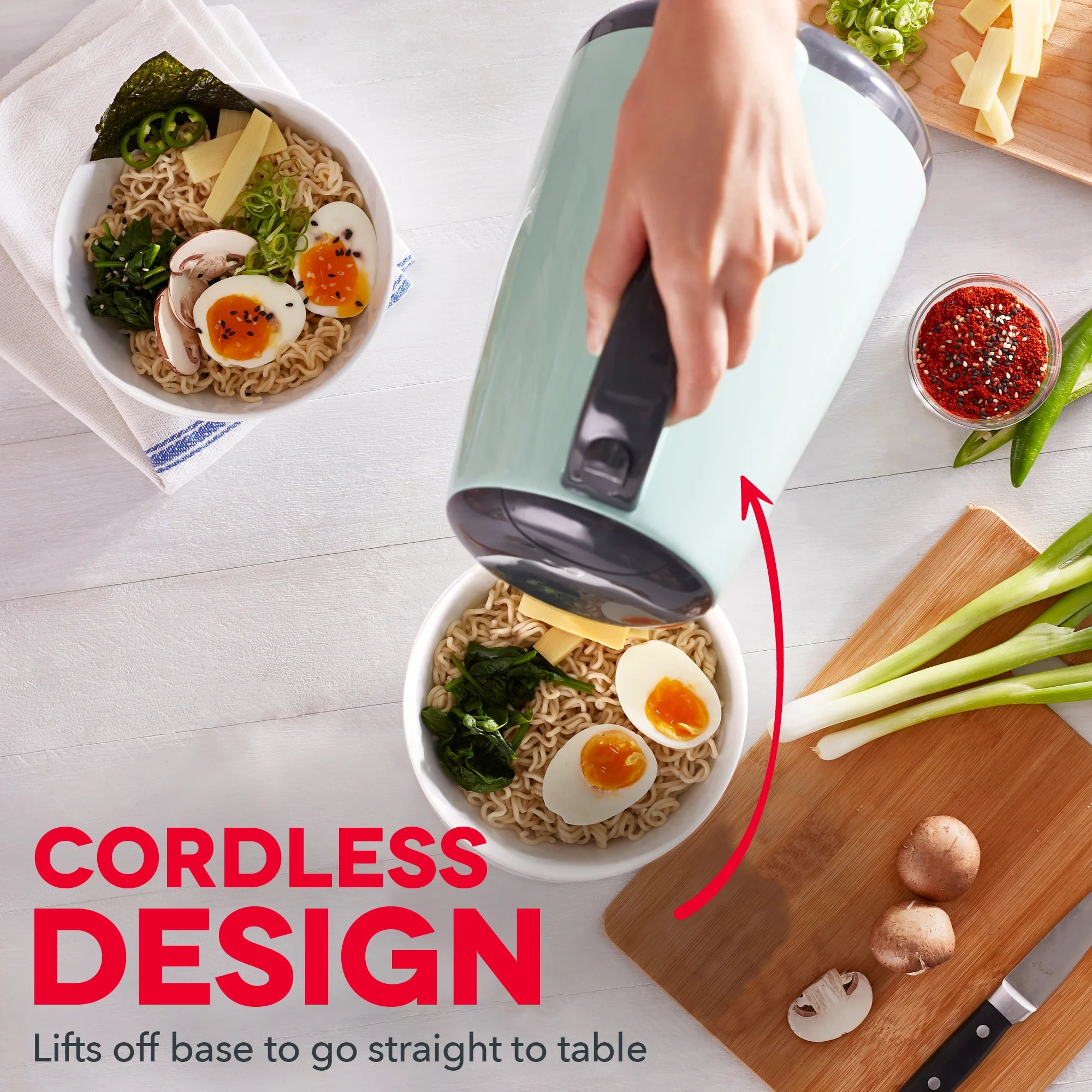 Whether preparing your morning coffee or serving tea for friends, the Dash Easy Kettle boils water quickly and efficiently. The Dash Easy Kettle lifts right off its base and features a cool-touch handle for safe transport from kitchen to table. With 1-touch power, you can boil water with just a single button, and dry boil protection shuts down the kettle when nearly empty. This is the perfect appliance for the office and can be used to quickly prepare water for oatmeal, ramen, and more!
