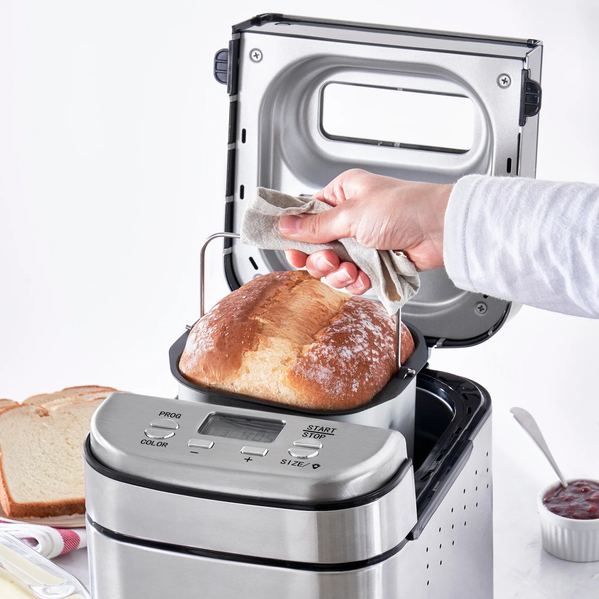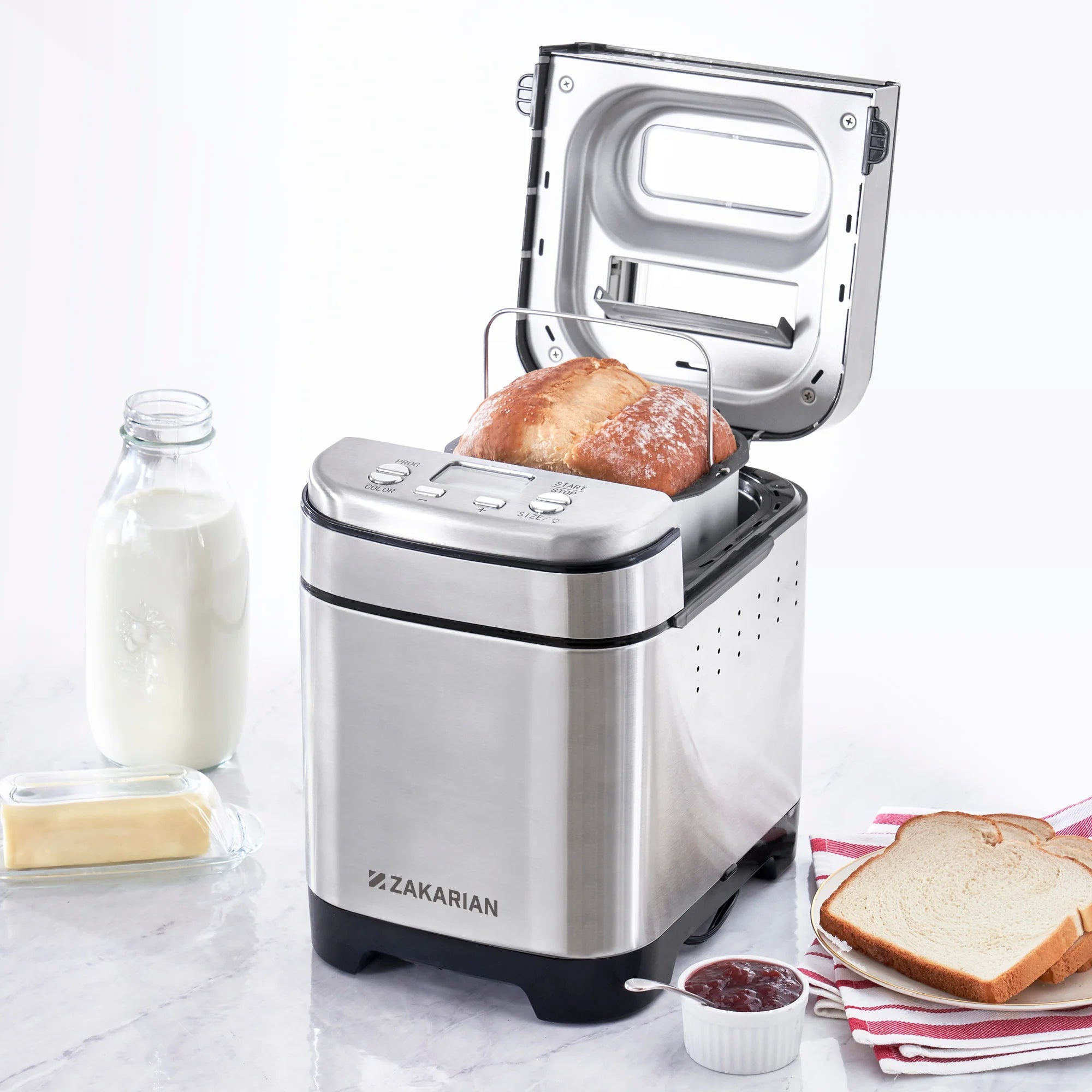 Bake fresh, traditional and artisanal loaves at home with the PTFE nonstick Dash 1.5lb Everyday Bread Maker! This Bread Maker streamlines the process of baking bread at home, kneading dough, timing the rise, and baking all in a single appliance. Twelve pre-programmed baking modes allow you to create an impressive range of breads with the push of a button, including French, Whole-Wheat, and Gluten-Free varieties. The automatic dispenser for fruits, nuts, and fillings gives you even more options for customization. This sleek and compact bread maker comes in three colors, all with an easy-to-clean stainless steel exterior. Use the delay timer for up to 13 hours to ensure your bread comes out fresh and hot right when you want it.