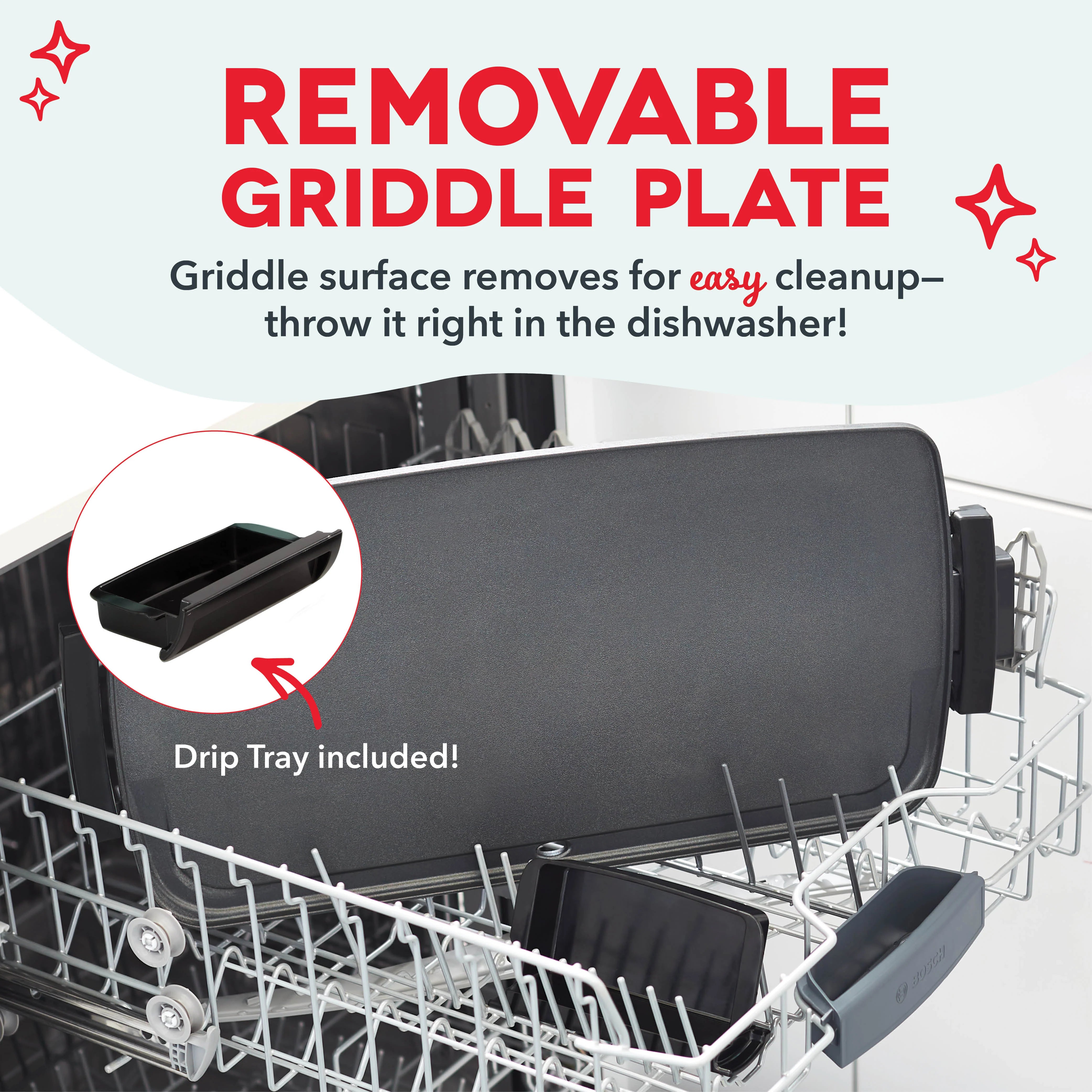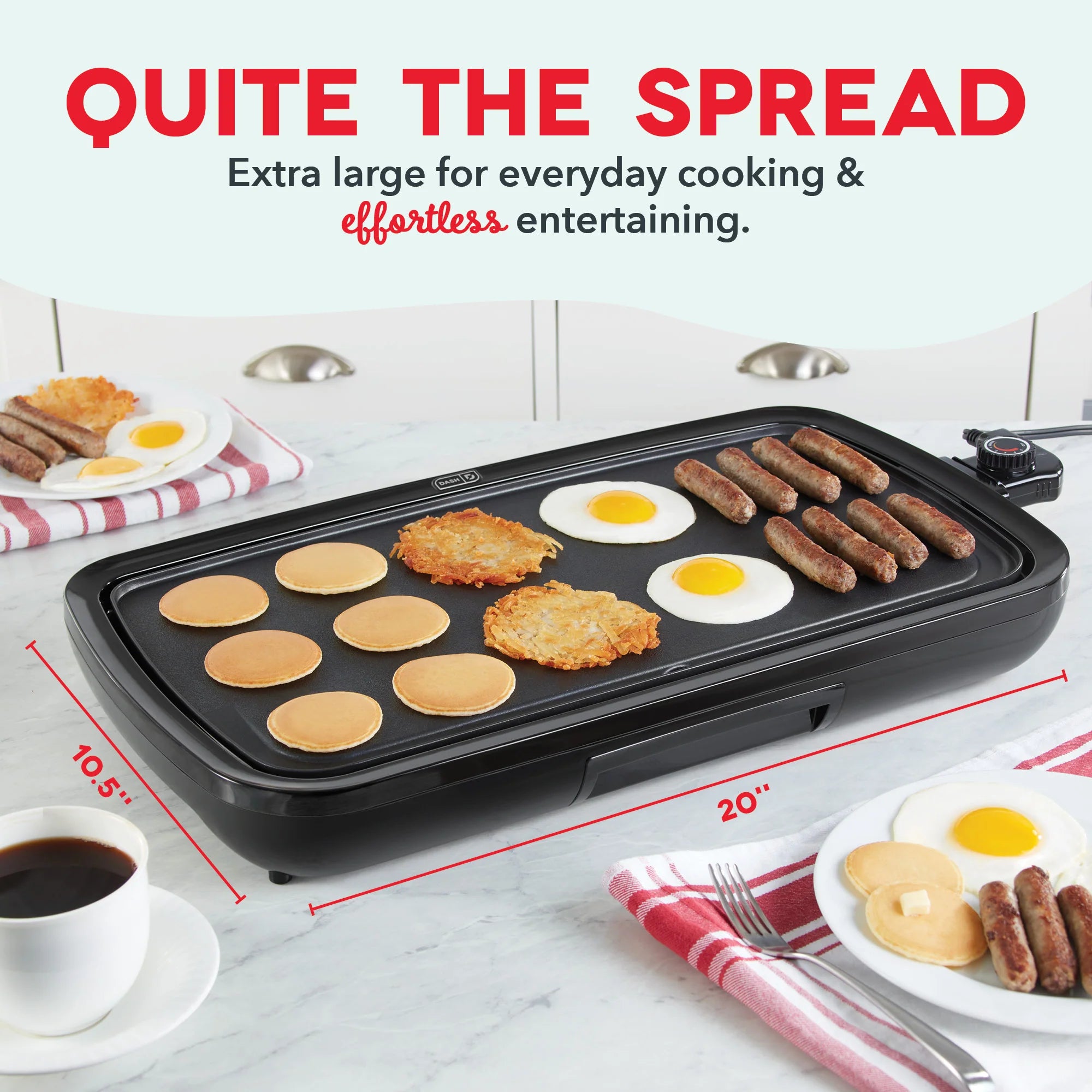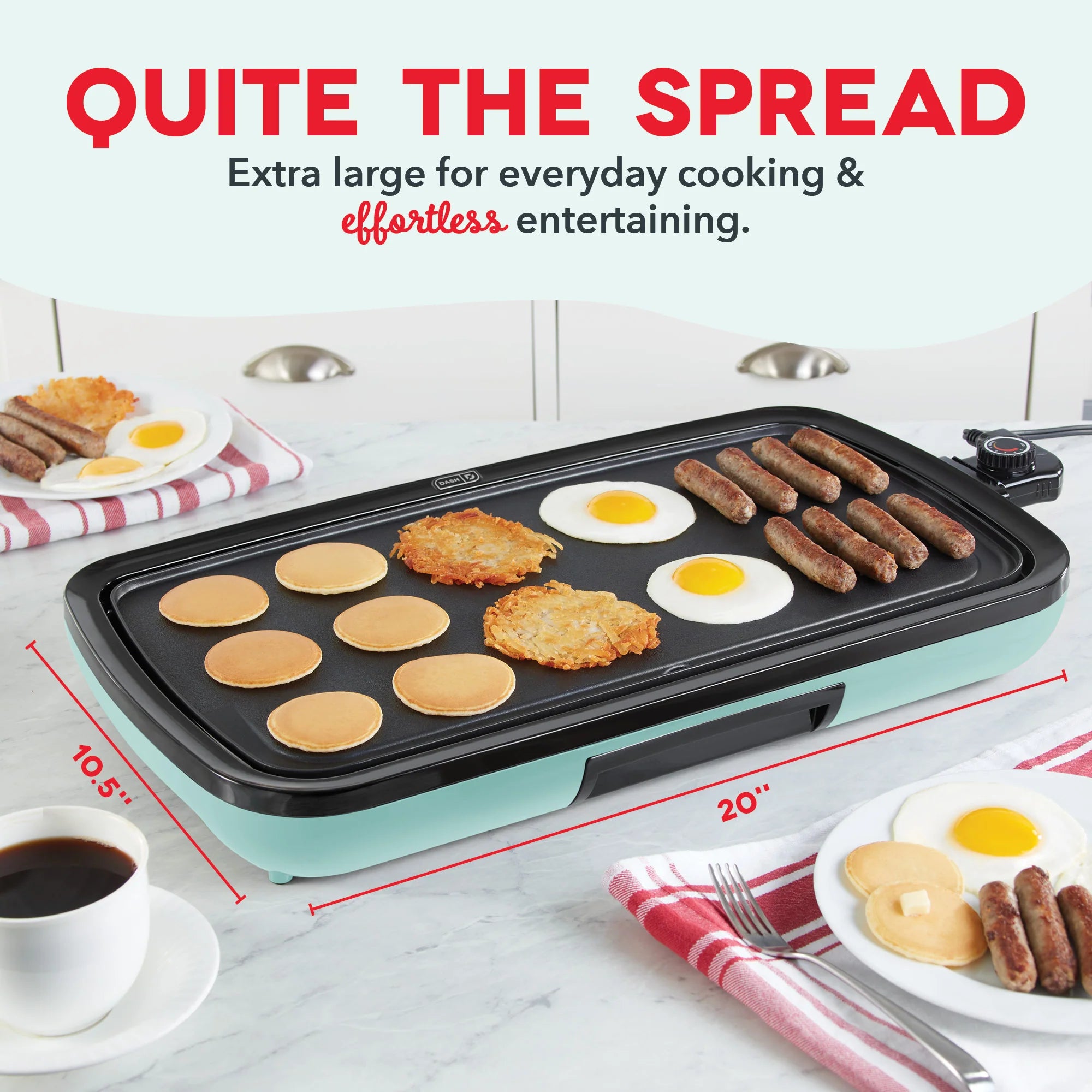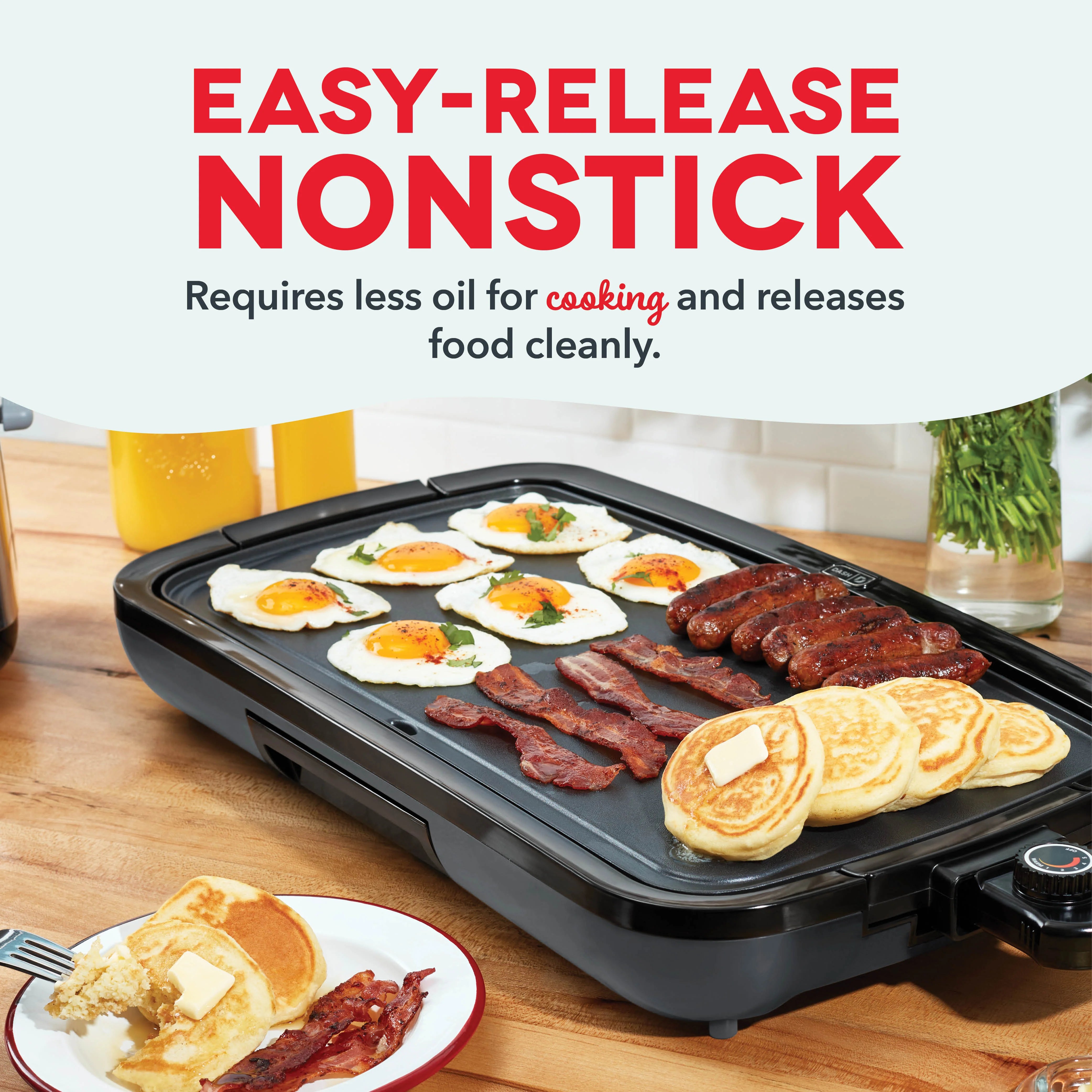 Big family meals are easier than ever with a griddle help from Dash! Extra-large for extra deliciousness, the Dash Everyday Griddle features a 20 x 10.5” cooking surface perfect for everything from breakfast to burgers. Bring the heat and cook it just how you like it with precision temperature control via the handy Temperature Dial. The cooking surface heats and cooks quickly and evenly—no more hot spots thanks to intuitive placement of the Griddle’s heating element. A superior nonstick coating releases food easier than ever meaning less oil is required for cooking, cleanup is quick and easy, and you get picture-perfect results. And the included Drip Tray channels grease away from food for healthier griddling—recipe ideas included! Breakfast, lunch, or dinner, this hardworking hero is excellent for entertaining and fabulous for family gatherings as well as everyday meals that require a griddle extra space.