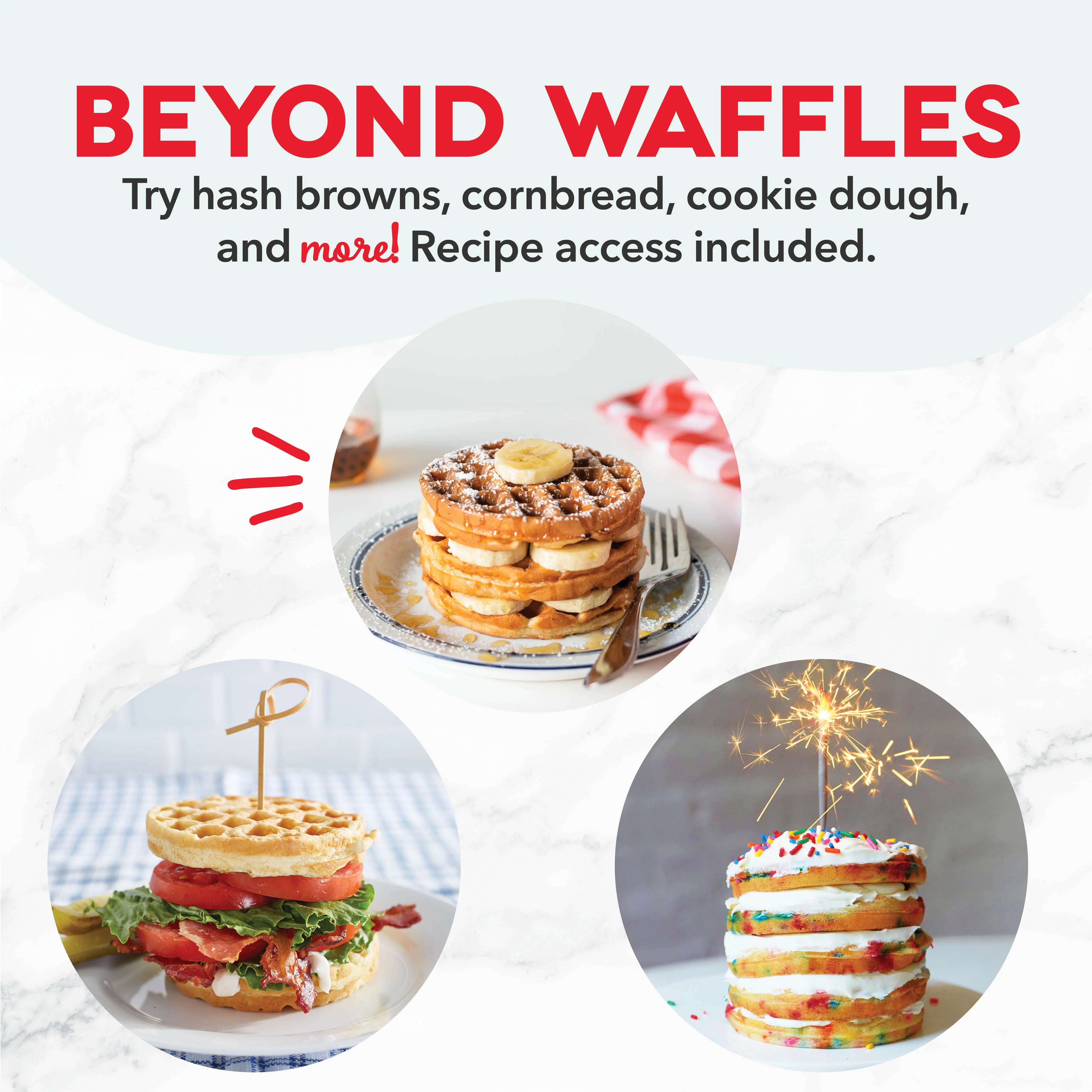Hop aboard the Better Breakfast Express! Whip up thick, crispy 8” restaurant-style waffles at home in a dash! Just plug it in to set up, then Indicator Lights will tell you when it’s time to start cooking. Dual cooking surfaces heat and cook quickly and evenly for perfect results every time, and the advanced nonstick coating makes cleanup a breeze! And go beyond waffles—use the Express Waffle Maker to cook hash browns, cornbread, cookie dough, and so much more. Handles big family breakfasts as easily as single-serve sweets—just add your favorite toppings and get ready for something waffly delicious!