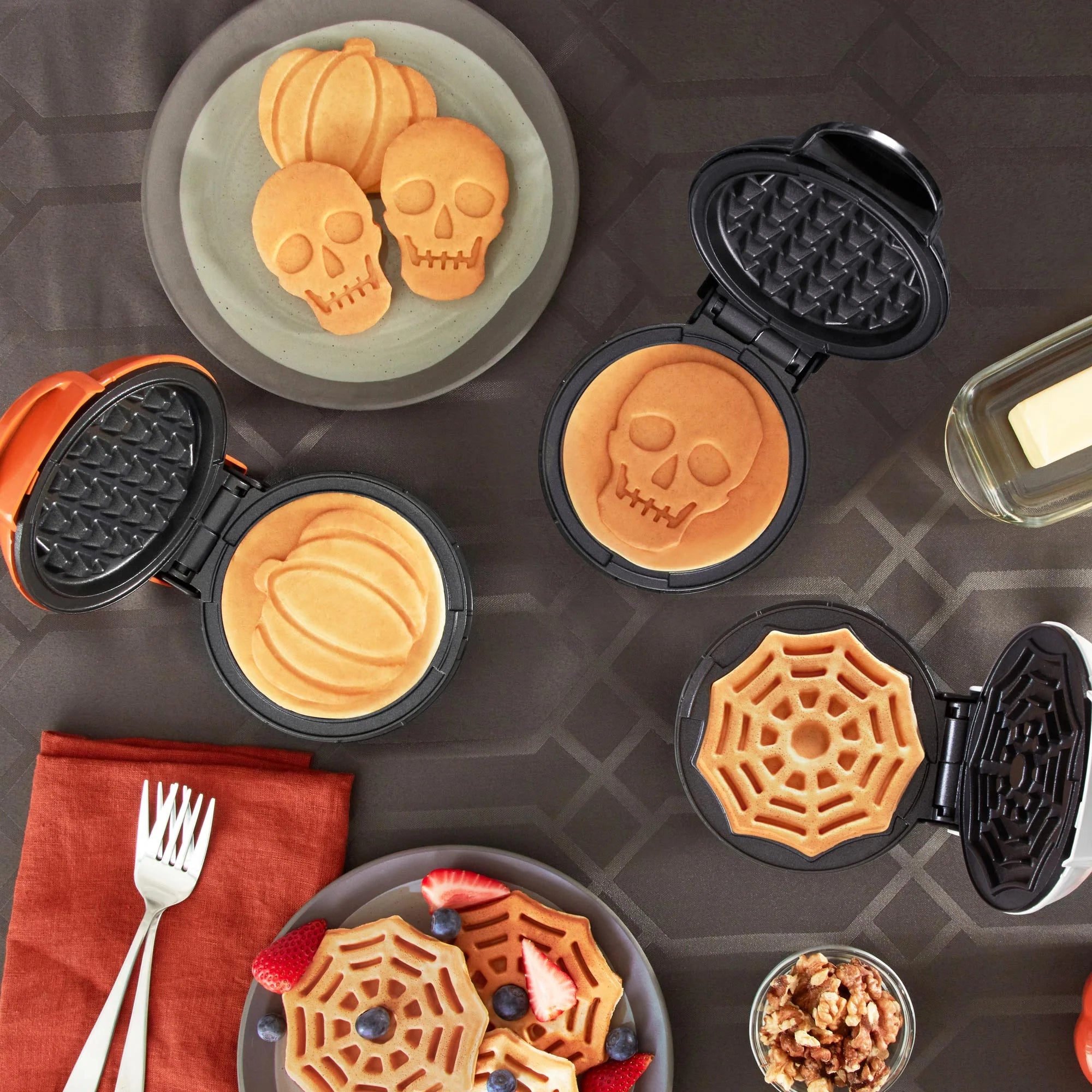 Enjoy breakfast frights throughout the season with this 3 Pack of PTFE nonstick Mini Waffle Makers! These individually-packaged minis come with three unique plates—a Skull, a Spiderweb, and a Pumpkin—that will cook treats perfect for Halloween—or any festive fall gatherings! Uniform heating cooks these 4” mini waffles to golden perfection, and the nonstick surfaces release food effortlessly and are easy to clean. Simply plug your Mini Waffle Maker in and you’ll be cooking in minutes, and the included Recipe Guide will have you making spookily-delicious treats throughout the season!