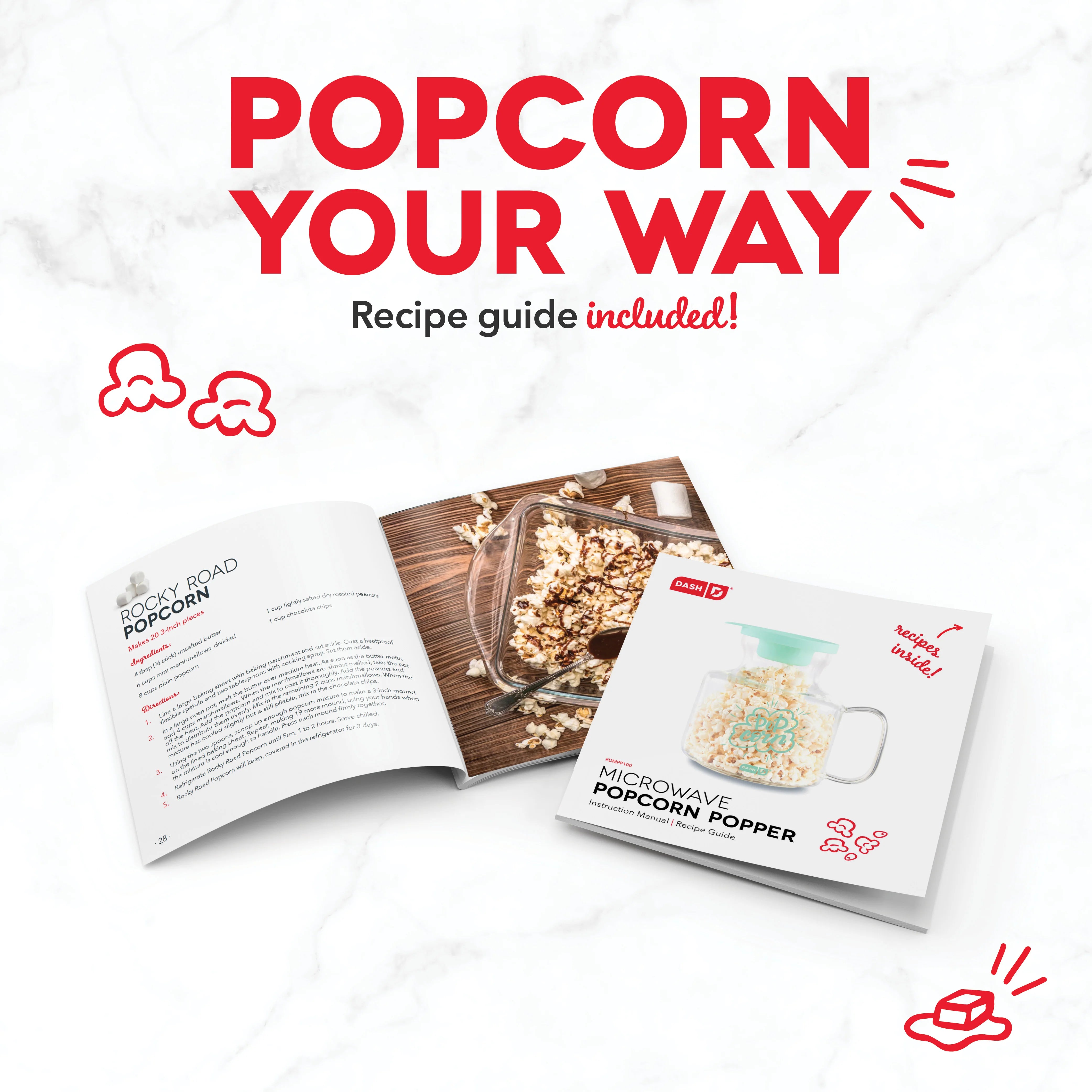 Make fresh, unprocessed popcorn in your microwave at home with the Dash Microwave Popcorn Popper! Cut out processed mystery ingredients from microwave popcorn brands and use fresh kernels in this durable glass container that cooks up to 10 cups of popcorn. The lid of the Popcorn Maker doubles as a butter melting tray that adds butter while you cook, for movie-theater-style popcorn in minutes. Use the included Recipe Guide to make delicious sweet and savory popcorn to share with family and friends!
