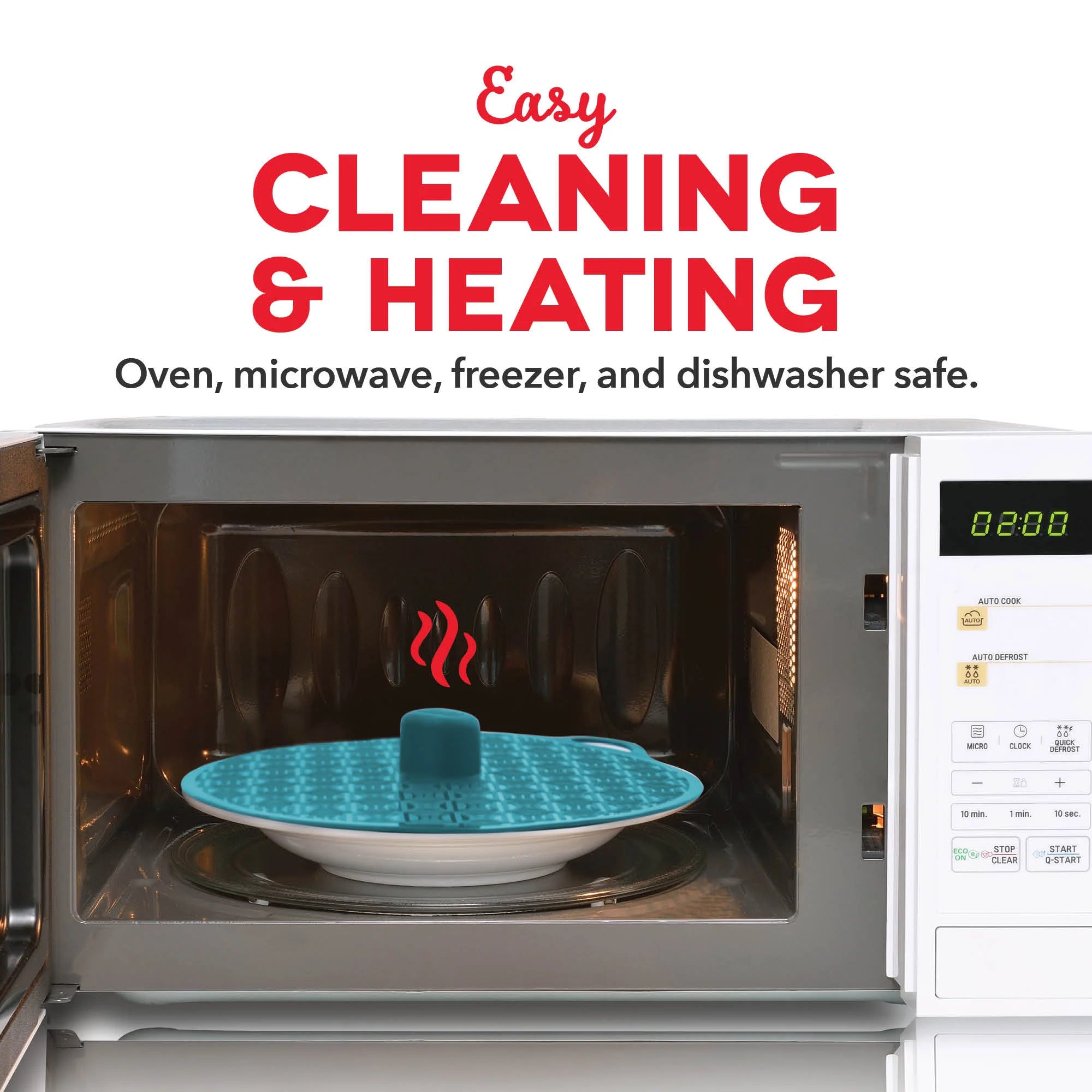 Create an airtight seal over a variety of pots, pans, and other kitchen containers with multi-tasking and durable Dash Silicone Lids. Simply place the lid on top and press down on the knob to seal! The easy-to-clean and heat-safe material is perfect for preventing splatters in the microwave as well as for covering vegetables or rice on the stove. Use a lid to insulate hot foods or to preserve the flavor and freshness of leftovers in the fridge. Reduce your use of plastic wrap and aluminum foil with this eco-friendly, BPA-free alternative that also conserves storage space—lids easily stack or hang from the attached hook when not in use.