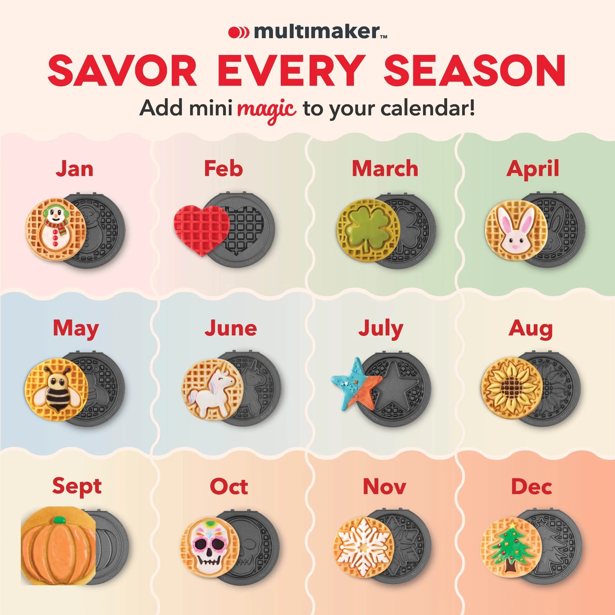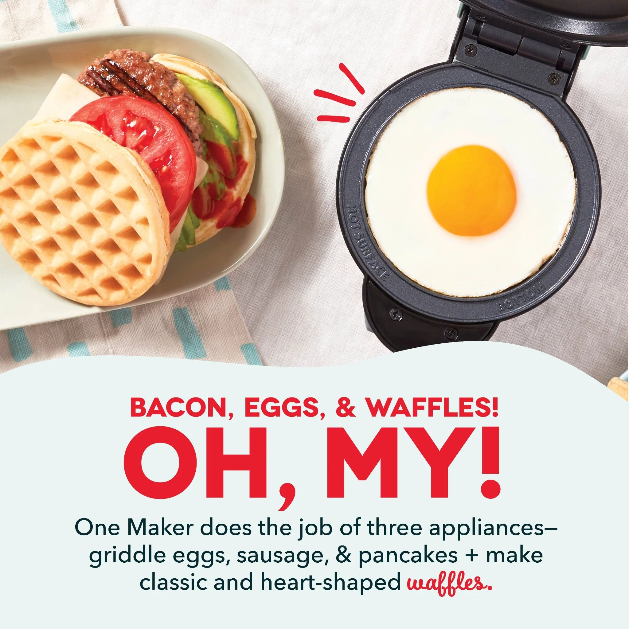 One Mini Maker to rule them all! The versatile 3-in-1 Mini Maker with Removable Plates pulls triple duty. The Heart and Classic Waffle Plates make fun and festive breakfast bites while the Griddle Plate rounds out your breakfast menu with eggs and sausage, plus it’s great for burgers! Plates heat quickly and evenly while the easy-release nonstick coating produces picture-perfect creations every time. Removable Plates seamlessly pop out from the Maker and go right into the dishwasher for a no-mess cleanup, then store handily in included Storage Case. Need a little griddle inspo? Check out the included Recipe Guide meal ideas big and small. And the Maker is compatible with all of Dash’s seasonal Plate Packs for festive fun all year long!