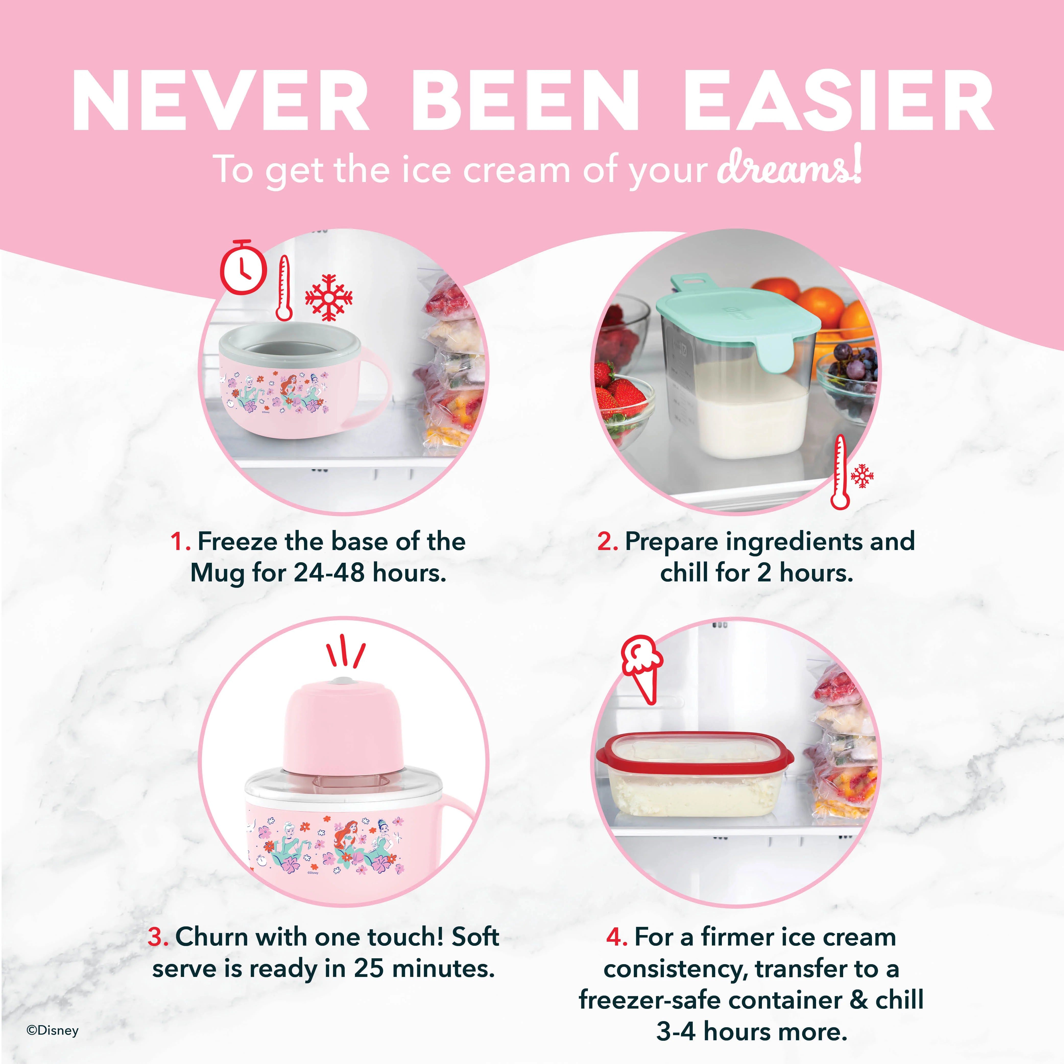 Step into a whimsical ice cream wonderland featuring the iconic Disney duo, Mickey Mouse & Minnie Mouse! The Disney | Dash My Mug Ice Cream Maker Bundle is the perfect partner for whipping up delightful frozen treats right at home! With its perfectly portioned half-pint capacity, you can create single servings of your favorite flavors. With two Mugs, you can make two flavors at a time, one for you and one to share! And it’s ice & easy to use: Simply freeze each My Mug 24-48 hours before use, chill your favorite ingredients, and churn with just one touch. In 25 minutes, you’ll have homemade ice cream, gelato, sorbet, & frozen yogurt. Then grab a spoon to eat right out of the Mugs! Everything disassembles easily for quick cleanup then store everything right in the Mugs thanks to our clever SmartStore™ nesting design. To maximize the frozen fun, check out the included Recipe Guide for keto-friendly and dairy-free ideas plus classics like vanilla & rocky road.