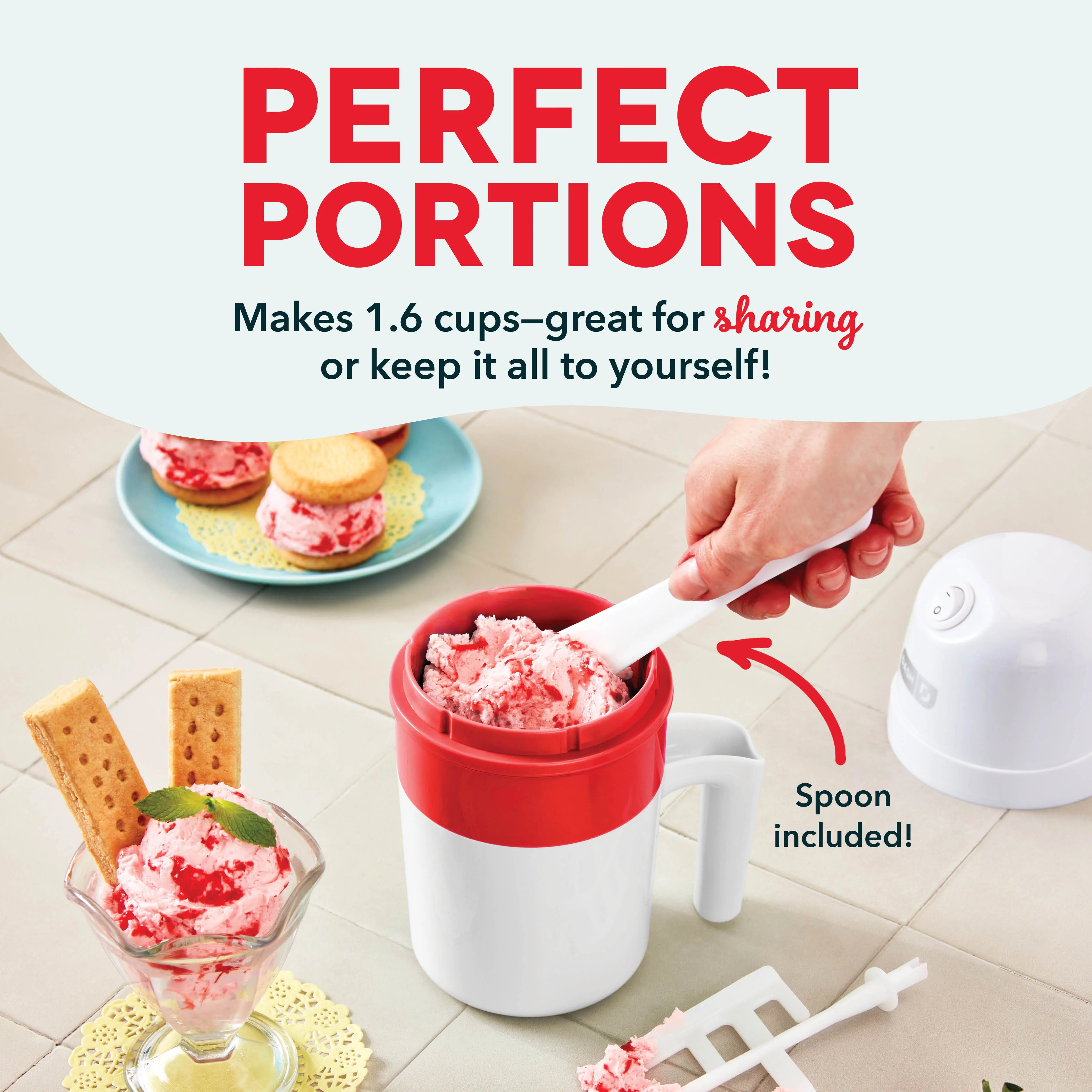 The Dash My Pint Ice Cream Maker makes up to 1.6 cups of homemade ice cream in minutes!