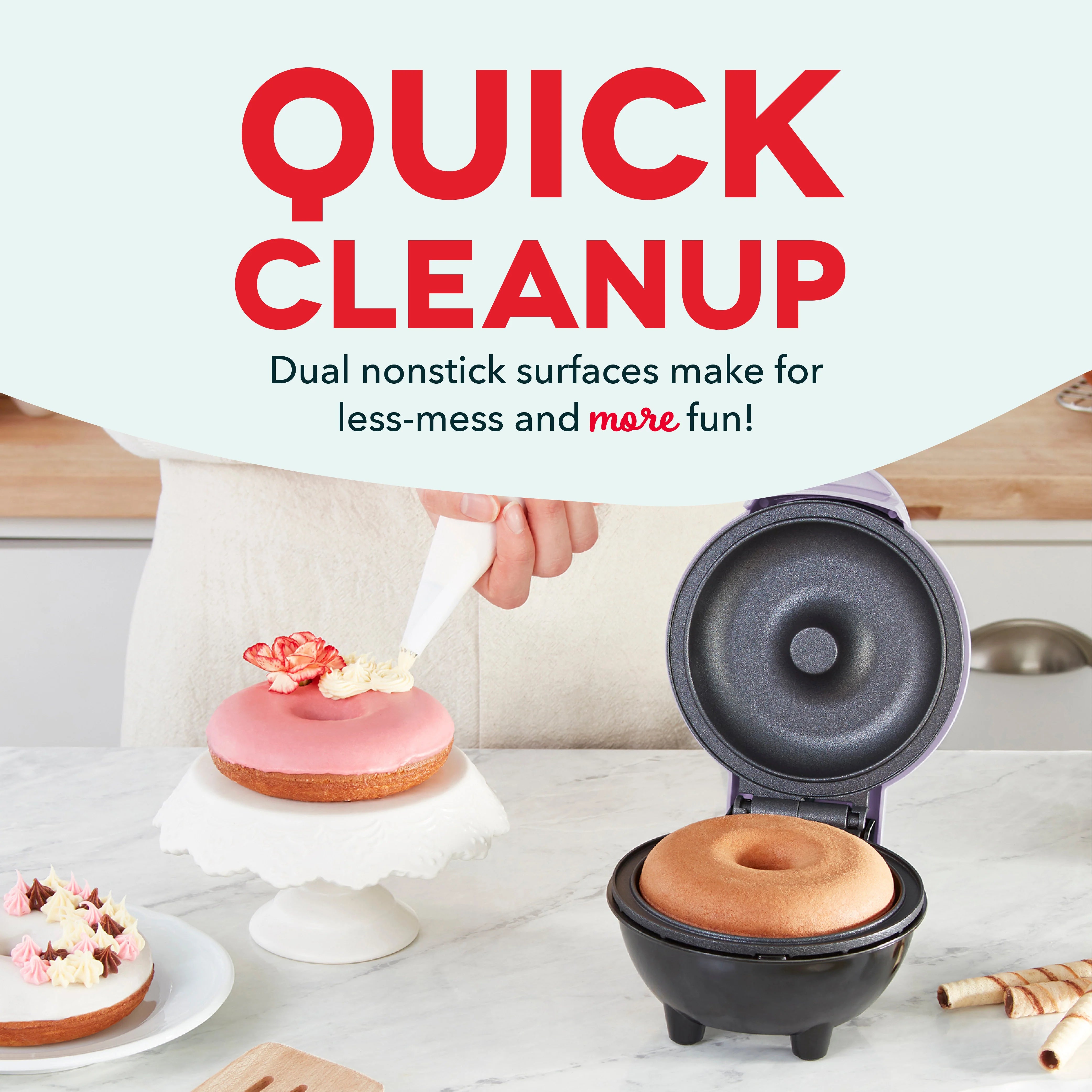 Enjoy delicious homemade donuts with the Dash Personal Donut Maker. Make a cute and personalized donut-for-one or whip out your baker’s hat for a fun-filled project the whole family will love! Just plug it in, add your choice of batter, and you’re ready to bake! Dual surfaces heat evenly for consistent, scrumptious results while the nonstick coating makes cleanup a breeze. Get creative with frosting, glazes, and decorations. The Dash Recipe Guide is included for added inspiration.