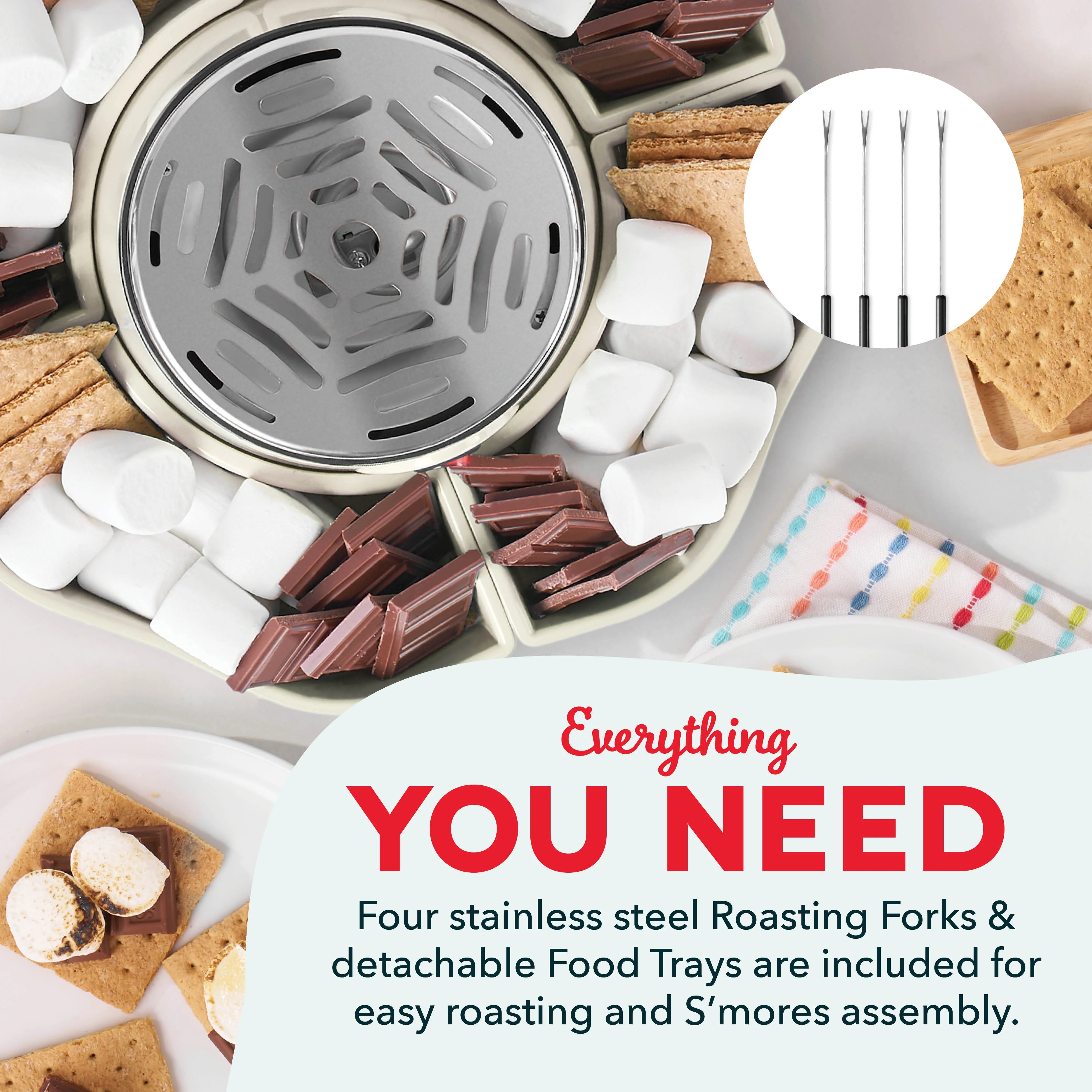 Experience the magic of campfire nights right in your kitchen with the Dash S’Mores Maker! This electric, smokeless heater allows you to easily roast marshmallows and create delicious s'mores without needing an outdoor fire. Setting it up for parties and family gatherings is a breeze. Whether you’re glamping with friends or enjoying a cozy family night, you can quickly bring s'mores to the party for a delightful treat. The Dash S’Mores Maker features four detachable Serving Trays that keep all your ingredients organized for easy snacking. The included stainless steel Roasting Forks ensure safe and fun roasting for everyone. Simply hold the Roasting Fork over the heating element and watch as the marshmallows roast, turning slowly for that perfect caramelization. Once the indoor campfire is done, disassembly is simple, making cleanup quick and easy. The Dash S’Mores Maker turns every gathering into a delightful celebration of flavor and connection. Check out the included Recipe Guide to unleash even s'more fun and make your home the sweetest place to be!