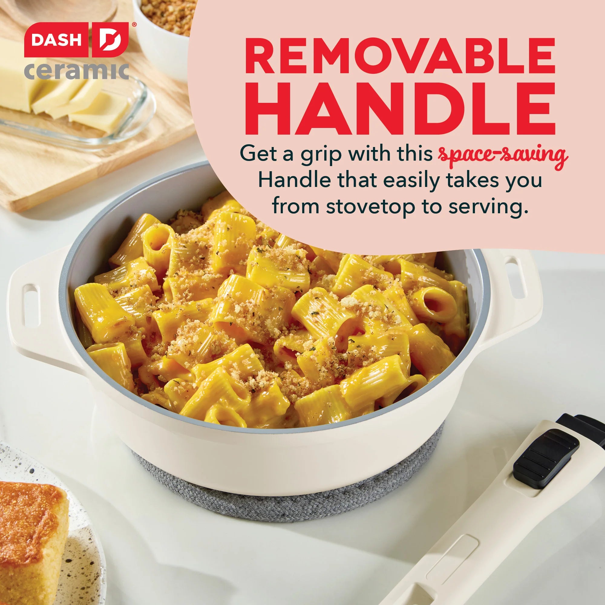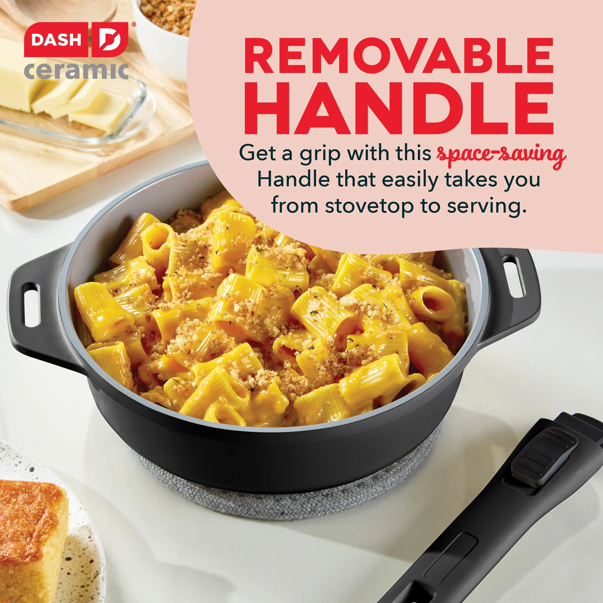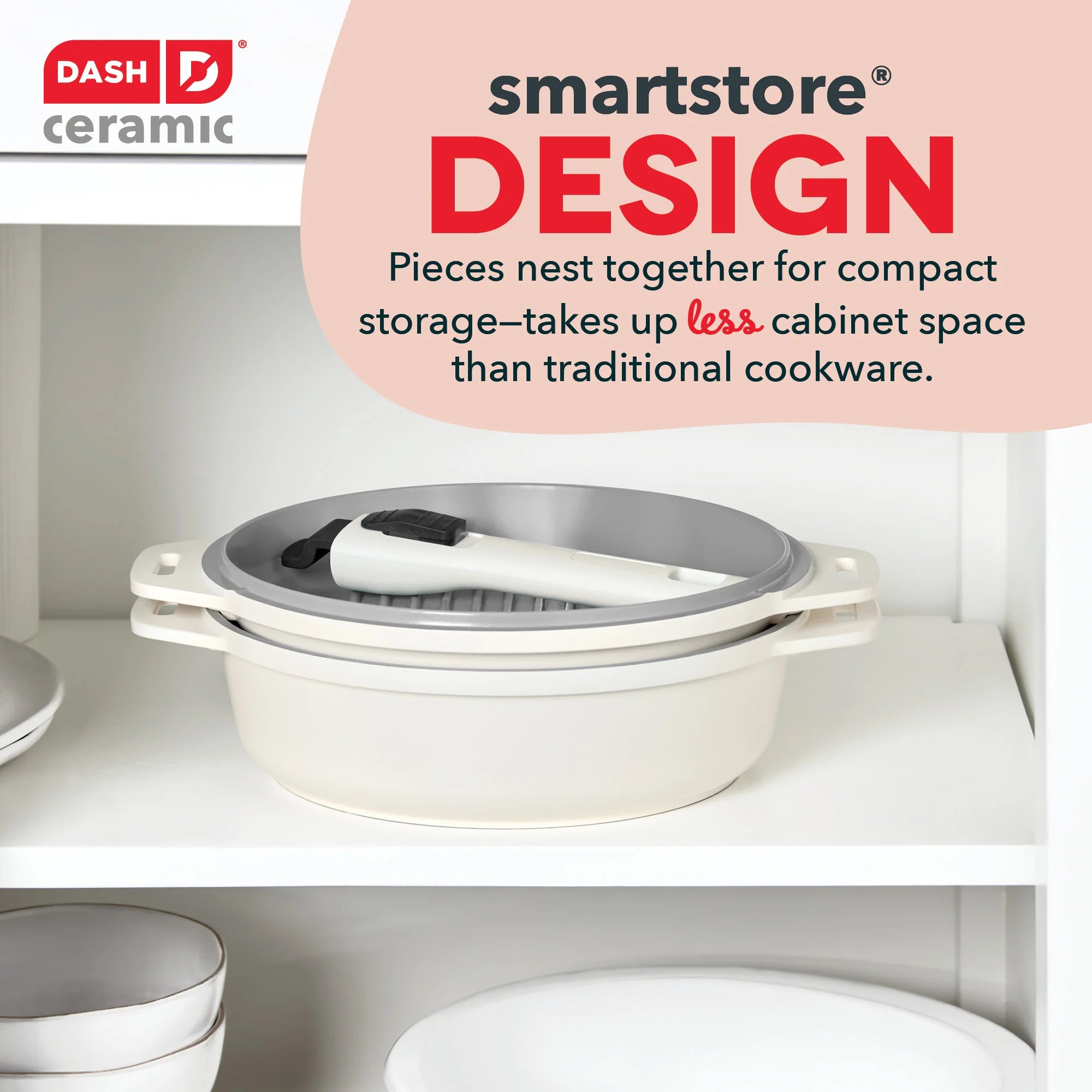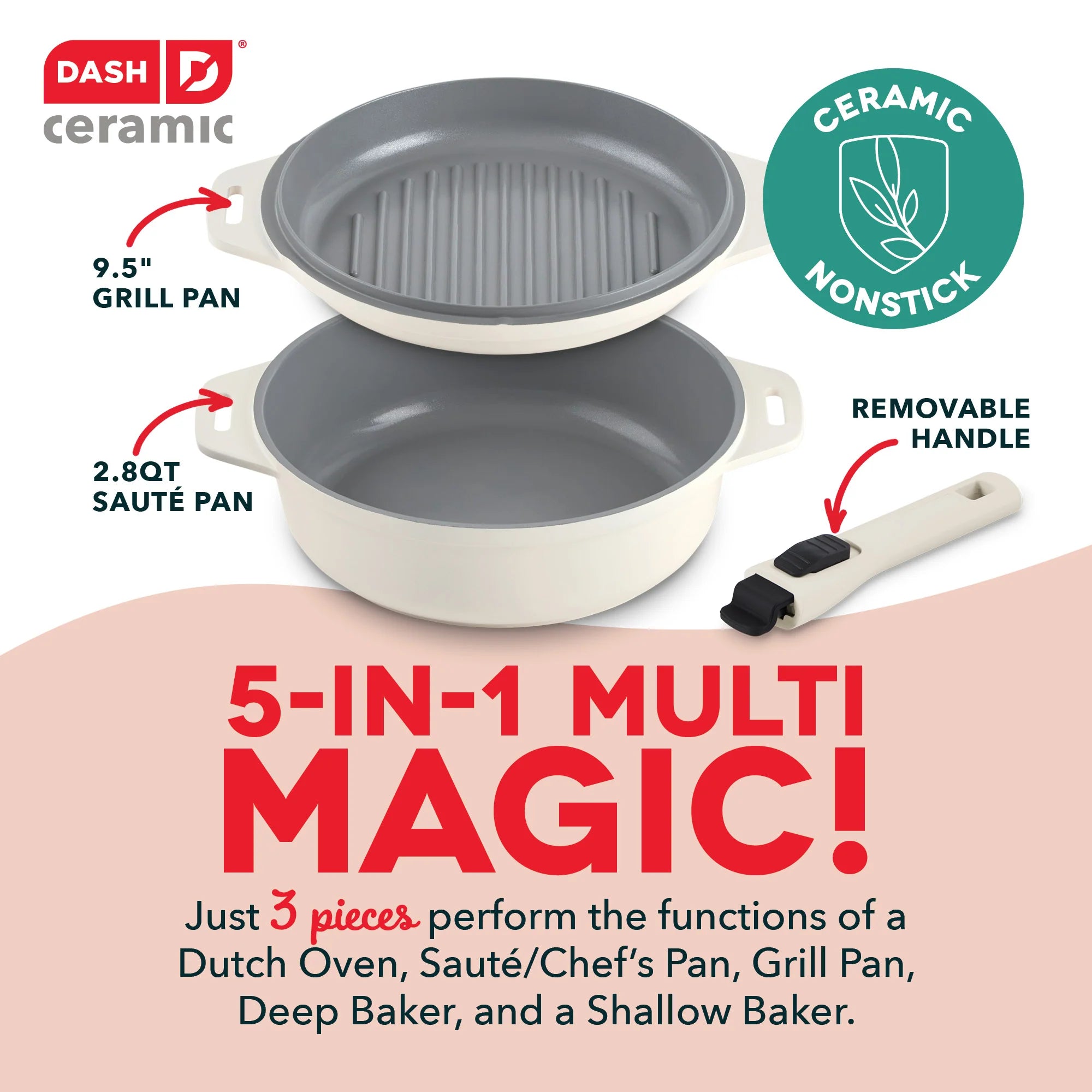 It’s time to cook healthier and store smarter! The SmartStore™ 5-in-1 Multipurpose Nesting Cookware Set does the job of 5 cookware pieces using just 3 nesting pieces. Use the Grill Pan for indoor grilling all year round and use the Sauté Pan for searing burgers or frying chicken. For added versatility, use the Grill Pan as a Lid to transform the Sauté Pan into a Dutch Oven. Then attach the Removable Handle to the Sauté Pan to convert it into the ultimate Chef’s Pan for superior searing. The Grill Pan doubles as a shallow Bake Pan while the Sauté Pan also works as a deep Bake Pan, both oven-safe up to 400°F. Compatible with all cooktops, these pans effortlessly move from stove to oven to table. Both pans boast the CleanCoating™ Ceramic Nonstick coating, ensuring mouthwatering dishes slide right off the pan with minimal oil needed for cooking. This SmartStore™ set is constructed with recycled cast aluminum, so you can cook sustainably and enjoy lightweight maneuverability. When you’re done dishing out delicious dishes, simply nest the pieces together to store and reclaim your cabinet space. Say goodbye to cluttered cabinets and hello to healthier, effortless cooking!