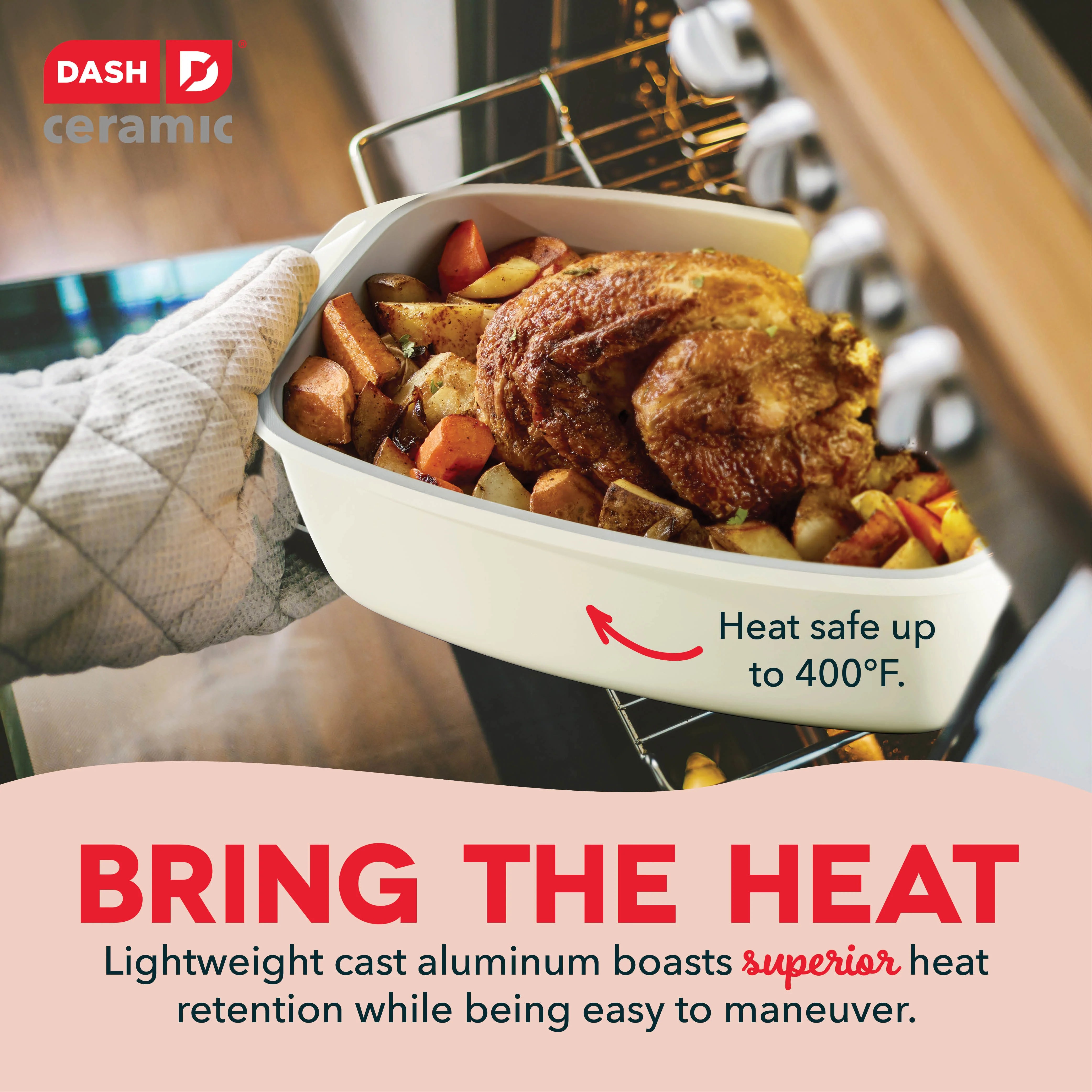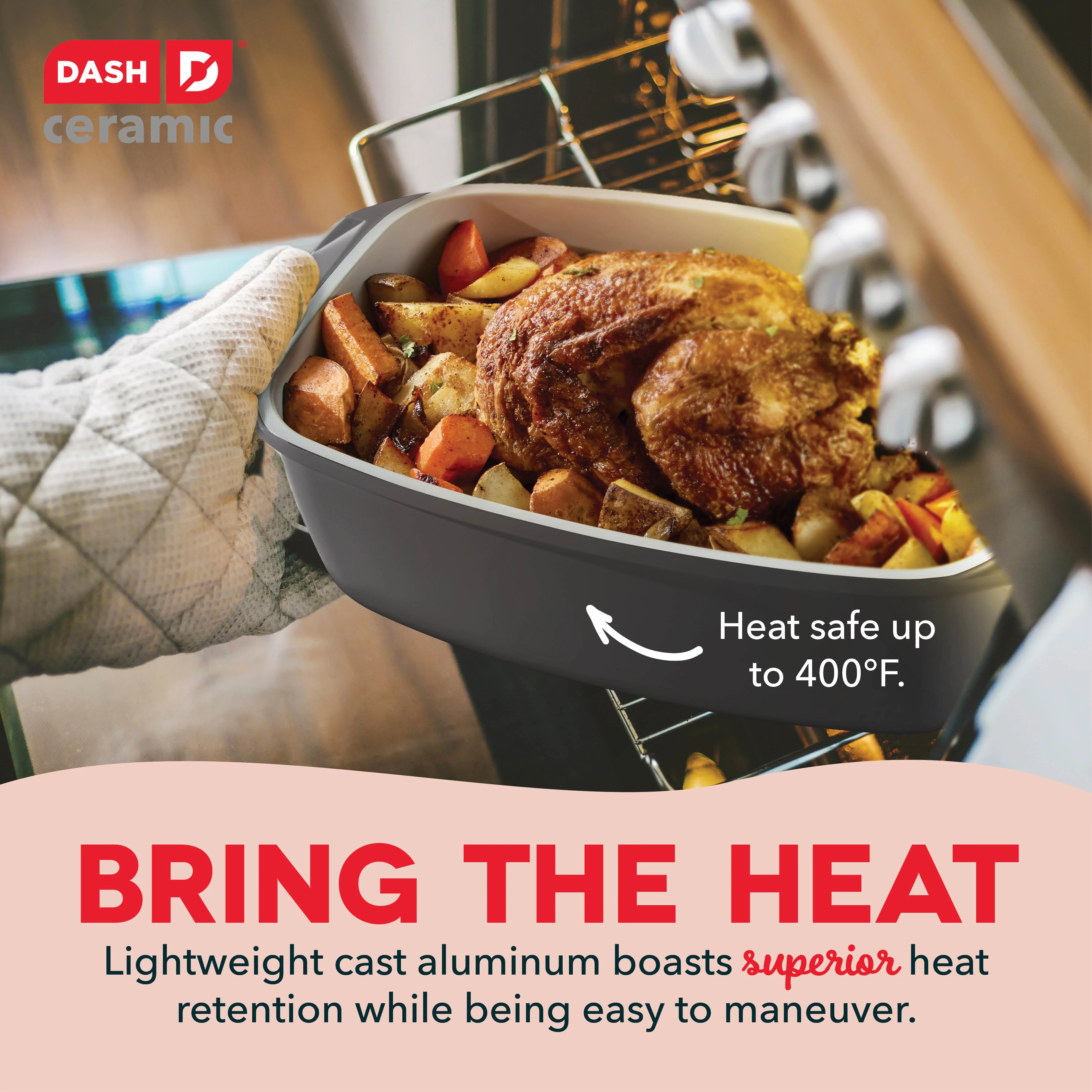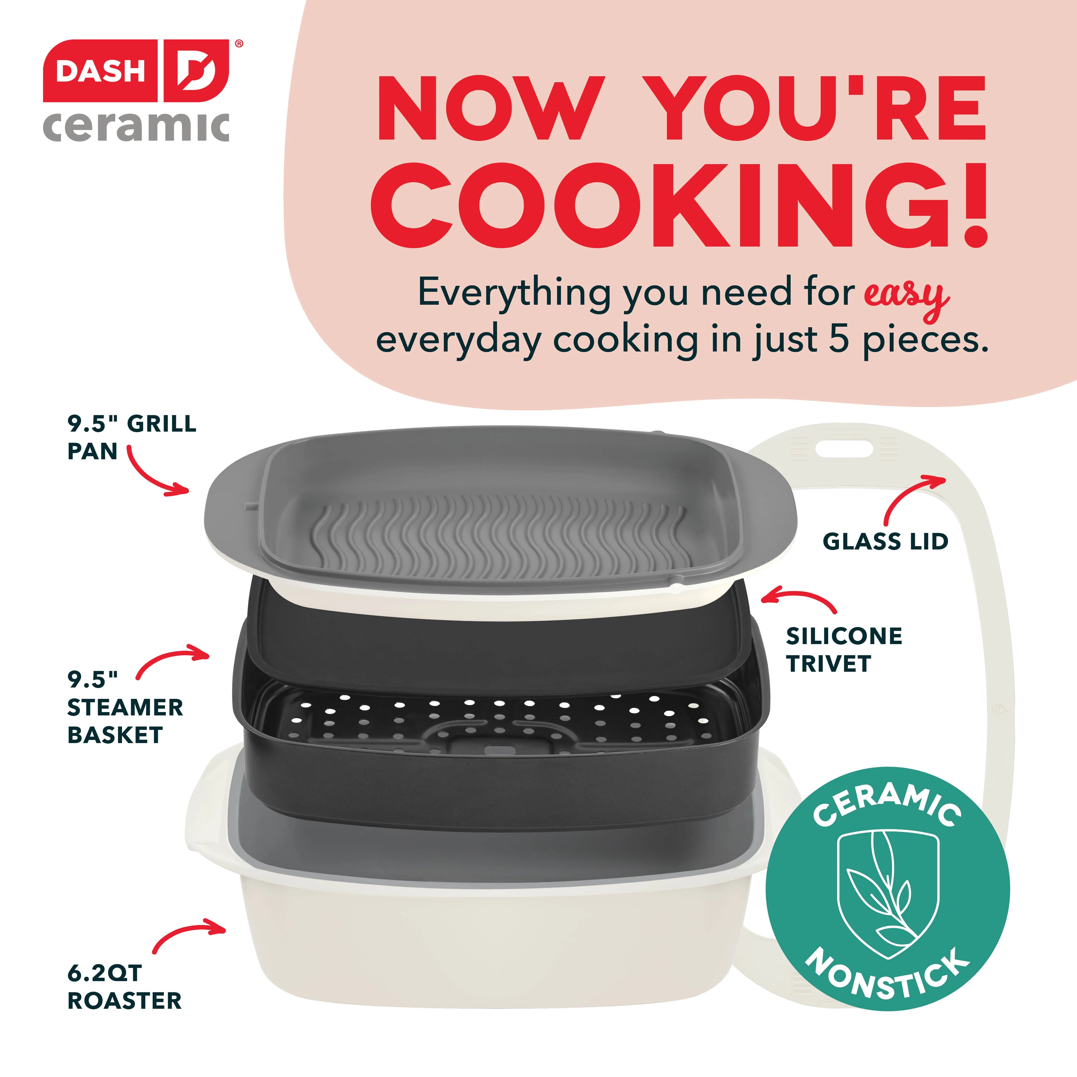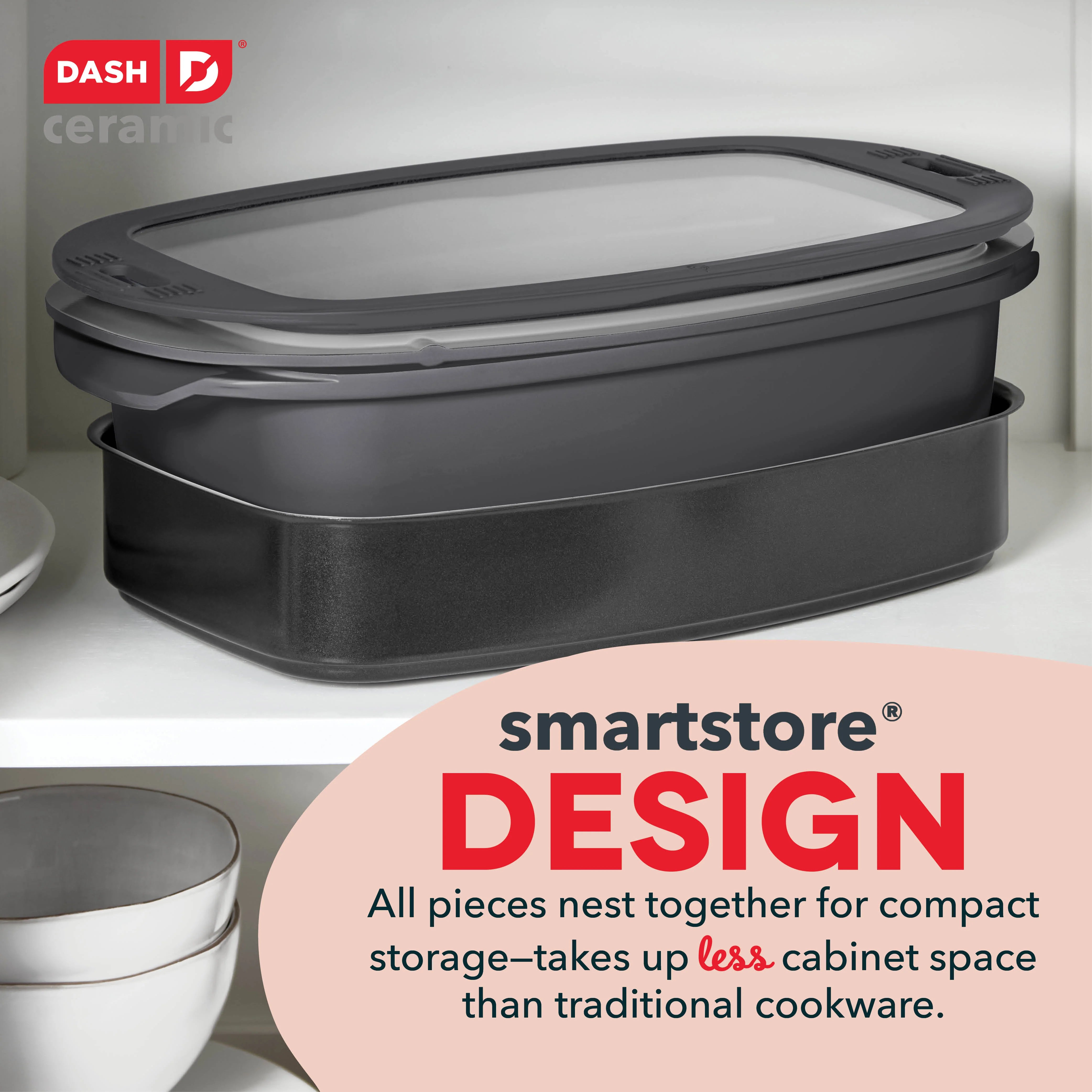 It’s time to cook healthier and store smarter! Each piece in the SmartStore® 7-in-1 Multipurpose Nesting Cookware + Steamer Set is uniquely designed to pull double duty for endless meal possibilities while taking up minimal storage space. Use the 6.2QT Roaster for baking, braising, and roasting everything from succulent beef to tender chicken. Then top it with the Grill Pan to create the ultimate Dutch Oven. For even more versatility, pair it with the Steamer Basket to easily steam vegetables, seafood, and dumplings to perfection. Line the Steamer Basket with the oven-safe Silicone Trivet to create a shallow Bake Pan for your favorite casseroles and more. The Grill Pan makes year-round indoor grilling a breeze and it also functions as Lid for the Roasting Pan to seal in heat and flavor while cooking. When dinner is done, the Glass Lid is great for storing leftovers. Lightweight and durable, the cast aluminum construction heats and cooks quickly and evenly while the CleanCoating™ Ceramic Nonstick releases food easily requiring minimal oil for healthier cooking. This SmartStore® set is constructed with recycled cast aluminum, so you can cook sustainably and enjoy lightweight maneuverability. When the dinner party is over, simply nest the pieces together to store and reclaim your cabinet space. Healthier, effortless cooking is now on the menu!