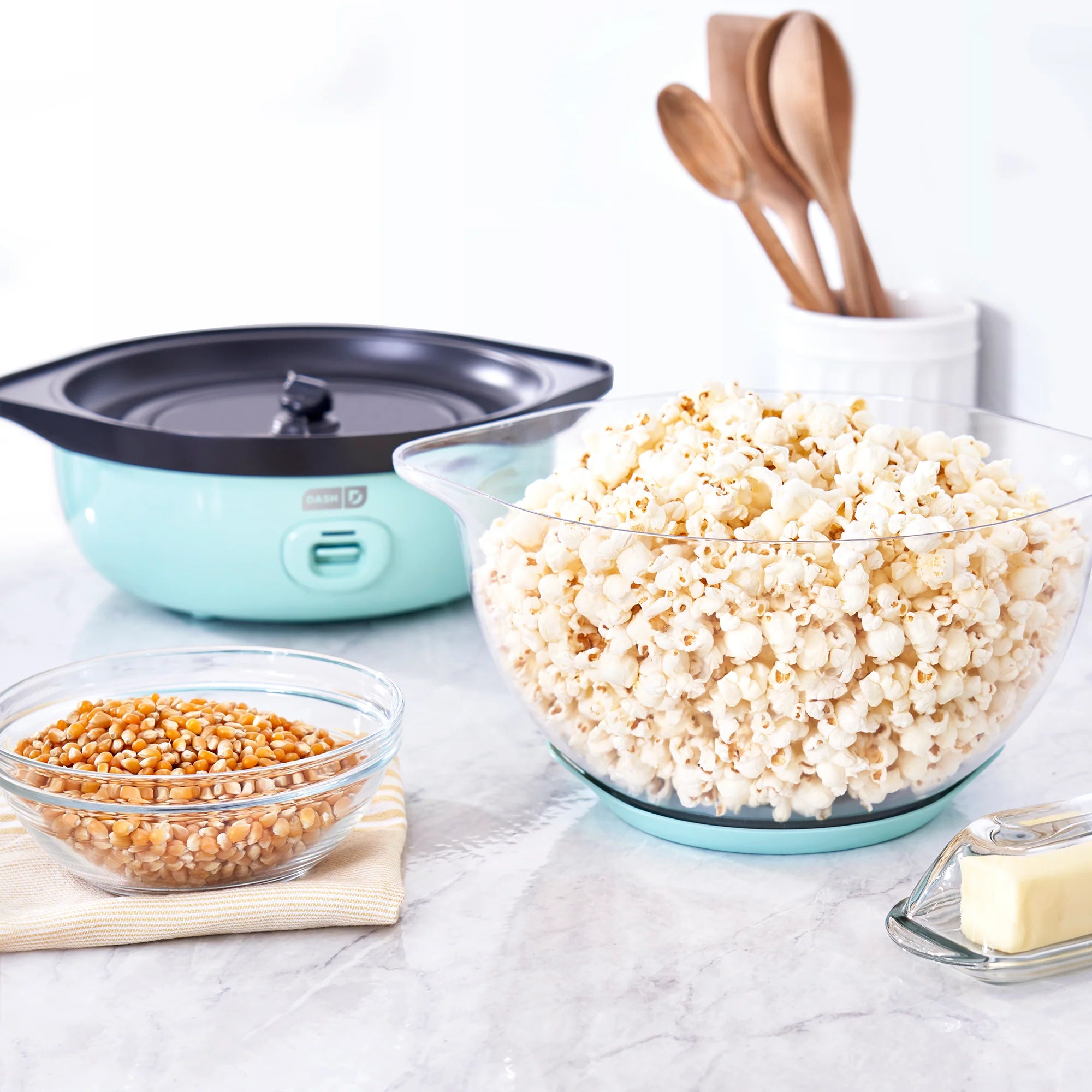 Pop and serve fresh homemade popcorn in one easy-to-store PTFE nonstick popcorn maker! Pop popcorn without having to heat the stove with the Stirring Popcorn Maker’s one-touch power: just add kernels, a little oil, and press the Power Button! Perfect for enjoying movie-theater-style popcorn, the Bowl of the SmartStore® Popcorn Maker lets you watch popcorn popping. and also doubles as a serving dish. With the included Measuring Cup, you’ll always make just the right amount for friends and family. The SmartStore® design makes it so the lid and base stack together, taking up less space in your cabinets. Get started enjoying delicious homemade popcorn right away — recipes included!