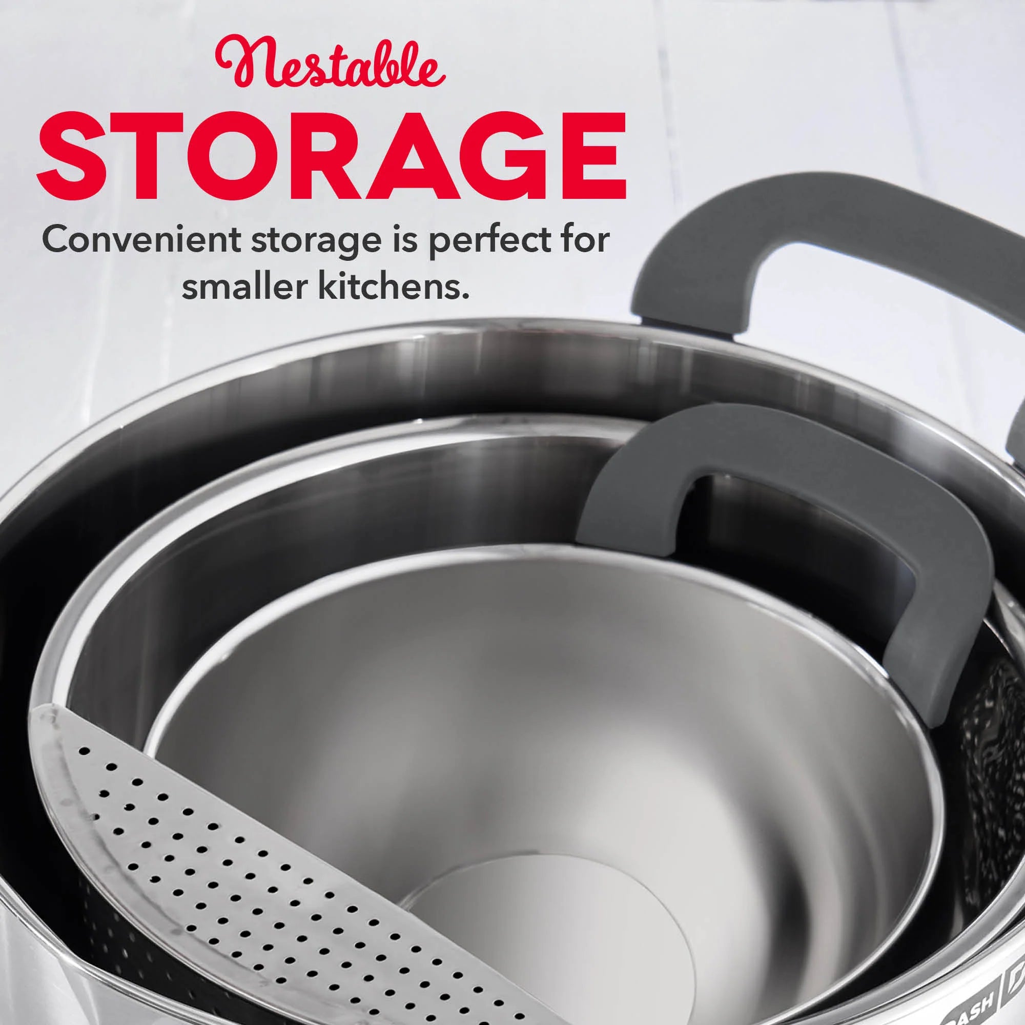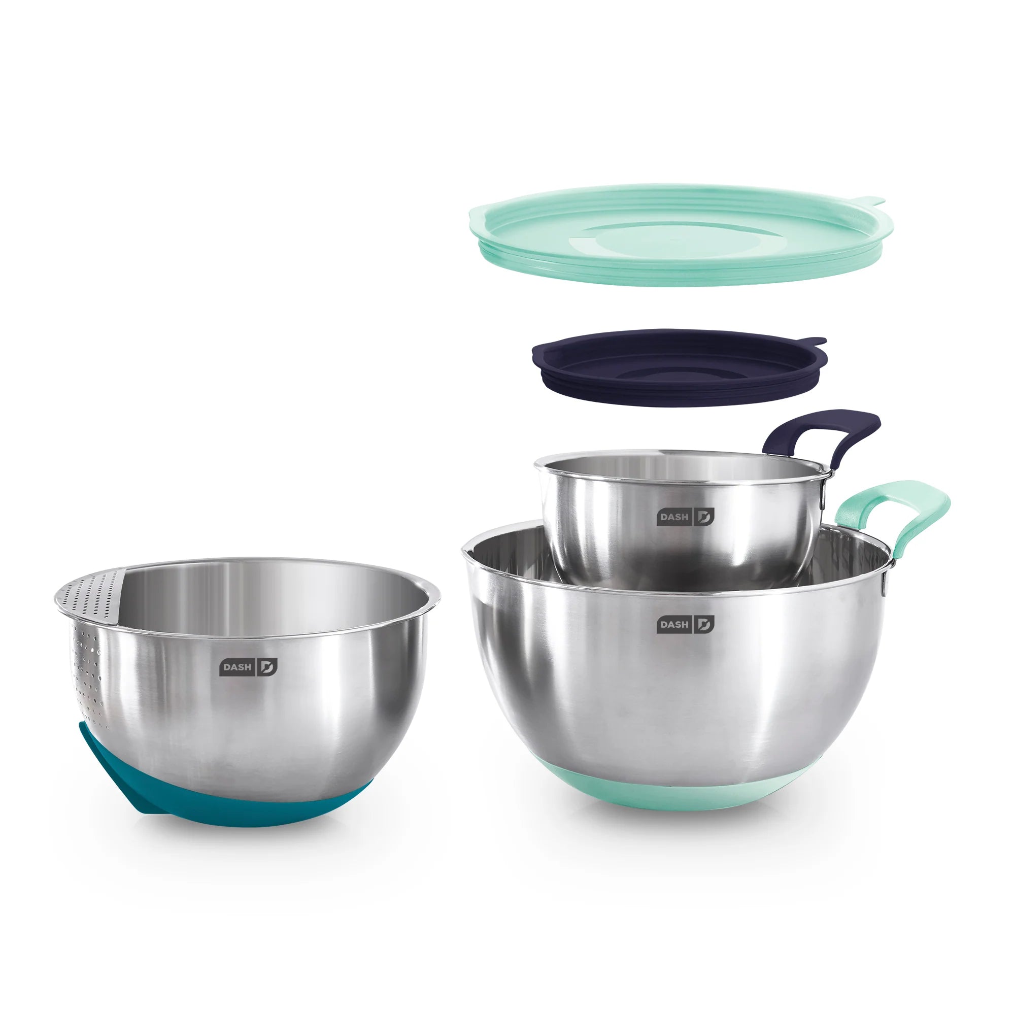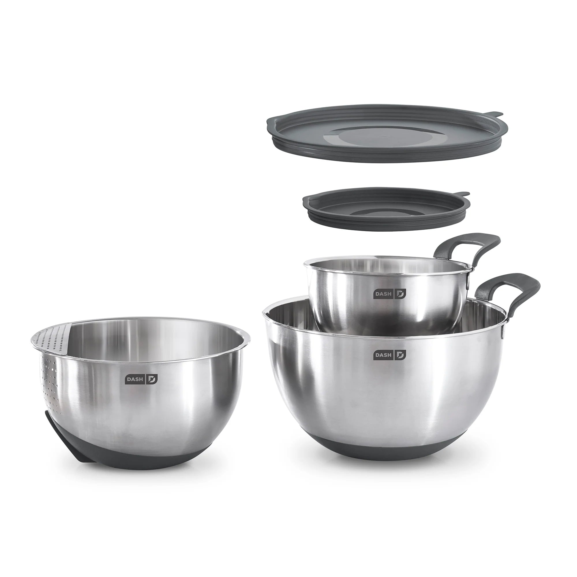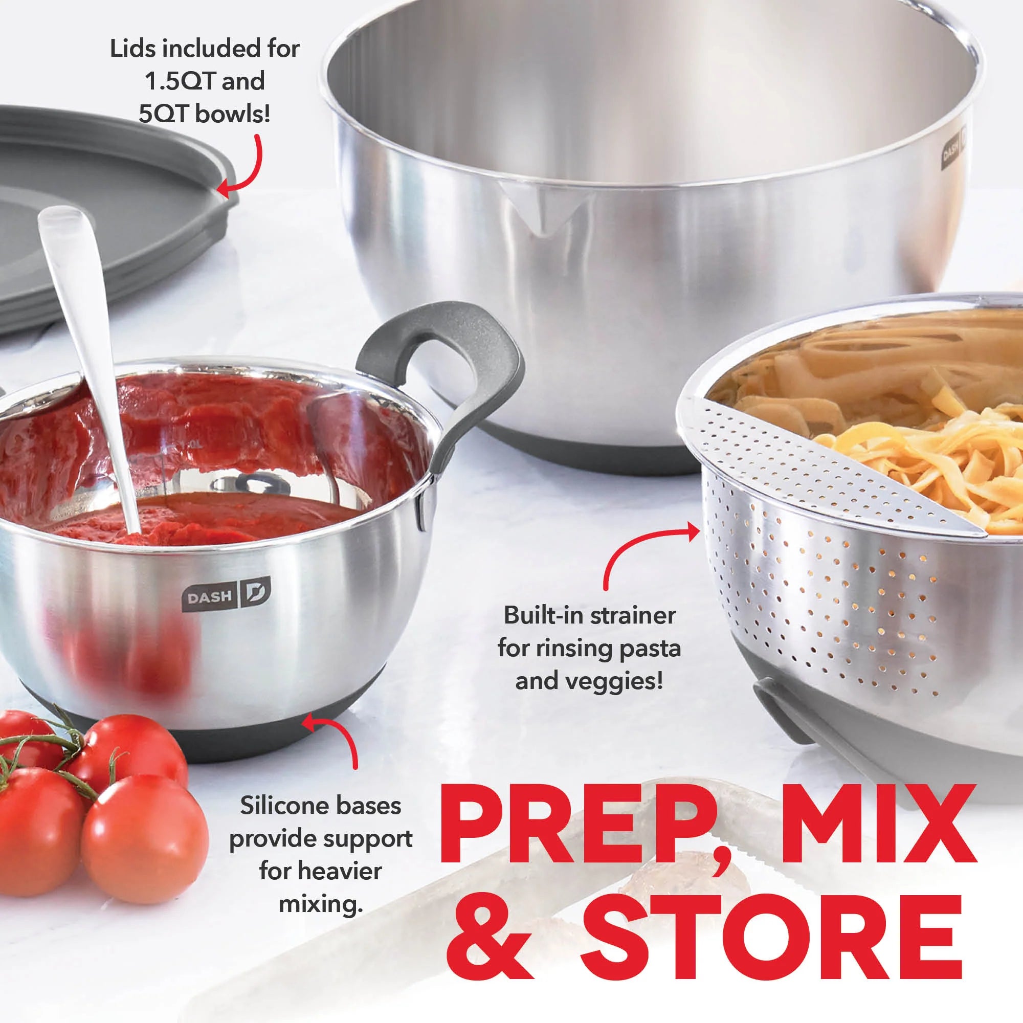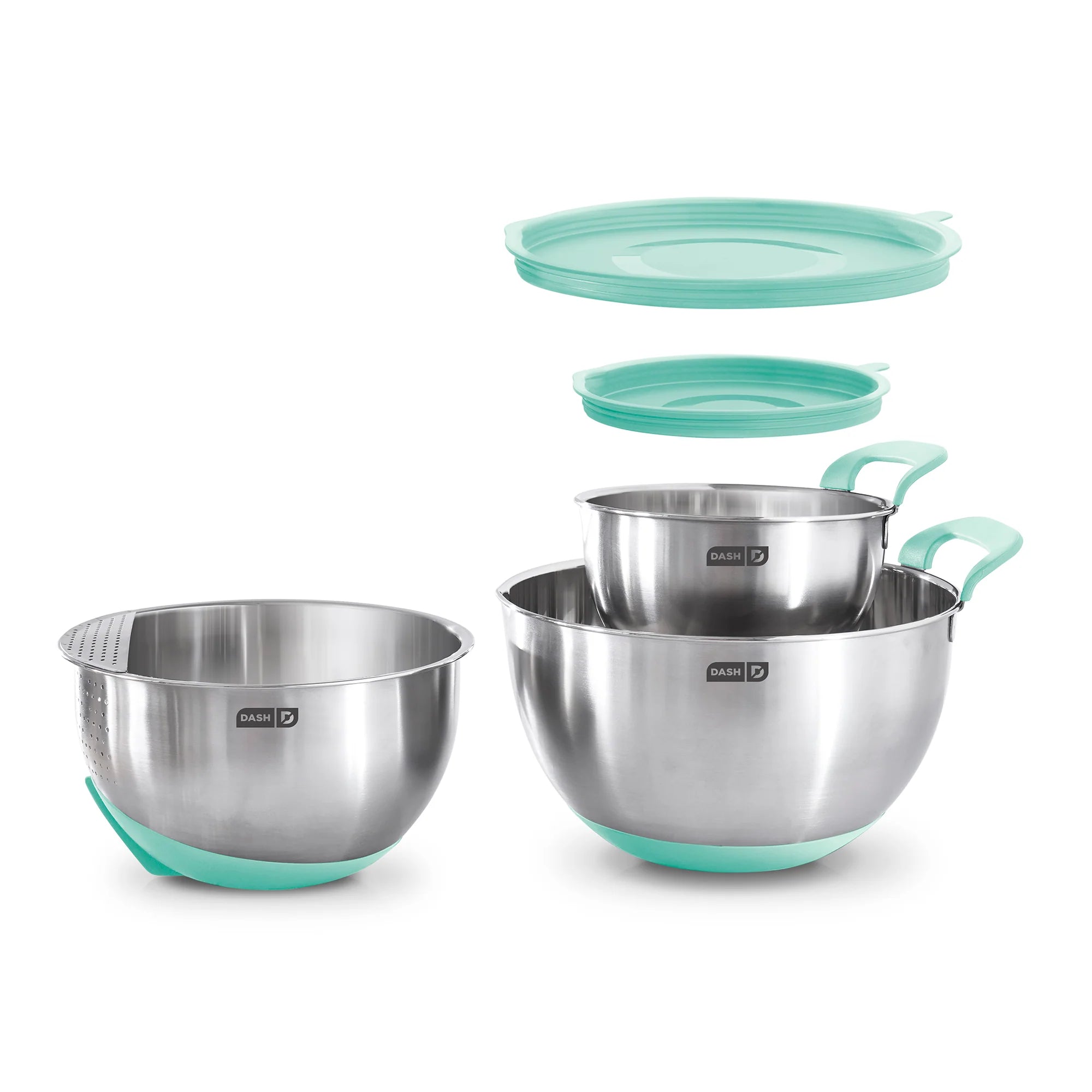 Multi-purpose Dash Stainless Steel Mixing Bowls are durable kitchen bowls for all your cooking and baking needs. Silicone bases and built-in handles ensure that these bowls are easy to grip while combining ingredients, and there are measurements indicated on the inside of each bowl for precise mixing. The bowls each have a spout for easily pouring out ingredients, and the 3 QT bowl has a strainer perfect for pasta, vegetables, and more. 2 lids are included so you can store leftovers without using another container.