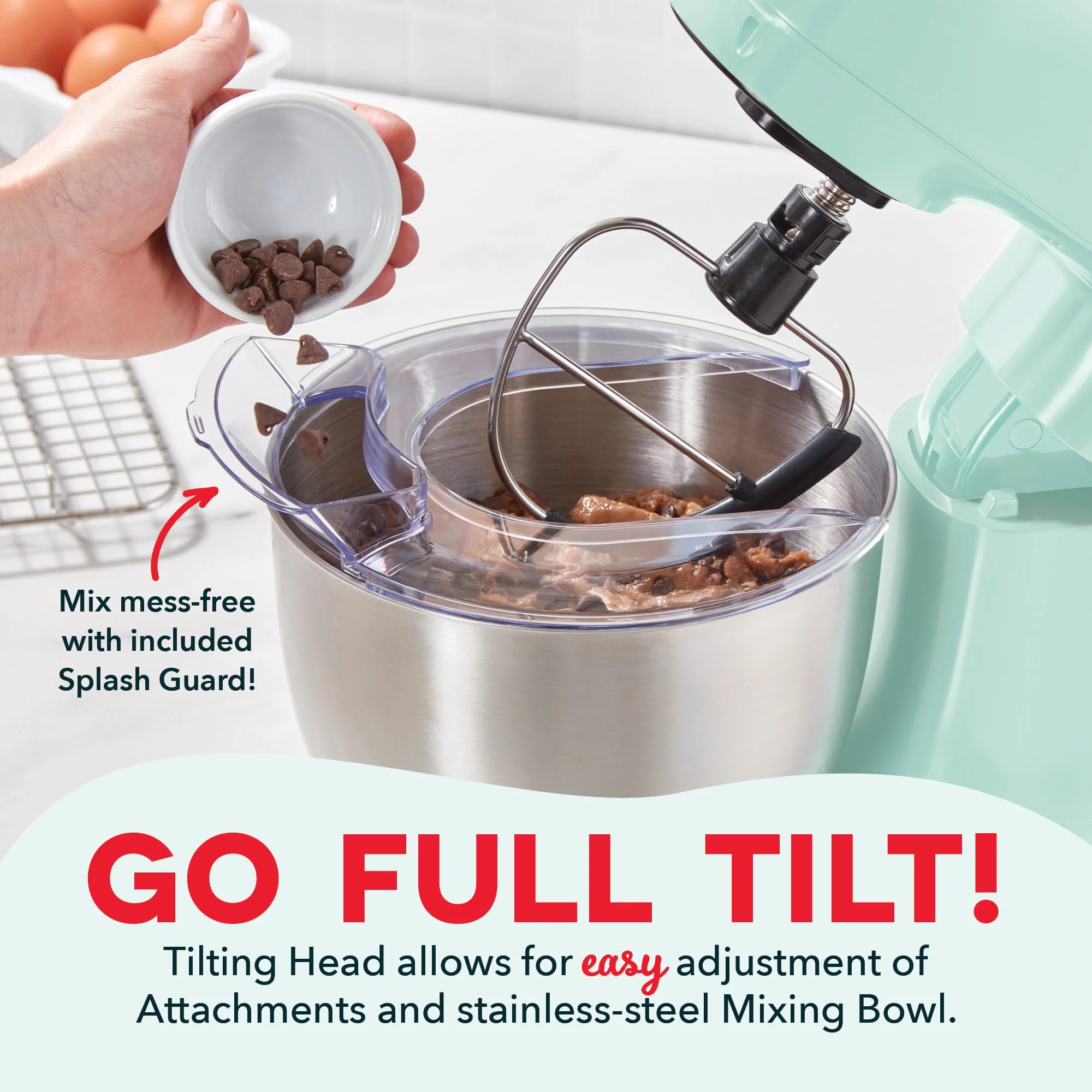 The baking buddy you never knew you kneaded! At 3.5QT capacity, it’s great for baking needs big and small! Lightweight but powerful with 350 watts,12 Speeds, and 3 Attachments, it can cream, whip, whisk, beat, and knead with ease. Go full tilt with full-range Tilting Head that makes it easy to remove Mixing Bowl and adjust attachments. And whisk away with less mess thanks to included Splash Guard, complete with handy Ingredients Chute for adding your flavorites while you mix. Mixing Bowl is sturdy stainless steel for carefree mixing. Paddle Attachment is great for batters, frosting, cookie dough, and creaming butter and sugar. The Whisk Attachment tackles eggs and whip cream in a dash—also marvelous for meringues! And the Dough Hook does all the work when it comes to kneading out pizza and biscuit dough. Bowl & Attachments are dishwasher safe—easy baking, easy cleanup! Don’t know what to throw into the mix? Recipes are included—can’t beat that!
