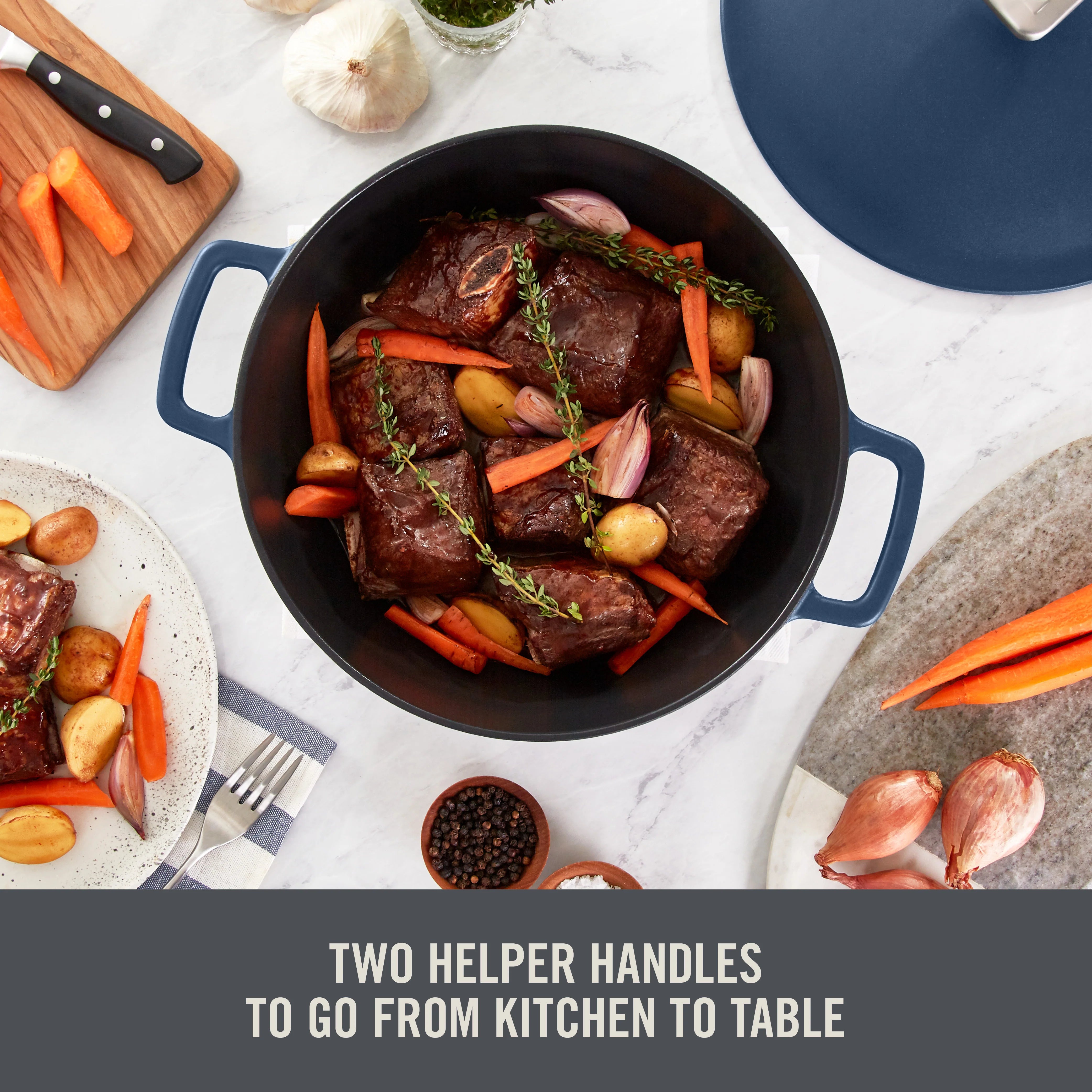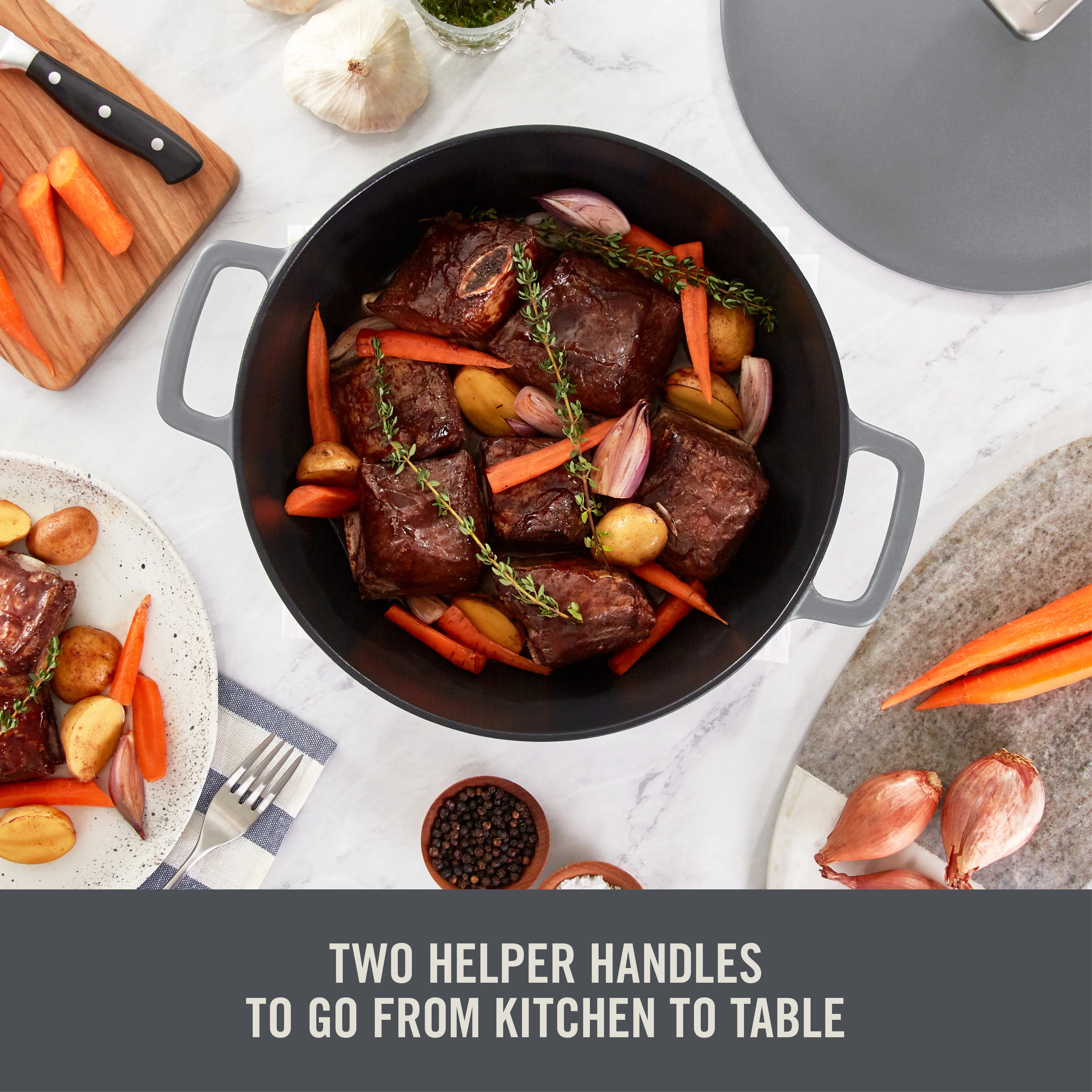 From Zakarian by Dash, this Nonstick Cast Iron 4.5Qt Deep Skillet gives home chefs the ability to make restaurant-quality meals at home! The unique TruPro Titanium Ceramic Nonstick coating sets Zakarian by Dash cast iron cookware apart — it never needs seasoning, food releases effortlessly, is rust-resistant and maintenance free, and is PFAS, PFOA, PTFE, lead and cadmium free. It is compatible with all cooking methods and creates a perfect sear up to 500°F. The Helper Handle and Pour Spout ensure full control over the disposal of hot grease or pouring of sauces. The large capacity is great for a variety of dishes for the whole family.