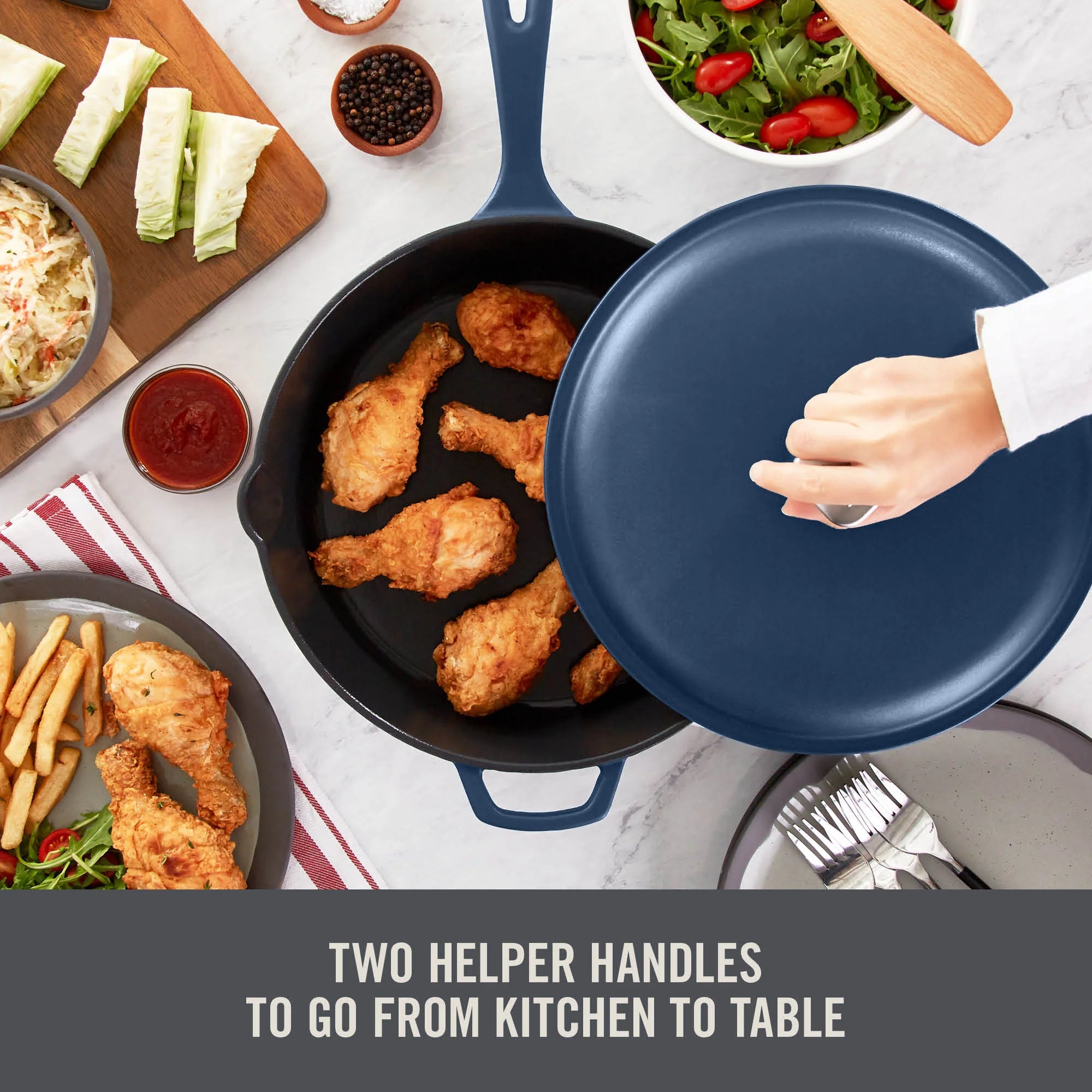 From Zakarian by Dash, this Nonstick Cast Iron 4.5Qt Deep Skillet gives home chefs the ability to make restaurant-quality meals at home! The unique TruPro Titanium Ceramic Nonstick coating sets Zakarian by Dash cast iron cookware apart — it never needs seasoning, food releases effortlessly, is rust-resistant and maintenance free, and is PFAS, PFOA, PTFE, lead and cadmium free. It is compatible with all cooking methods and creates a perfect sear up to 500°F. The Helper Handle and Pour Spout ensure full control over the disposal of hot grease or pouring of sauces. The large capacity is great for a variety of dishes for the whole family.