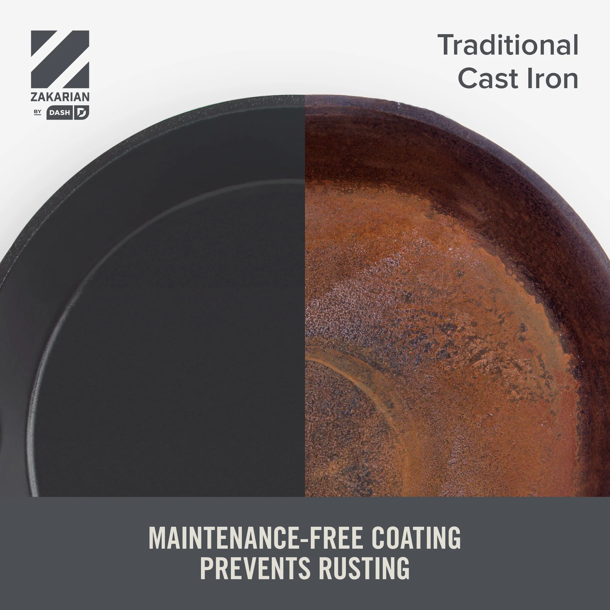 This 6QT Nonstick Cast Iron Dutch Oven by Zakarian by Dash is ideal for making stews, roasts, soups, breads and more. The 2-in-1 Nonstick Cast Iron Lid also acts as a skillet for an additional cooking surface on your stovetop, grill or in your oven. The unique TruPro Titanium Ceramic Nonstick coating sets Zakarian by Dash cast iron cookware apart — it never needs seasoning, food releases effortlessly, is rust-resistant and maintenance free. It is compatible with all cooking methods and creates a perfect sear up to 500°F. Two loop handles make the pan easy to transport and serve. Between the capacious 6Qt Nonstick Cast Iron Dutch Oven and the 2-in-1 Nonstick Cast Iron Skillet Lid, there are limitless restaurant-quality dishes you can make for the whole family!