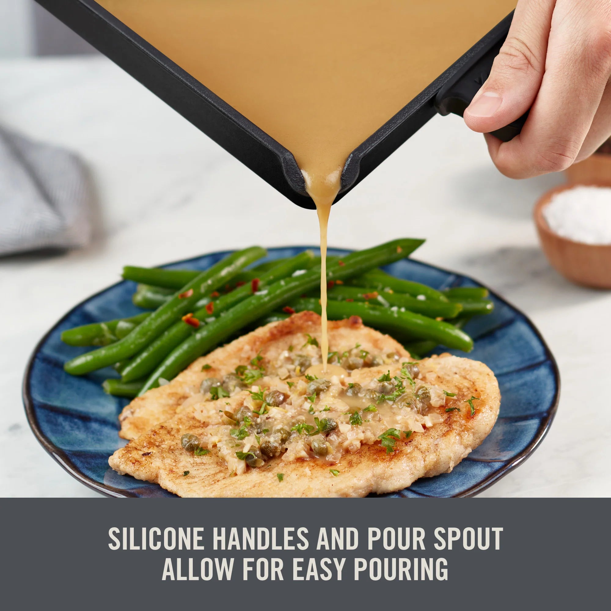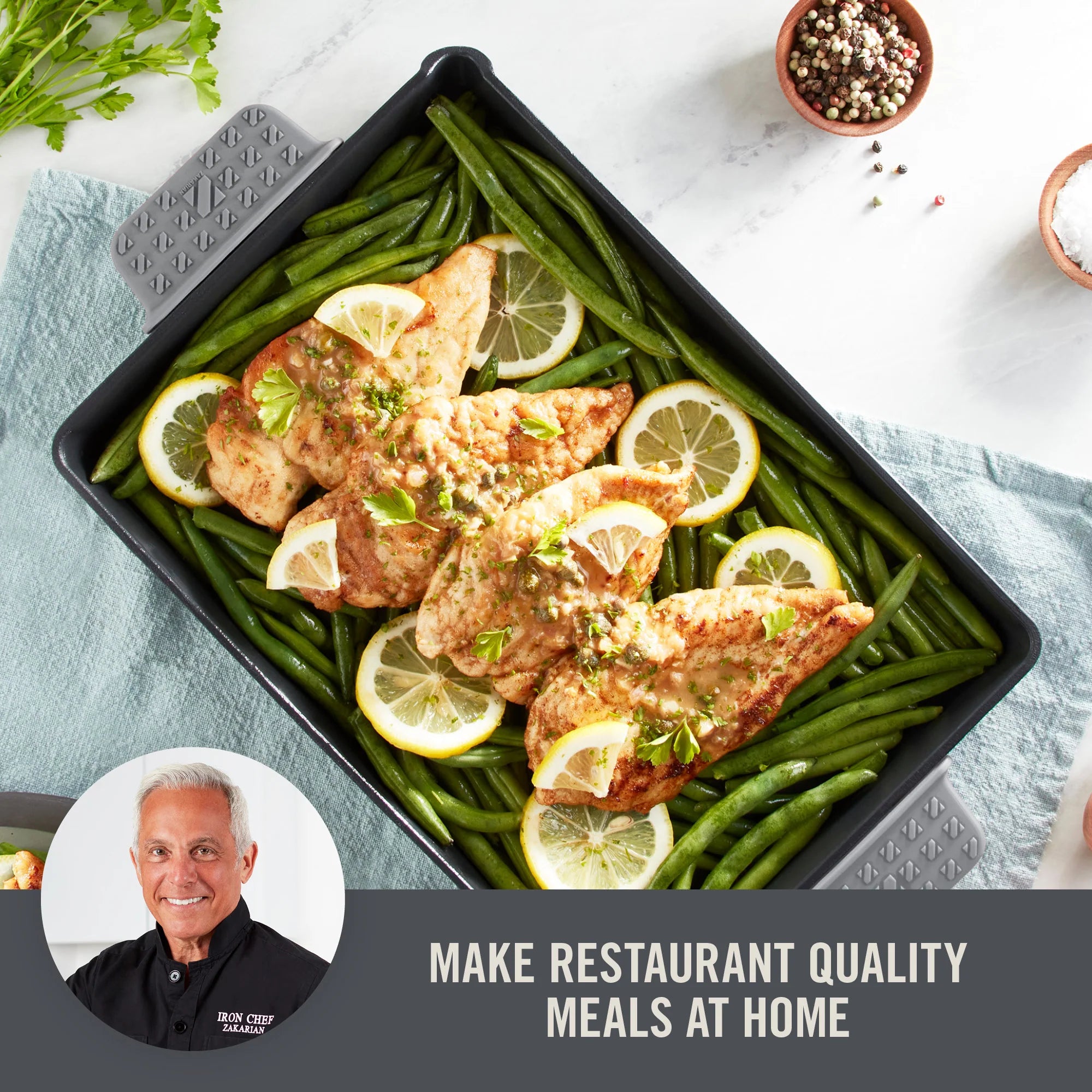 Roast and bake all your favorite meals with the Zakarian by Dash 9”x13” Nonstick Cast Iron Pan with Pour Spout and Removable Silicone Grips!