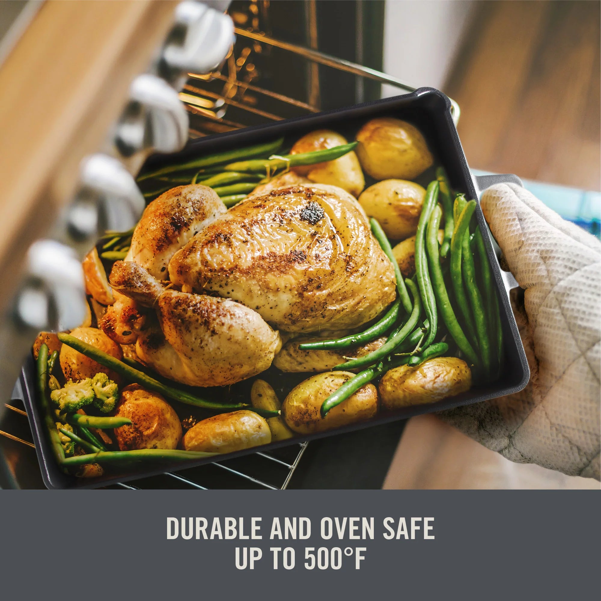 Roast and bake all your favorite meals with the Zakarian by Dash 9”x13” Nonstick Cast Iron Pan with Pour Spout and Removable Silicone Grips! This rectangular pan is perfect for entrées and family dining. It’s pour spout makes draining and cleanup easy! The removable Silicone Grips make it easier to transport your pan from oven, stovetop or grill to table, and can be used to protect your hands when handling any other cookware with handles. The unique TruPro Titanium Ceramic Nonstick coating sets Zakarian by Dash cast iron cookware apart — it never needs seasoning, food releases effortlessly, is rust-resistant and maintenance free, and is PFAS, PFOA, PTFE, lead and cadmium free. It is compatible with all cooking methods and creates a perfect sear up to 500°F. This is the perfect pan for making delicious, family meals or for entertaining and serving a stunning main course or side.