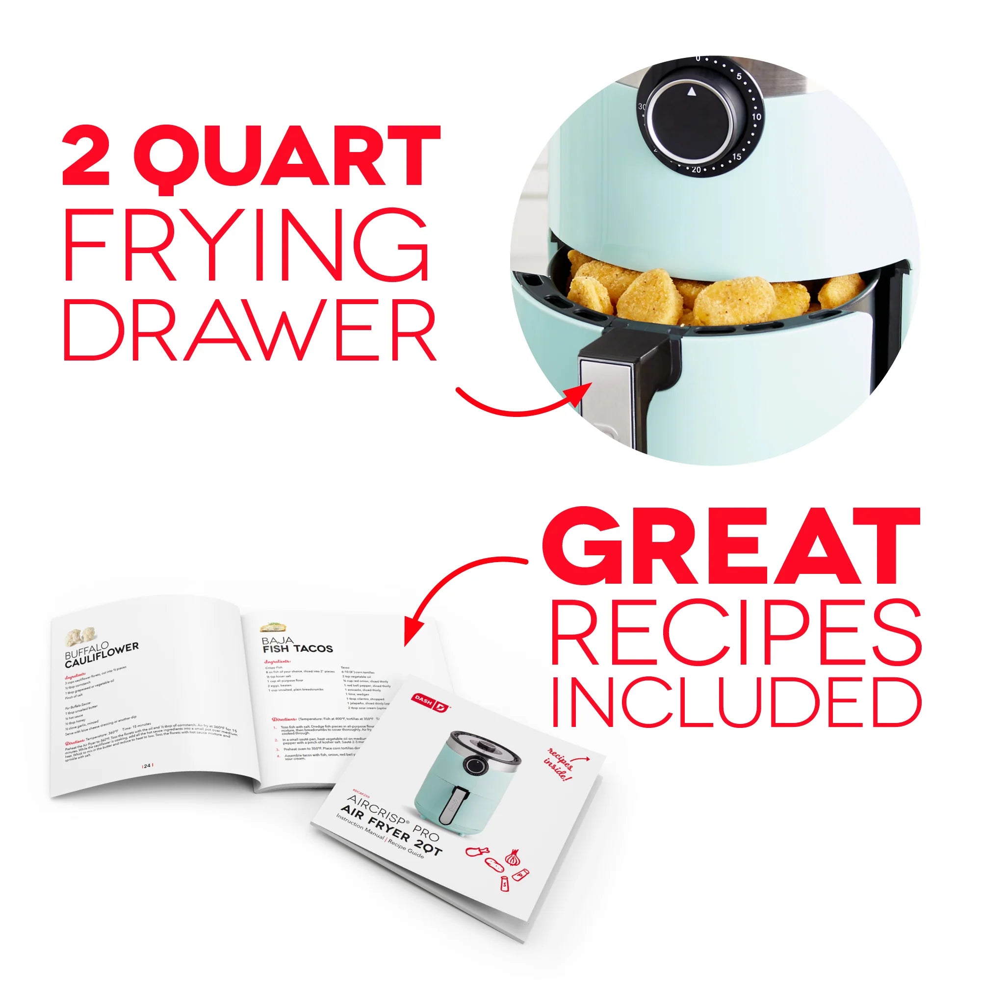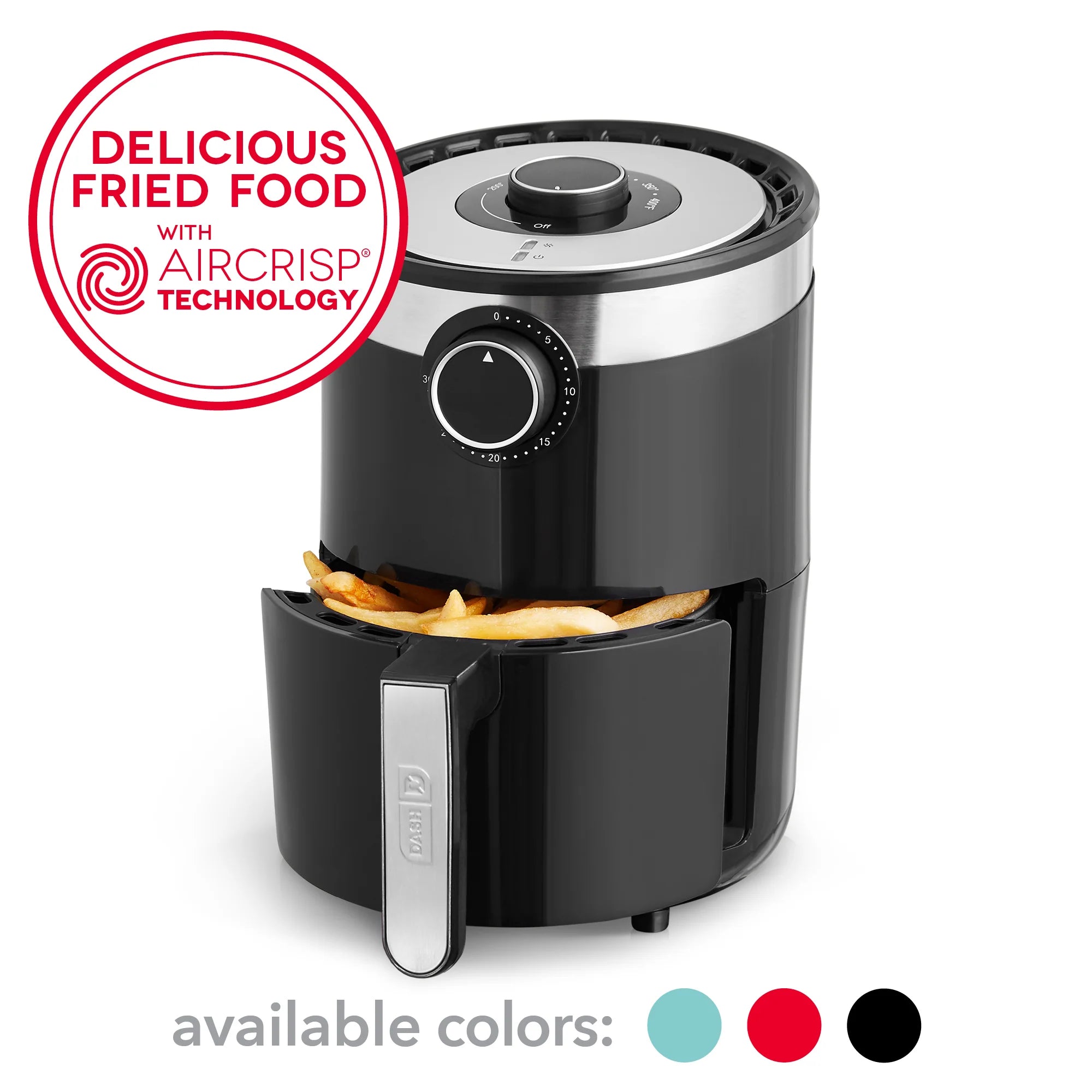 A more compact version of the Dash AirCrisp® Pro Air Fryer, this 2 Qt Air Fryer is perfect for cooking single servings of delicious, crispy fried food with none of the added fat!