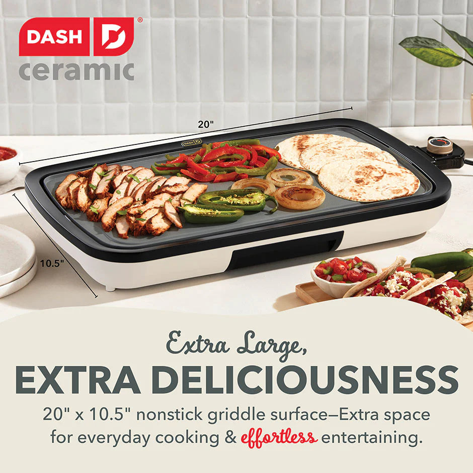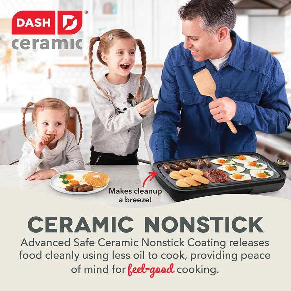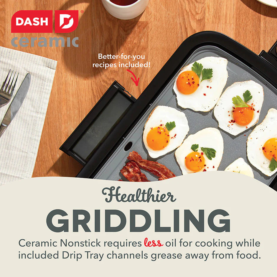 Big family meals are easier than ever with a griddle help from Dash! Extra large for extra deliciousness, the Dash Ceramic Everyday Griddle features a 20x10.5” cooking surface perfect for everything from breakfast to burgers. Bring the heat and cook it just how you like it with precision temperature control via the handy Temperature Dial. The cooking surface heats and cooks quickly and evenly—no more hot spots thanks to intuitive placement of the Griddle’s heating element. Laboratory-tested and FDA-approved to be food-safe, our advanced Safe Ceramic Nonstick coating boasts our easiest food release yet for picture-perfect dishes and quick cleanup. Easy food release means less oil is required for cooking, and the included Drip Tray channels grease away from food. The result is less grease and healthier griddling! Breakfast, lunch, or dinner, this hardworking hero is excellent for entertaining and family gatherings as well as everyday meals that require a griddle extra space.