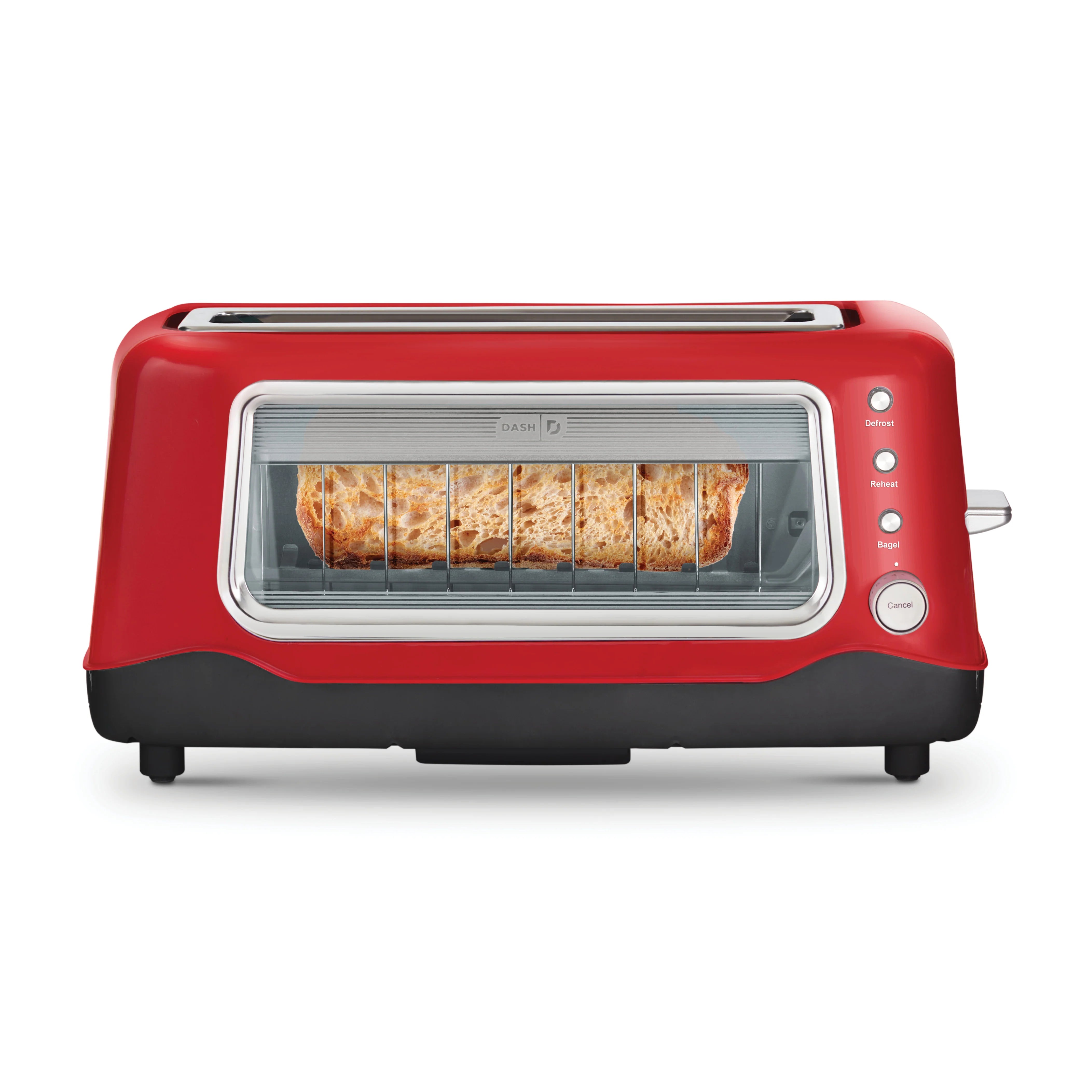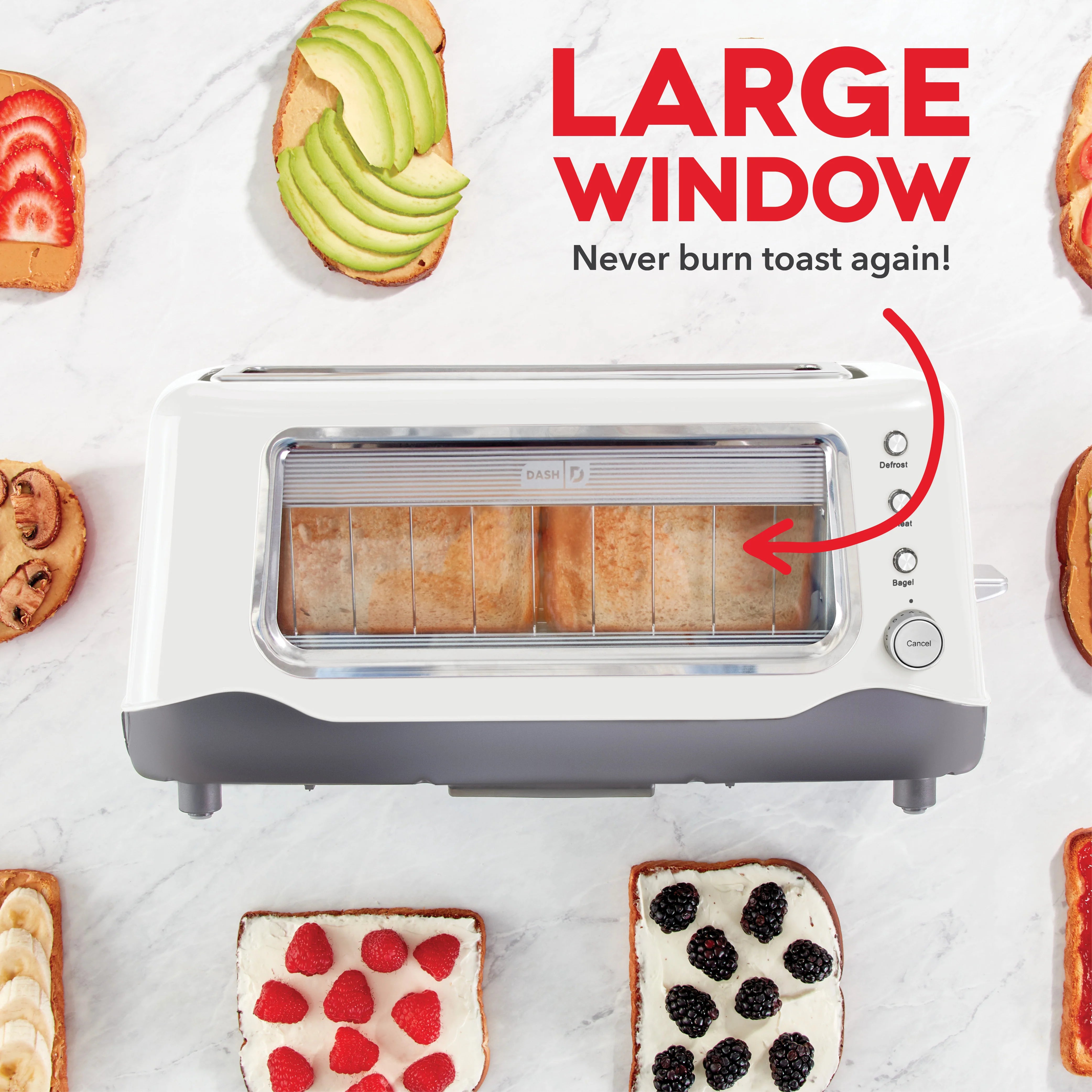 With 7 browning levels and a clear-view window, the Dash Clear View Toaster takes the guesswork out of toasting. See for yourself through the window as your toast is cooked to your exact preference! With 1-touch defrost, reheat, and bagel functions, the toaster handles a variety of specialty breads and baked goods in the extra-wide chamber. The auto-shut off feature prevents burning, and the crumb tray and glass window slide out for easy cleaning.