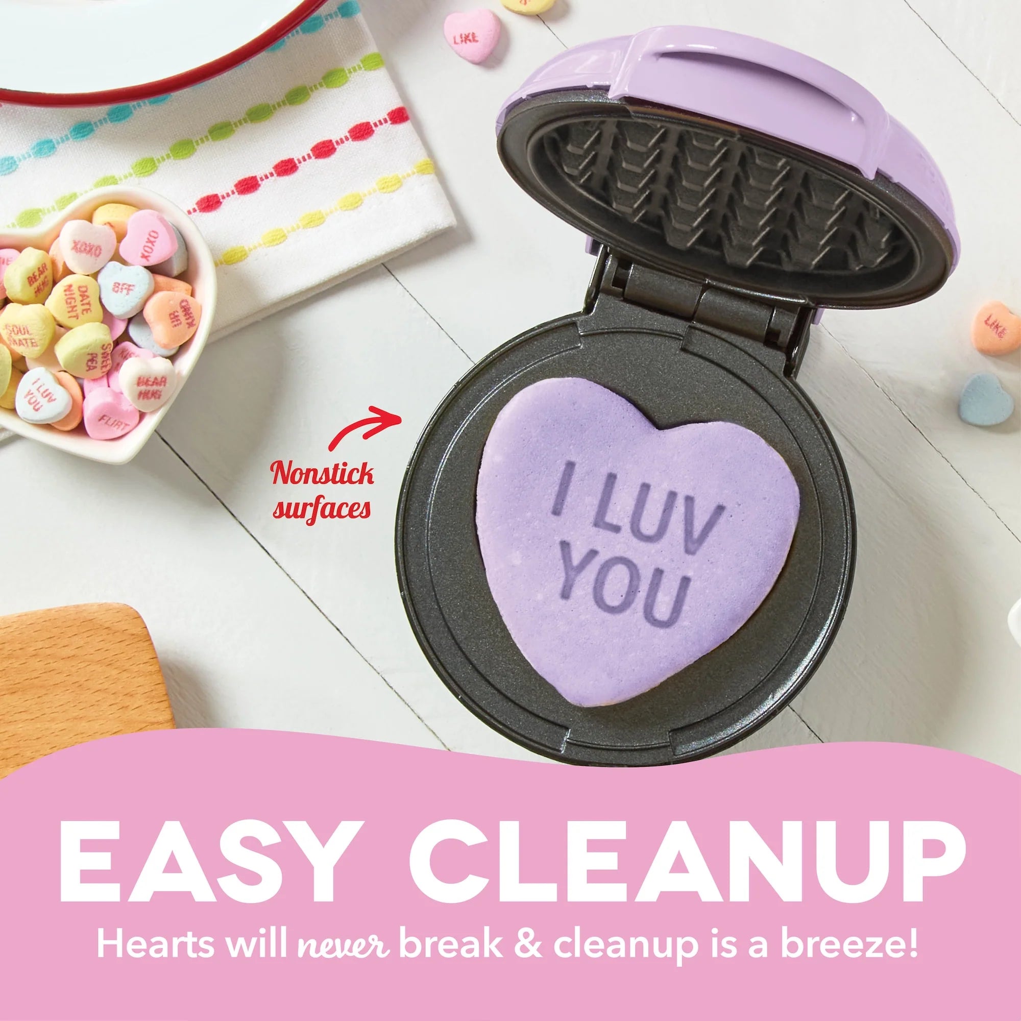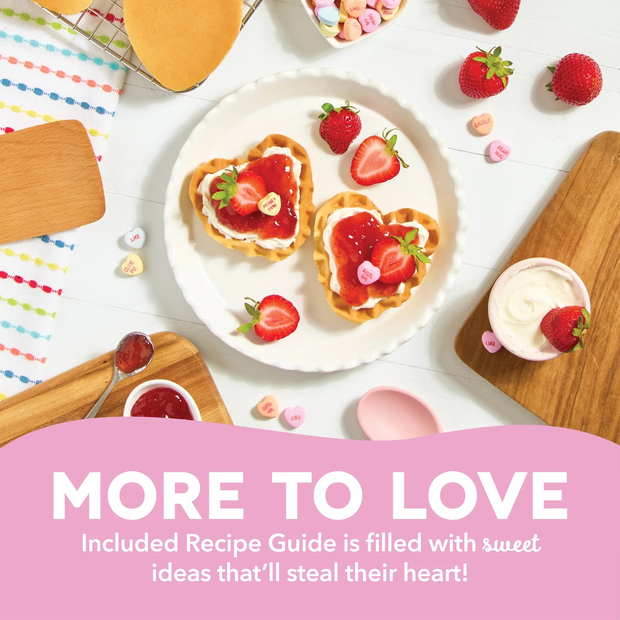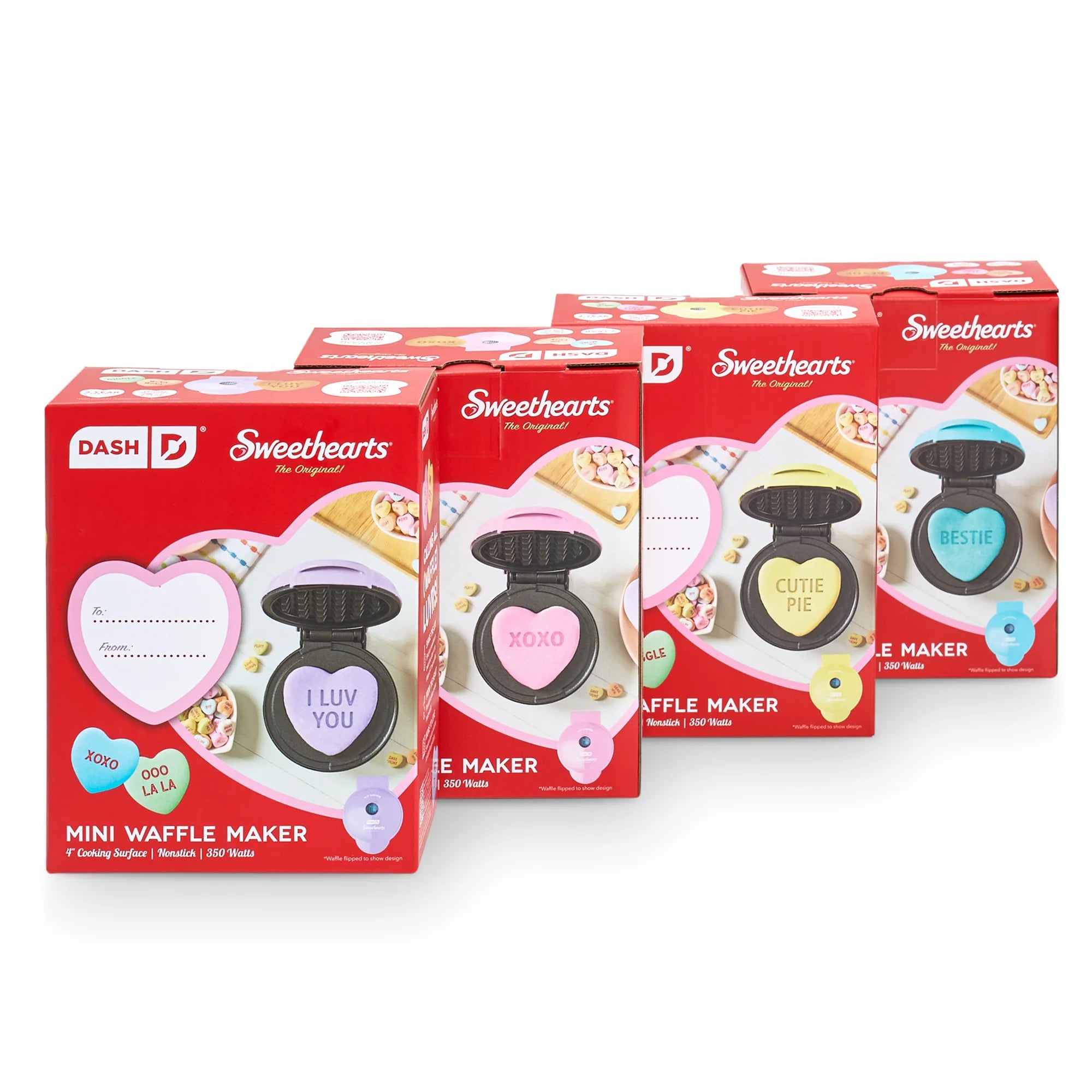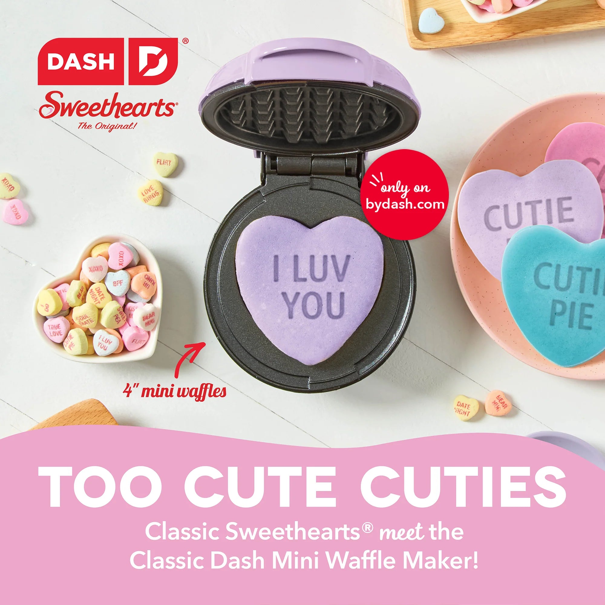 The Dash x Sweethearts® Mini Waffle Maker brings the iconic Sweethearts® Candy straight to your kitchen in waffle form. Perfect for Valentine's Day breakfasts, a sweet surprise for your beloved, or the highlight of fun family festivities they’re sure to love! Dual nonstick surfaces cook and heat quickly and evenly and release waffles cleanly. Heart-shaped waffles are ready to decorate and easy to share, perfect for spreading the love even when Cupid’s not in town. Get ready to dive into our Recipe Guide, brimming with ideas that’ll help you say "You're the syrup to my waffles" in the most flavorful ways imaginable!
