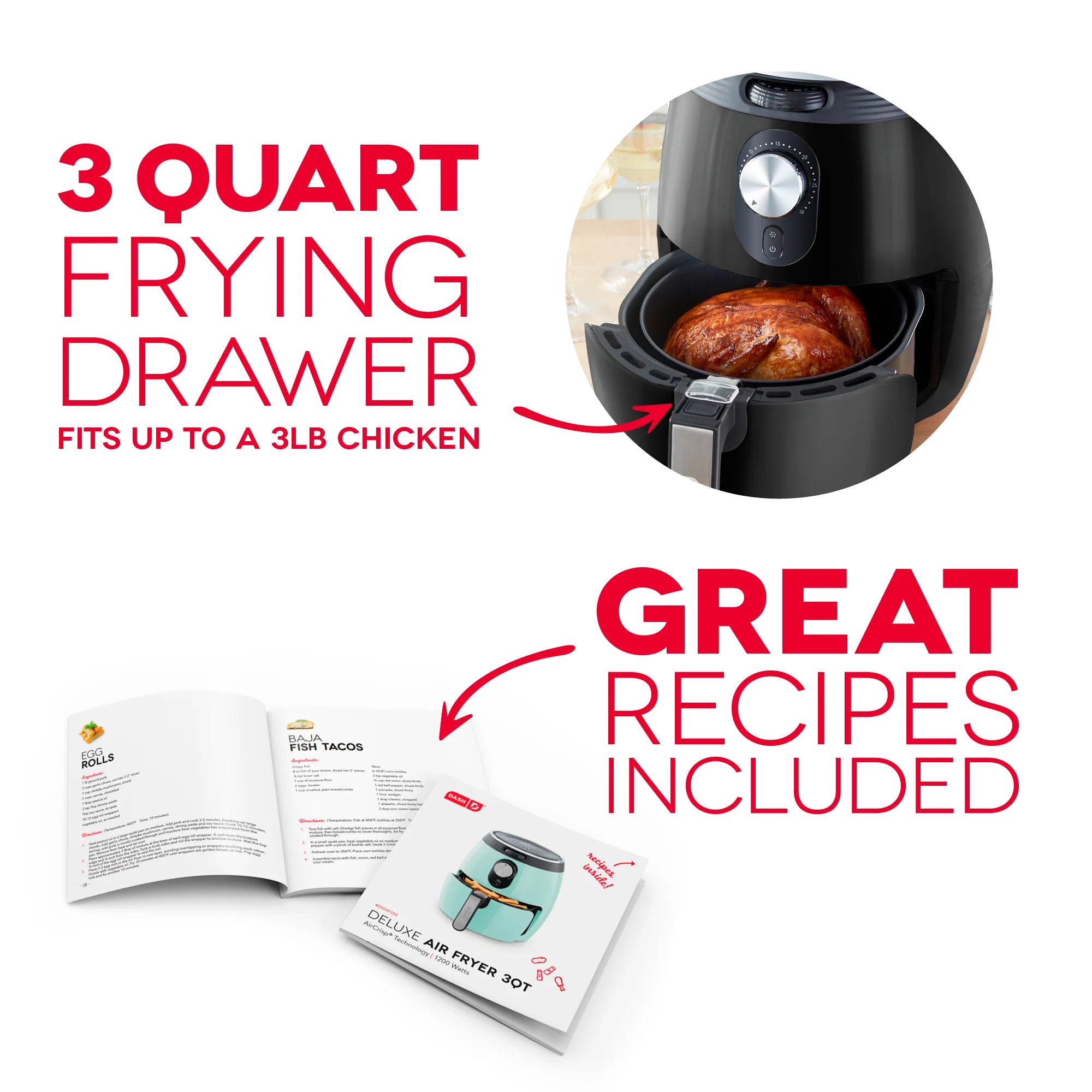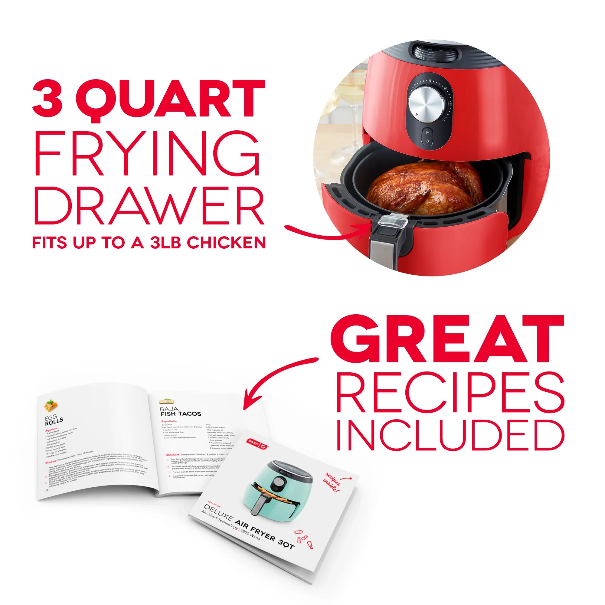 Cook healthier fried food using only hot air with the PTFE nonstick Dash Deluxe Air Fryer! AirCrisp® technology circulates hot air to cook delicious fried food without the oil and mess of a deep fryer, reducing added fat while maintaining delicious flavor and crispiness. The adjustable dials allow precise control over time and temperature, and auto-off function shuts the air fryer down when cooking is finished for added safety. The three-quart removable fryer basket is nonstick and easy to clean, perfect for single servings of fries, veggies, chicken wings, and more. The Air Fryer includes a Recipe Guide that will get you started making delicious, crispy fried foods in less time than it takes to pre-heat your oven.