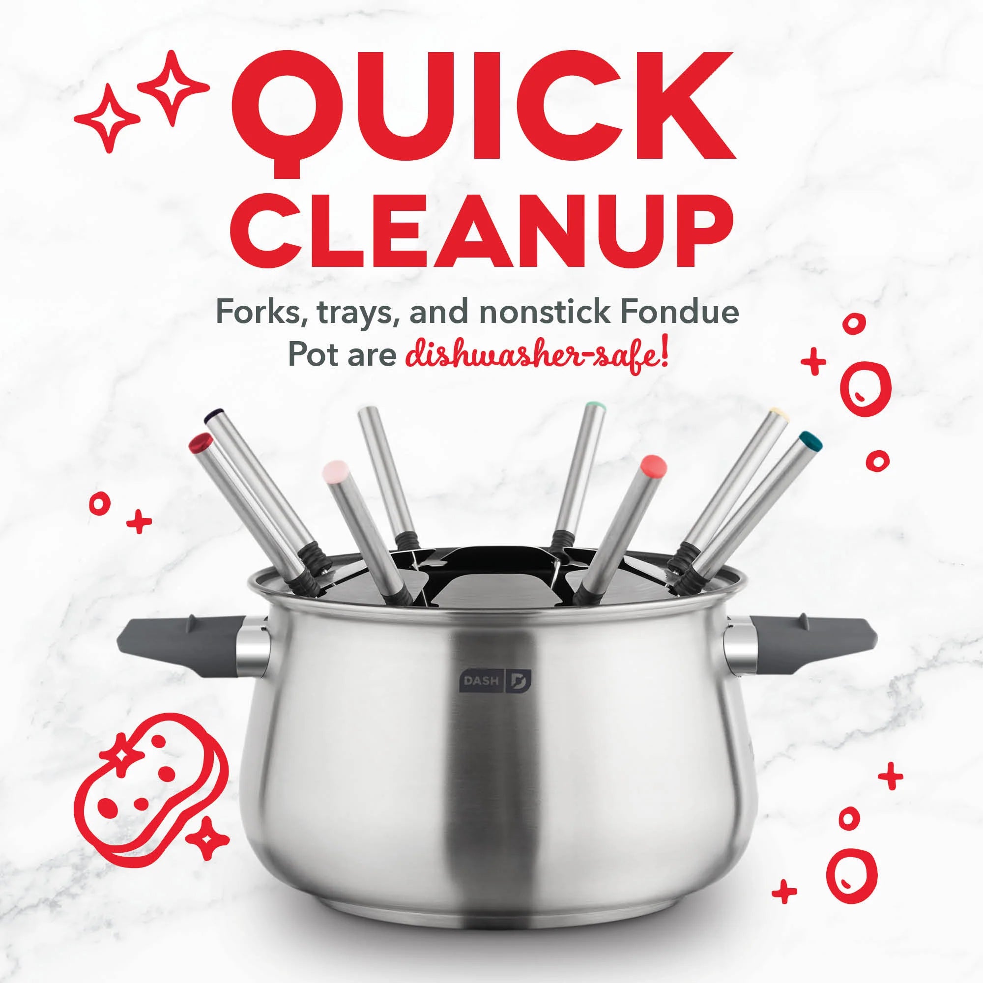 Great for cheese, chocolate, and oil fondue, the PTFE nonstick Fondue Maker melts ingredients perfectly for decadent at-home entertaining. Perfect for cheese, chocolate, and oil fondue, the Fondue Maker melts ingredients to the perfect temperature for decadent fondue entertaining. Use the 8 color-coded Fondue Forks to enjoy with friends and family, and the convenient Fork Rack on top of the Fondue Maker helps prevent drips. Plus, with the added Fondue Cups around the edge, you can serve up your favorite fruits, veggies, meats, and more, all conveniently located around the Stainless Steel Fondue Pot. Our included Recipe Guide will get you started wowing friends and family with your own homemade fondue!