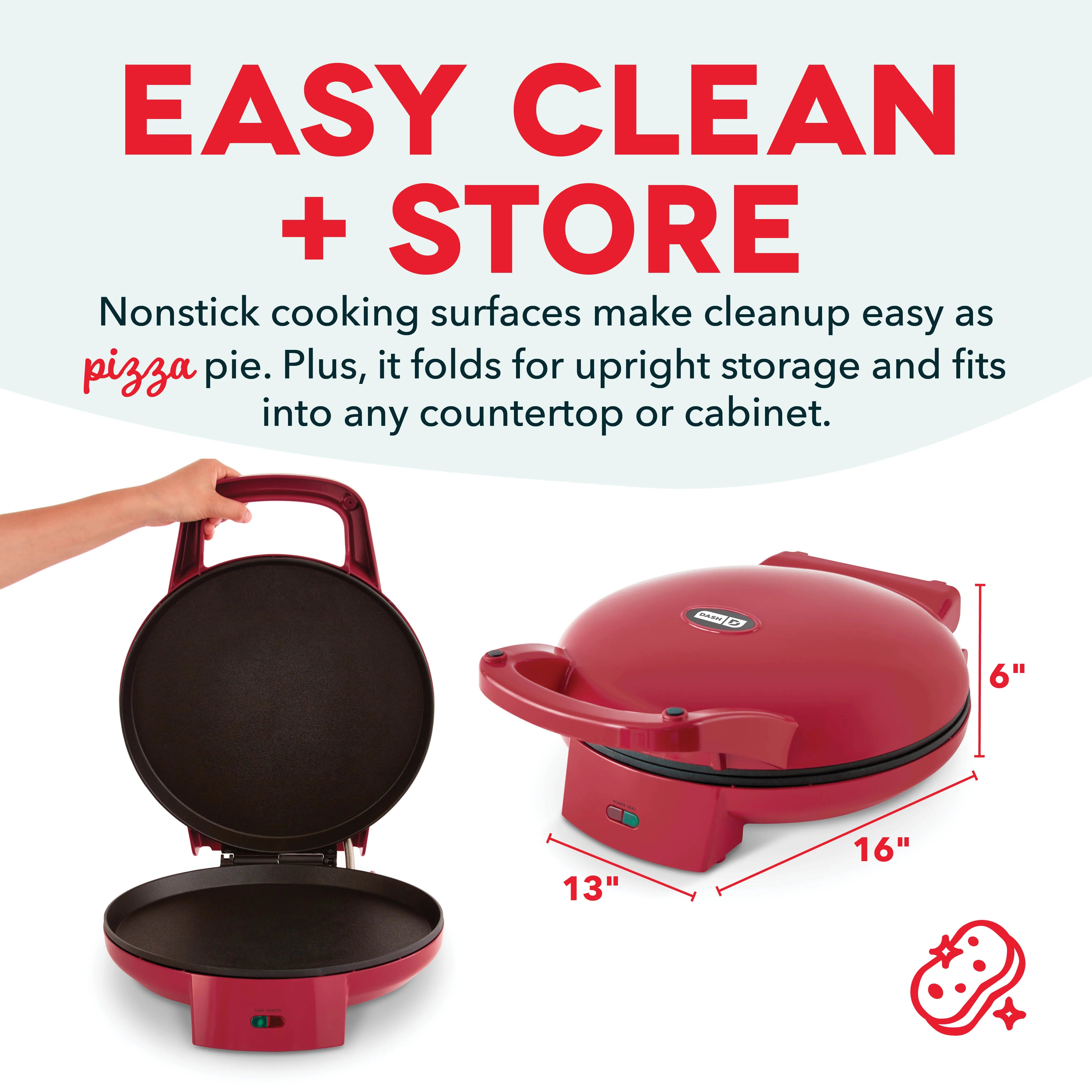 Pizza party for one or invite the whole crew! The Dash Pizza Griddle features two 12” skillet cooking surfaces—fold the Griddle and close it to cook up hot and crispy personal pizzas or unfold the Griddle to utilize two cooking surfaces!