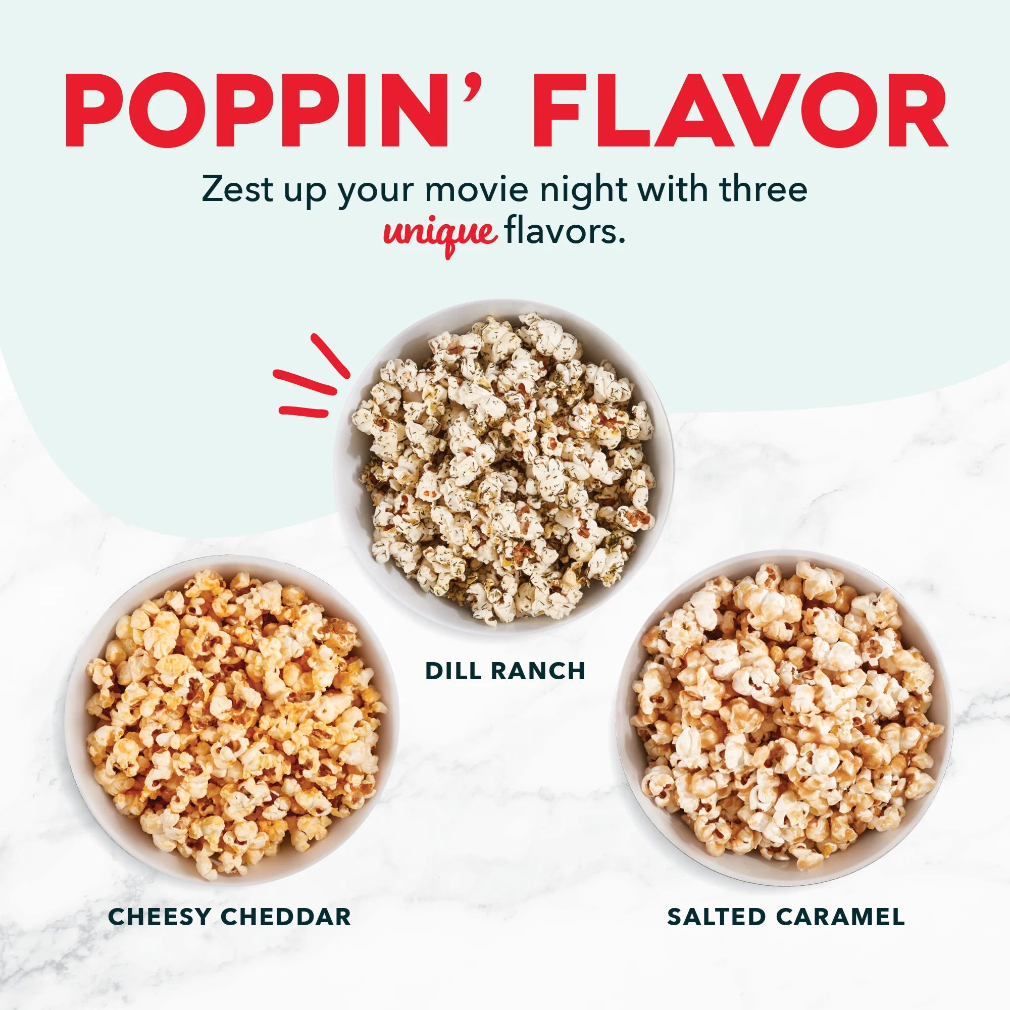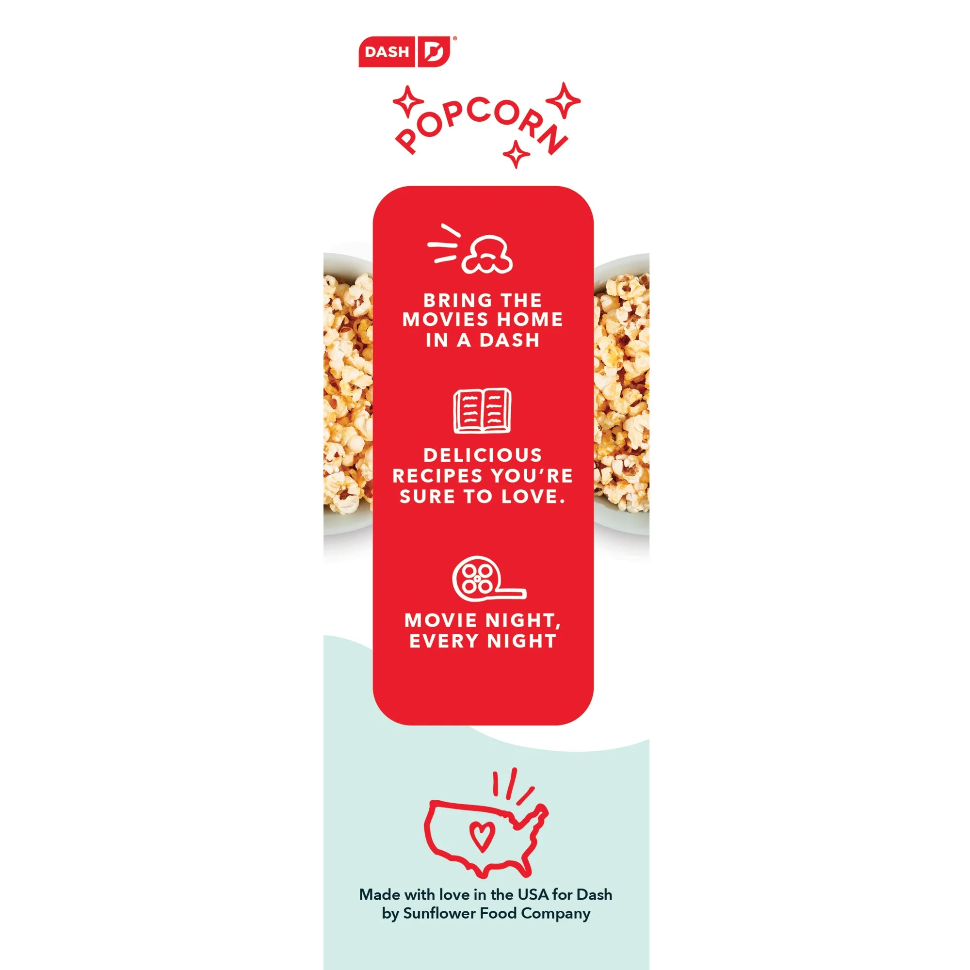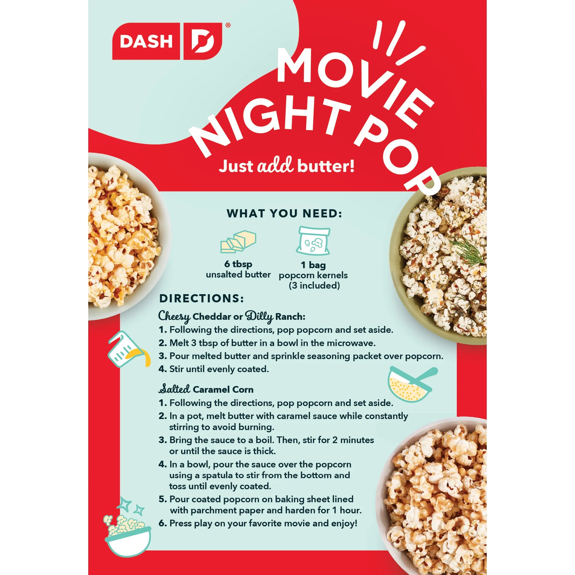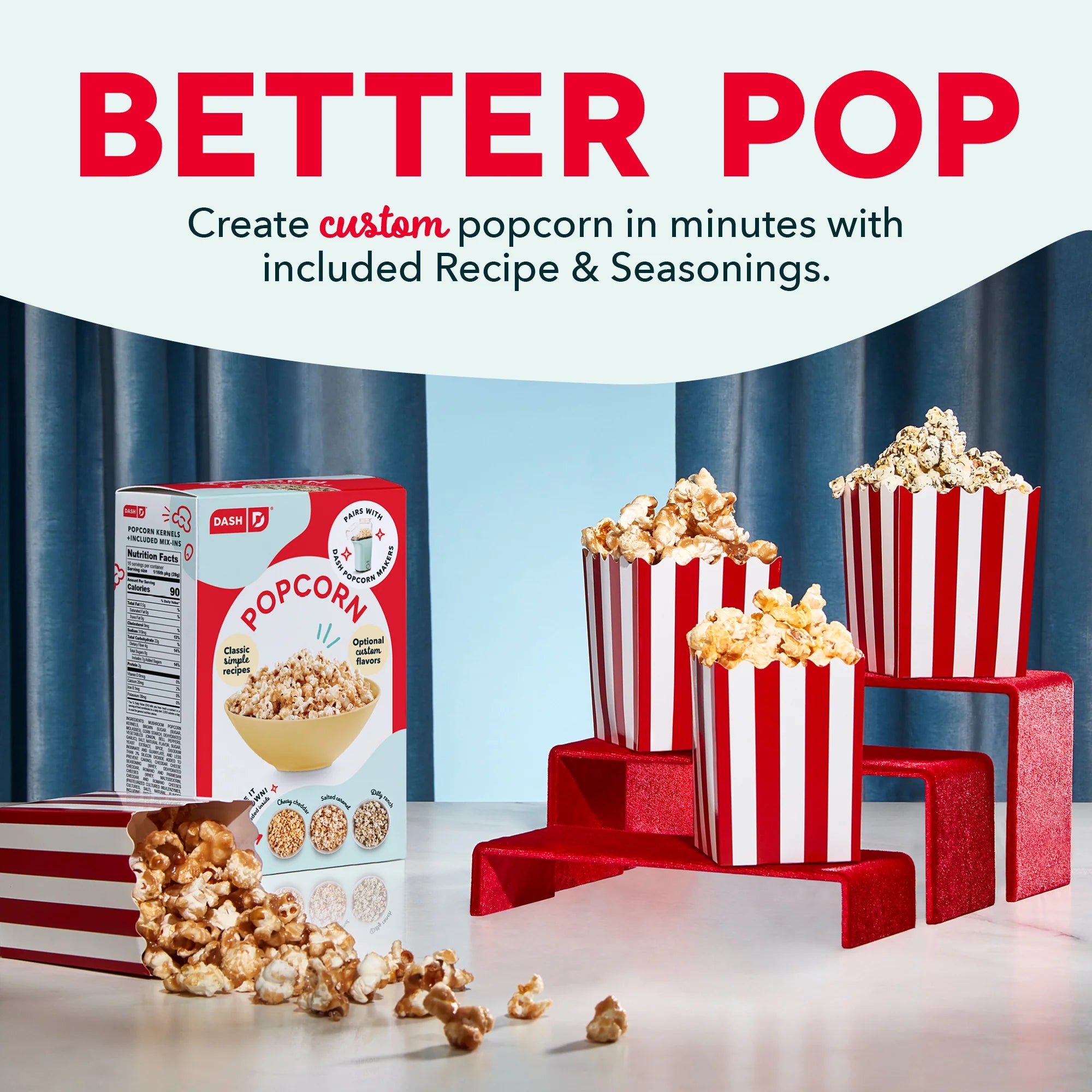 It’s easier than ever to party like a POP star. Everything you need for a magical movie night all in one box, no tickets required! Use any of Dash’s Popcorn Makers to pop up to 36 cups of fresh popcorn then top with a Custom Mix-in of your choice including both sweet and savory options. Pop and top with Cheesy Cheddar, Salted Caramel, or Dilly Ranch, all made with mindful ingredients. Then sit back, hit play, and pop it like it’s hot. Enjoy the show!
