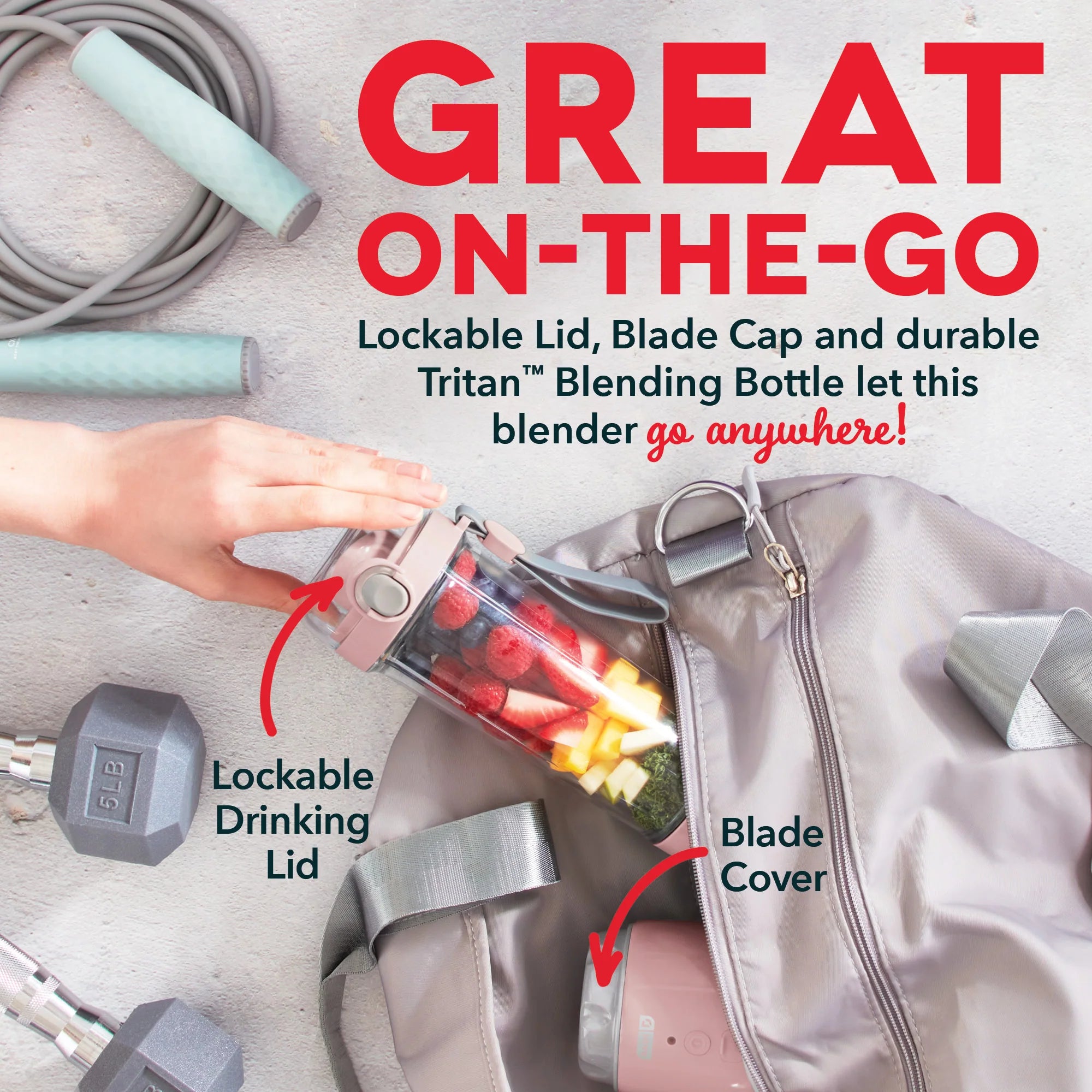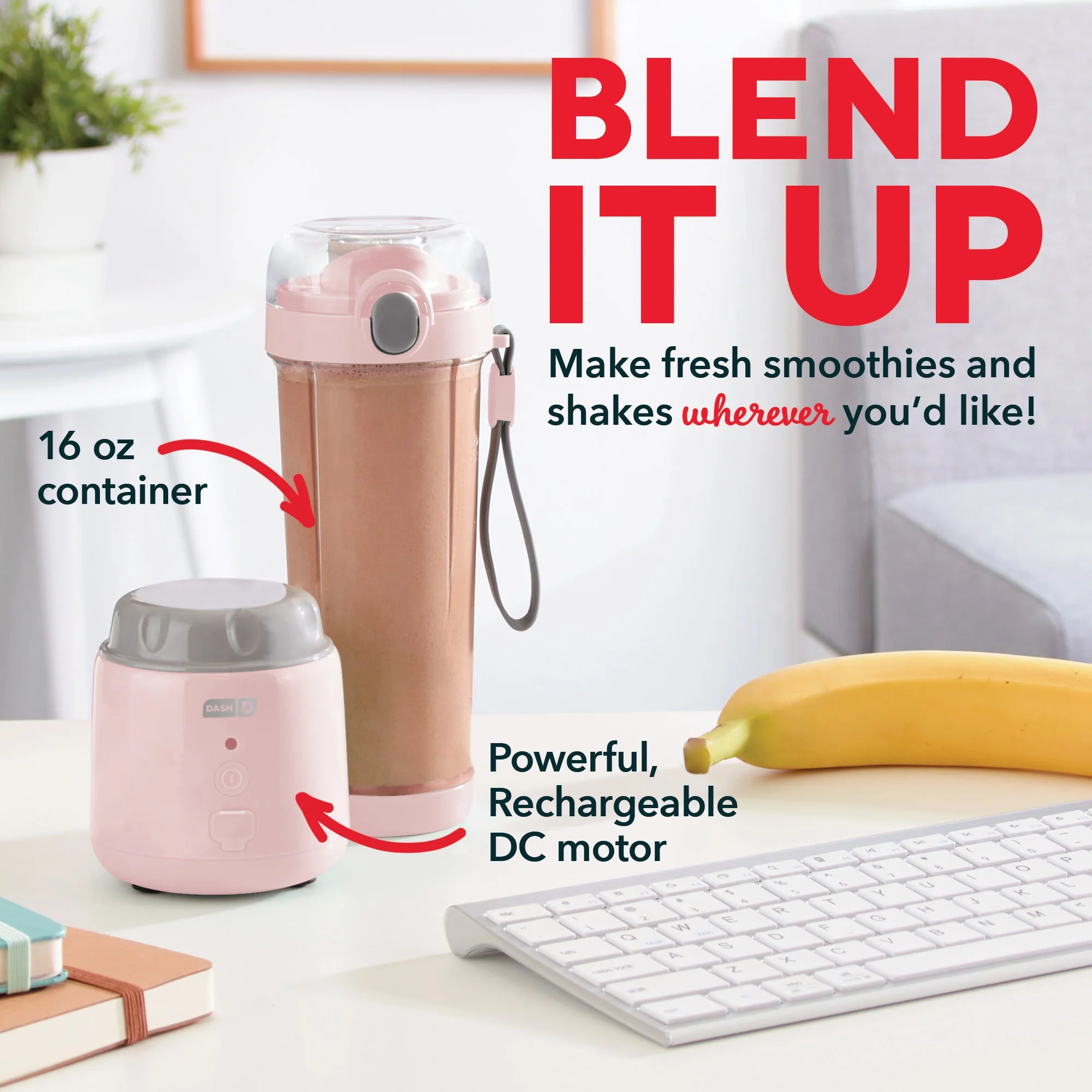 Pack your favorite recipe and blend fresh smoothies and shakes at the gym, outdoors or anywhere you’d like with the Dash Portable Blender! A powerful DC motor can handle fruits, veggies and small ice cubes, while the 12.8oz Blending Bottle holds the perfect amount for a single serving; plus, the Blender is rechargeable! The Blending Bottle comes with a leak-resistant Drinking Lid, so you can enjoy smoothies on the go, and the bottle is made of a durable clear Tritan™ material that won’t shatter or get foggy over time. Grab the included Recipe Guide and get started making delicious drinks!