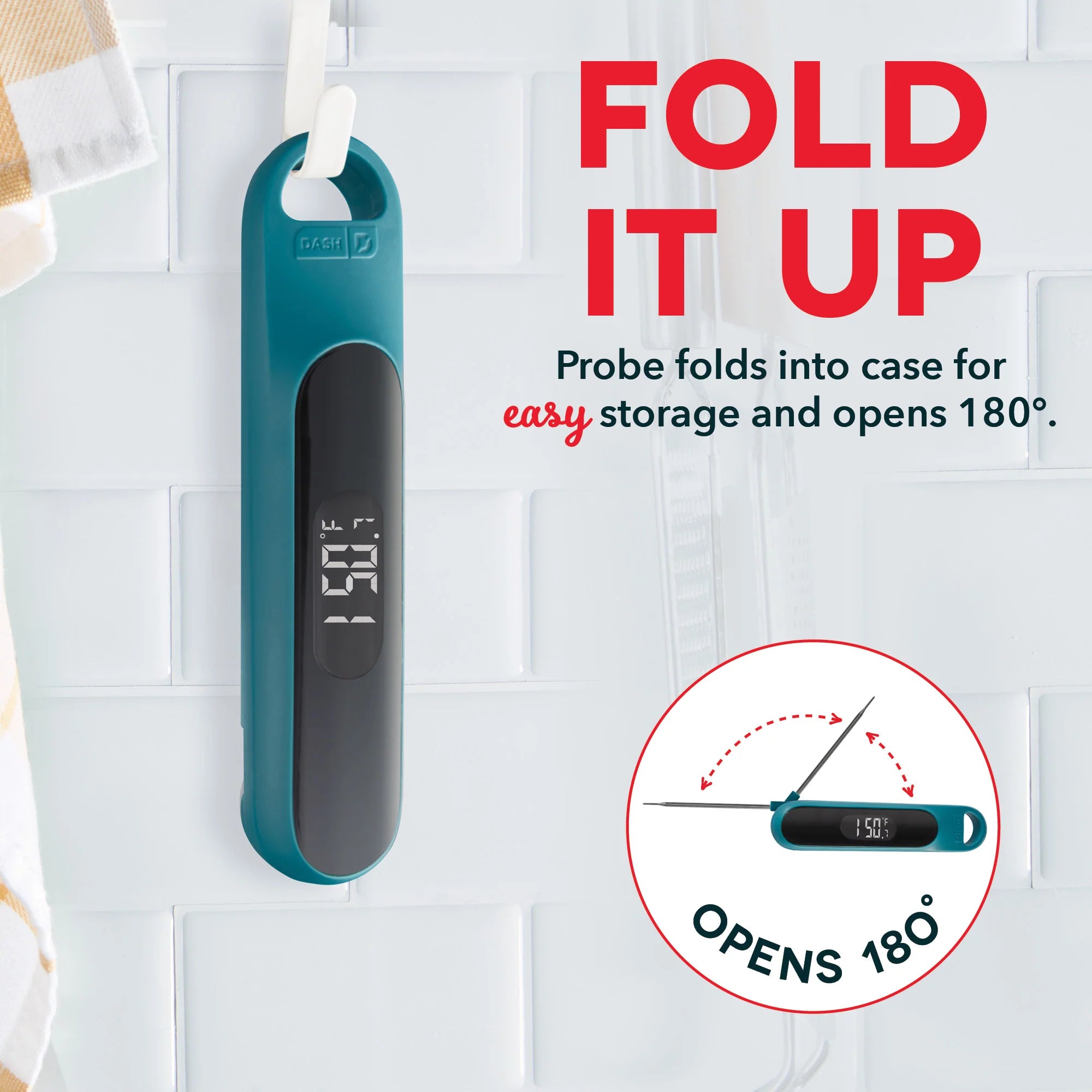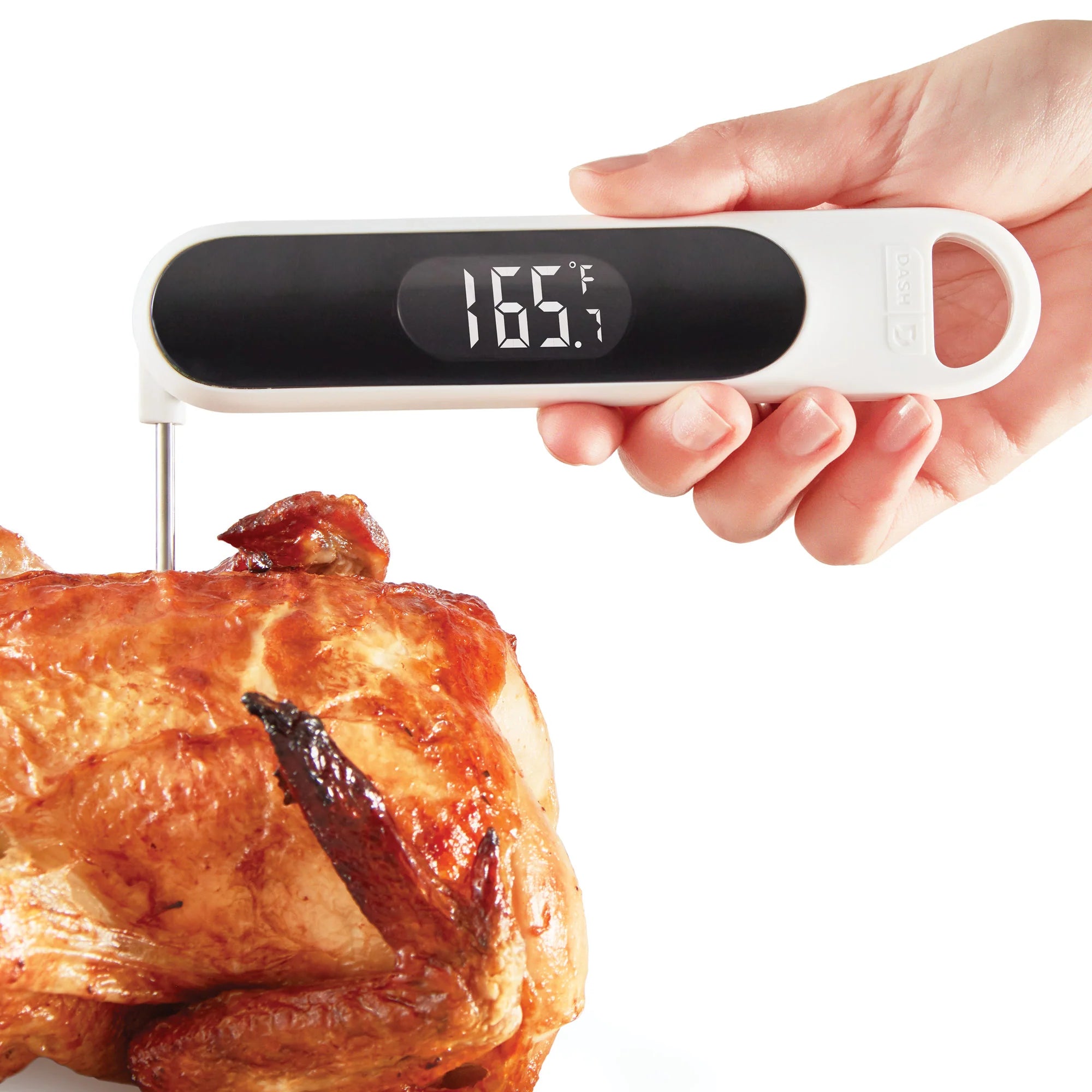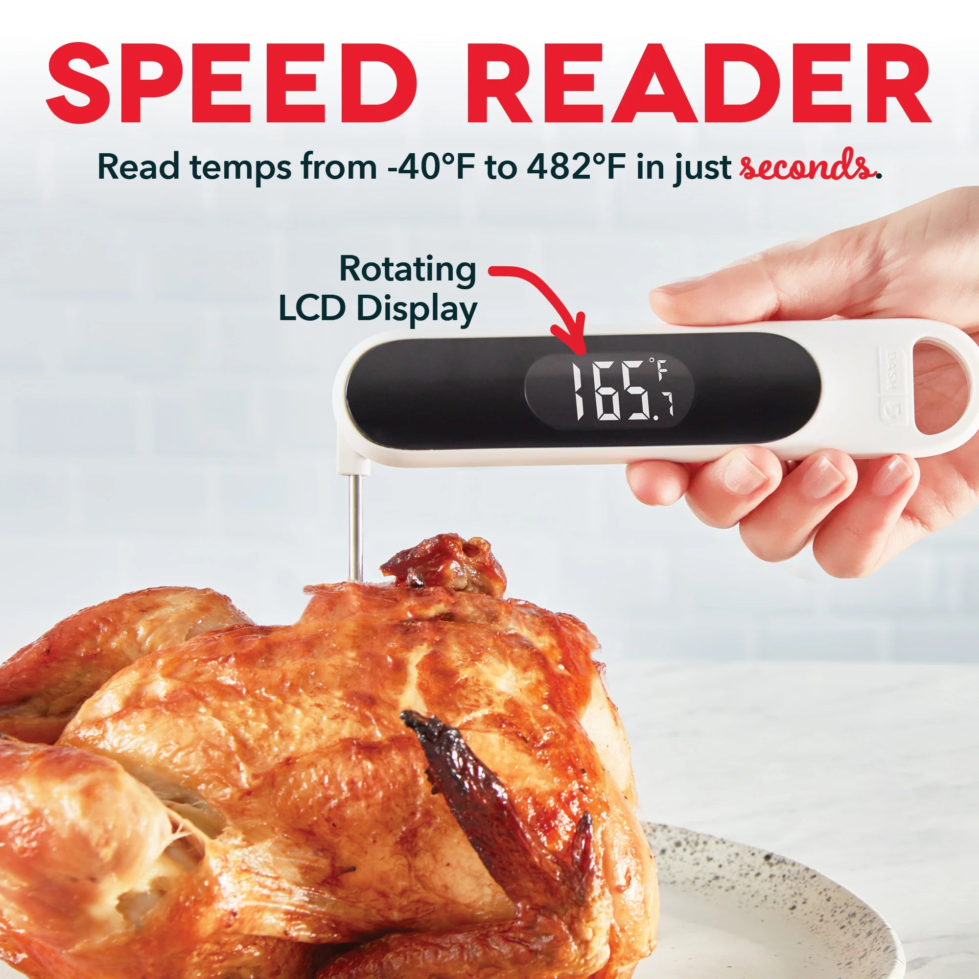 Elevate your cooking with the Dash Precision Quick-Read Thermometer! Check meats and entrées for the perfect doneness while cooking, or read the temperature of chilled desserts as they cool! The Quick-Read Thermometer’s probe provides an accurate reading within 3 seconds, whether hot or cool, and you can easily read in Celsius or Fahrenheit on the LCD display. When you’re done, the thermometer is water resistant and easy to clean!