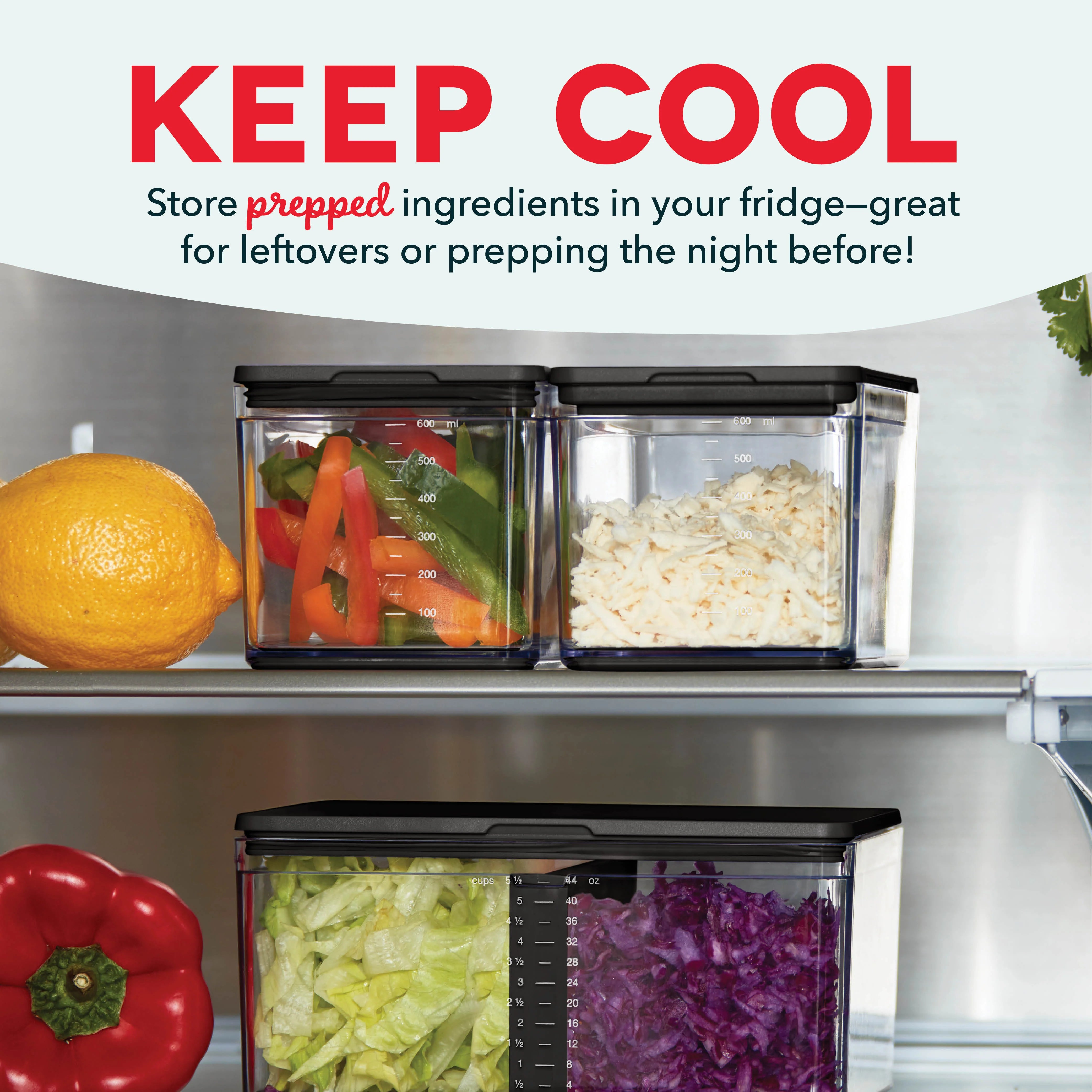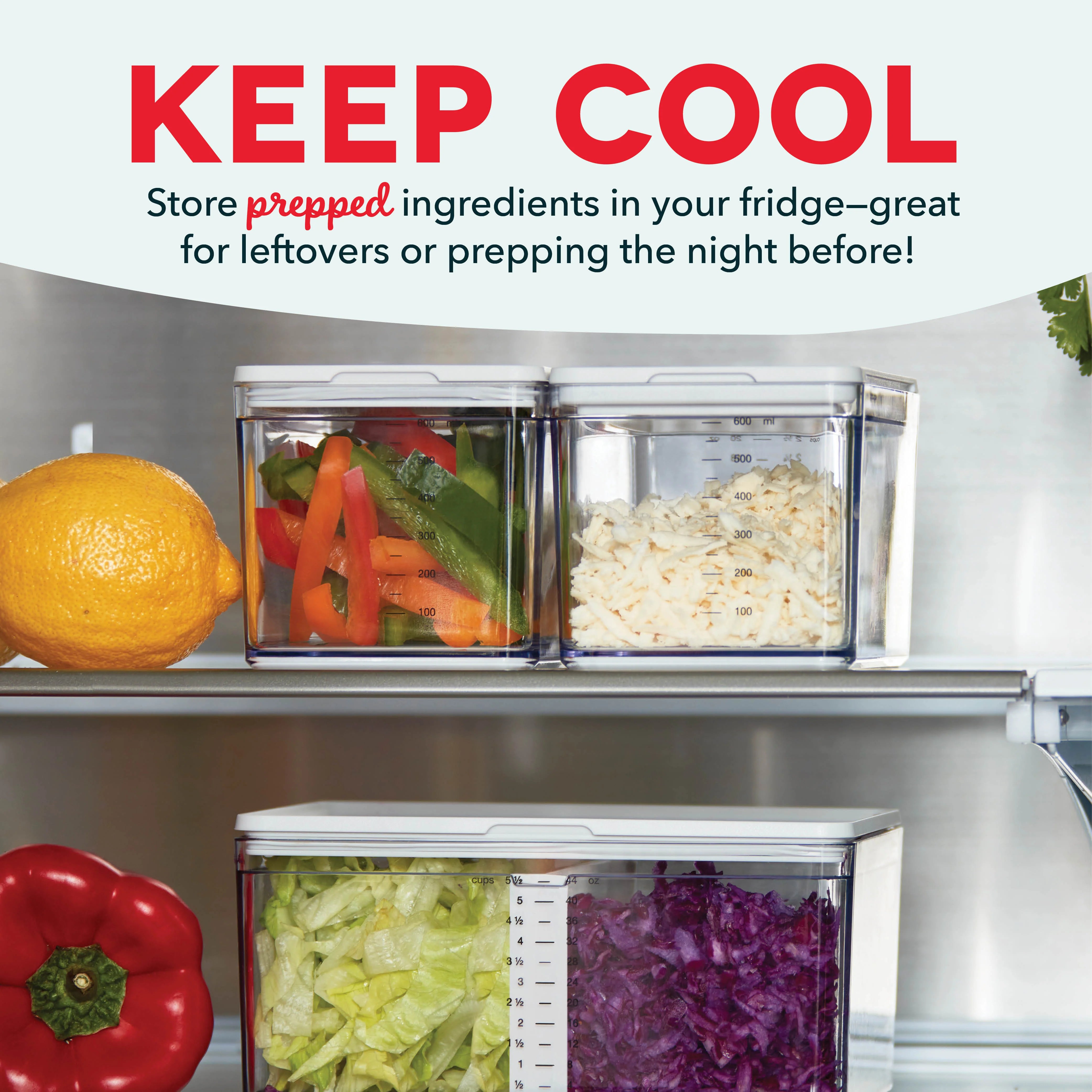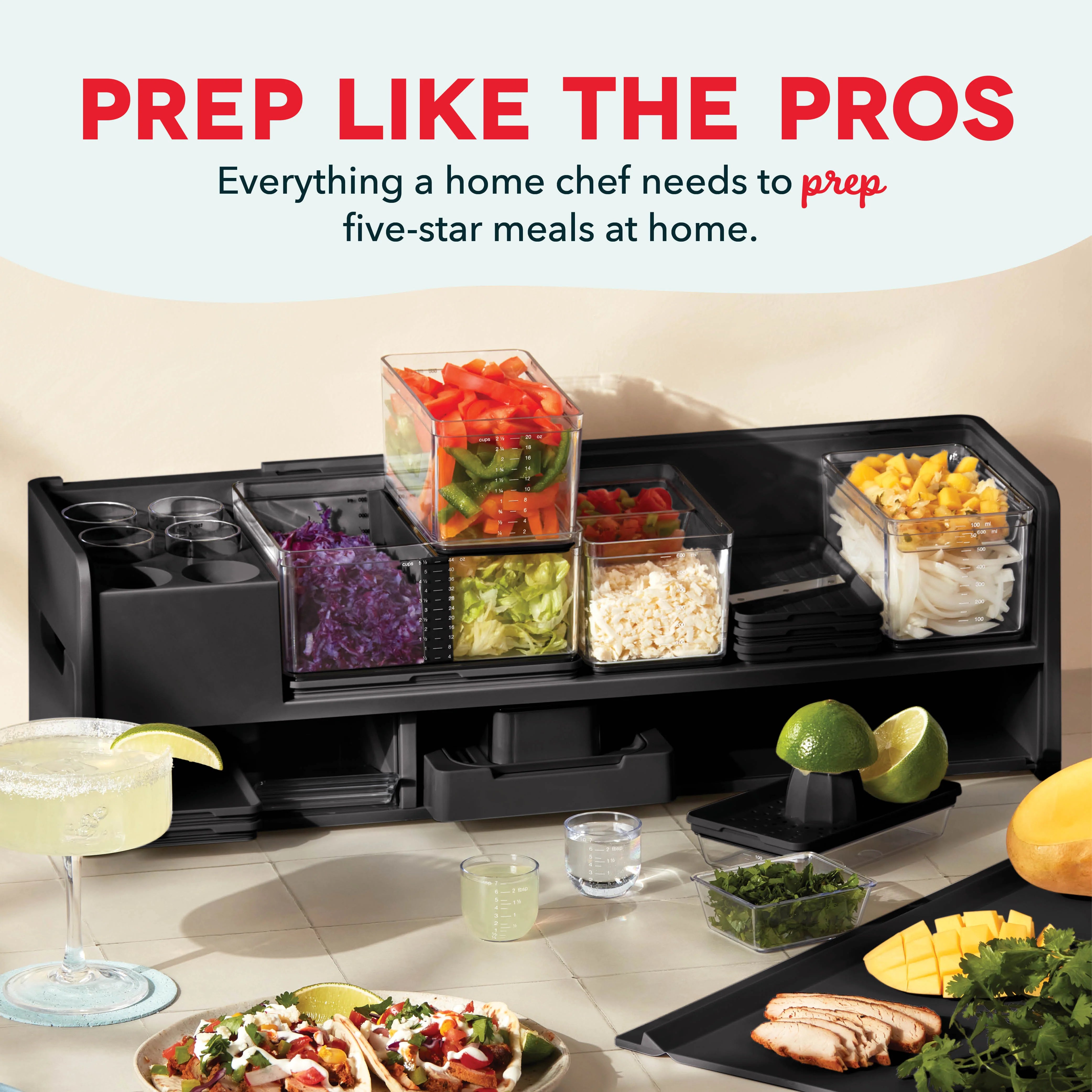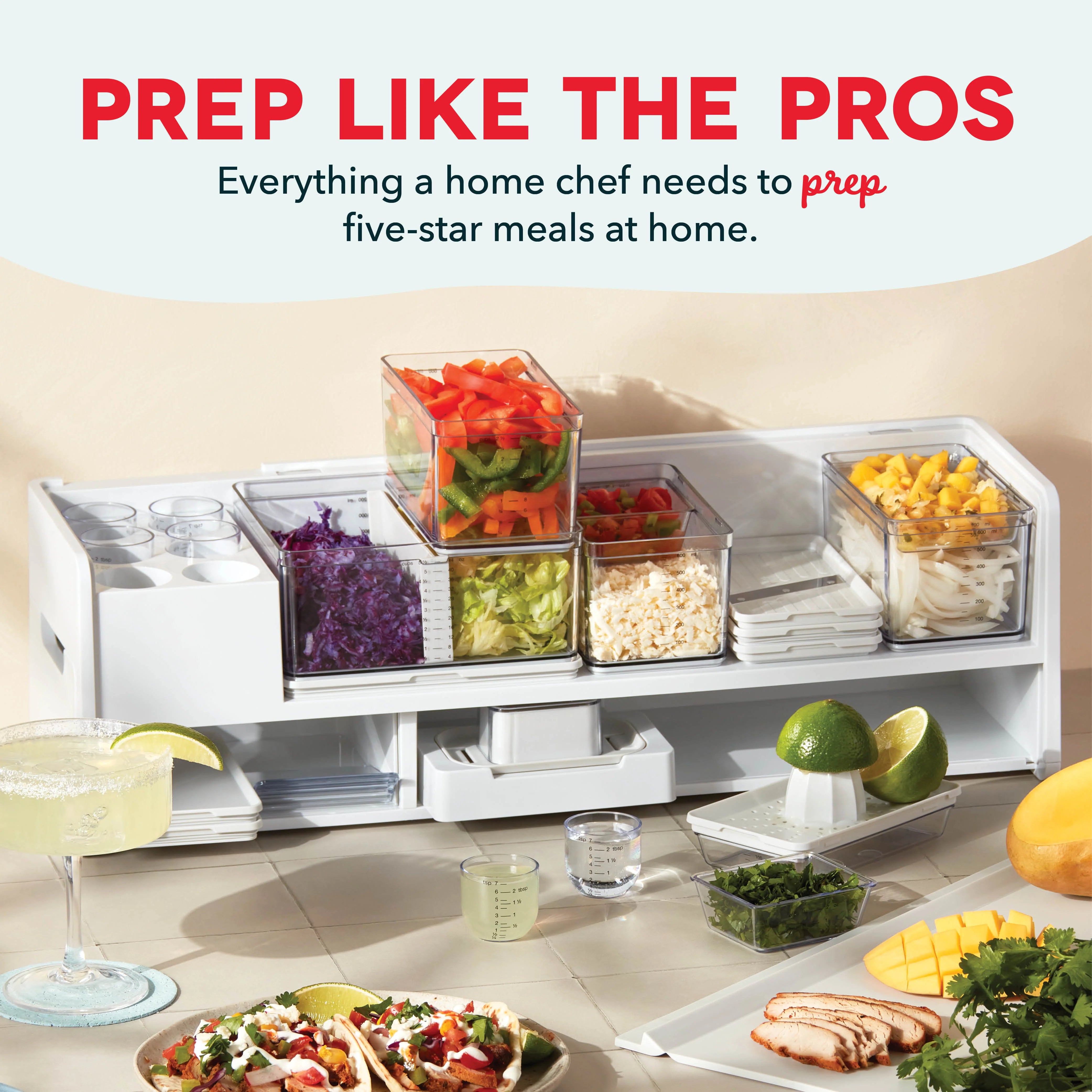 Trying to get dinner on deck while staying one prep ahead? The Prepdeck System has everything a home chef needs to prep five-star meals at home! The easy-to-use System keeps ingredients organized so that the kitchen and counter stay tidy, freeing up home chefs to cook without distraction, fully embracing the joy of cooking for family and friends. To help you take the next step in your culinary journey, five handy chef’s tools are included: A Juicer, Grater, Zester, Mandoline, and a 5-in-1 Peeler, plus a Garlic Crusher that doubles as a Finger Guard. Stay a cut above with an attached spacious Cutting Board. And store it all in 14 Storage Containers that range in size from Small to XL, all with Measurement Markings for easily sizing up ingredients! Large and XL Containers come with Lids for easy stackable fridge storage. The entire System packs up to go right in the fridge—prep the night before and store! When the prep work is done, accessories go right into the dishwasher. Prep for pizza night and get ready for Taco Tuesday with included PREP-cipe Guide! Now, are you ready to start cooking and zest with the best? YES, Chef!
