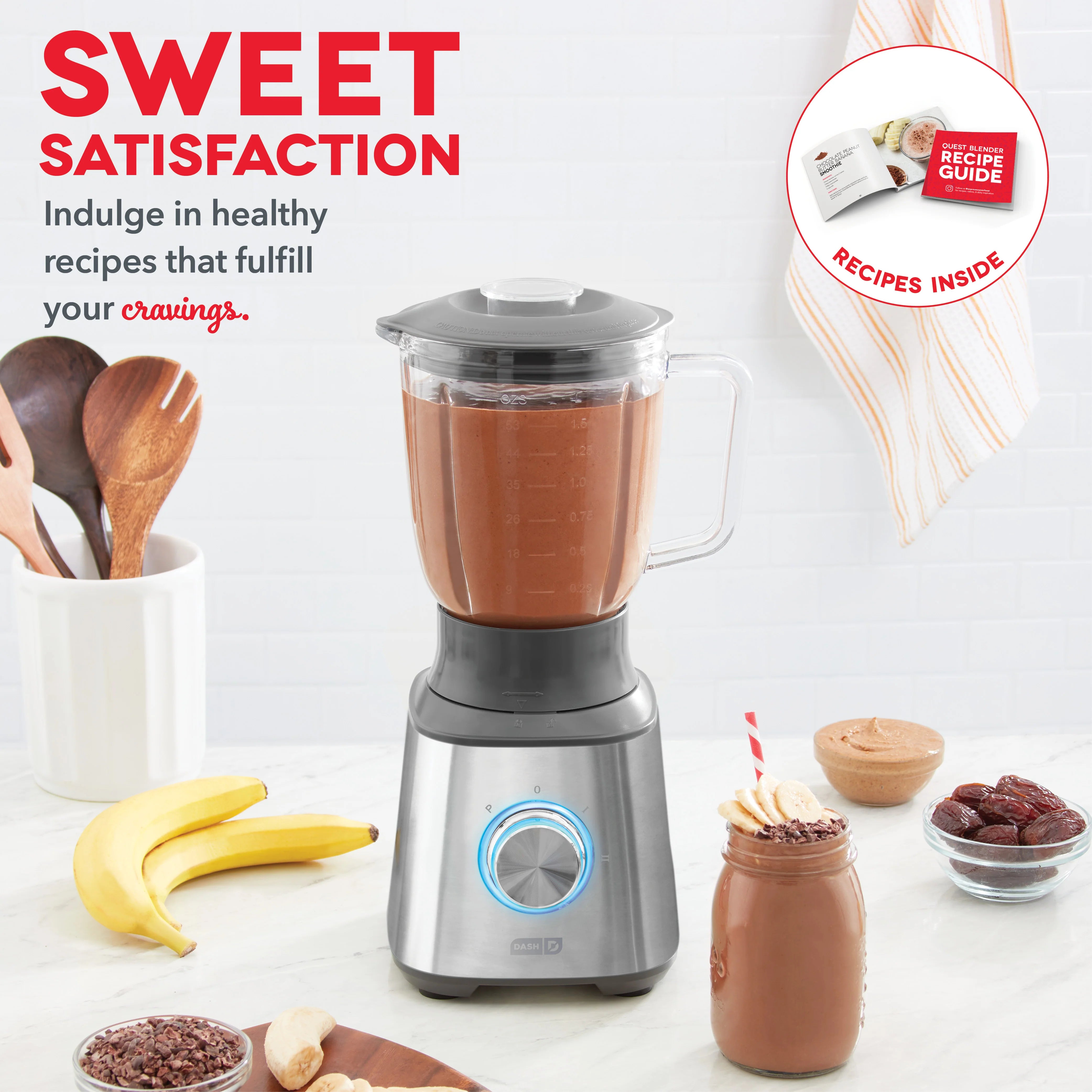 The Dash Quest Blender is the perfect everyday countertop blender for making delicious smoothies, soups, and more! The blender’s dial illuminates when plugged in for two easy settings, plus a third setting to pulse, and the powerful motor gives smooth results every time. The 1.5L glass jar is durable and dishwasher safe, and the handle and pour spout makes serving directly out of the blender easy. Stainless steel blades won’t dull over time, and the stainless exterior looks great in any kitchen. The 1.5L capacity makes the Dash Quest Blender the perfect blender for everyday cooking.