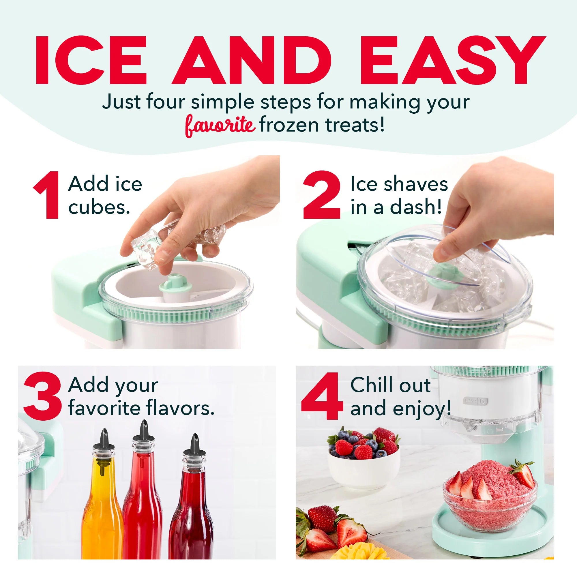 Now it’s snow easy to make shaved ice, snow cones, slushies, cocktails, and other frozen treats right on your countertop.