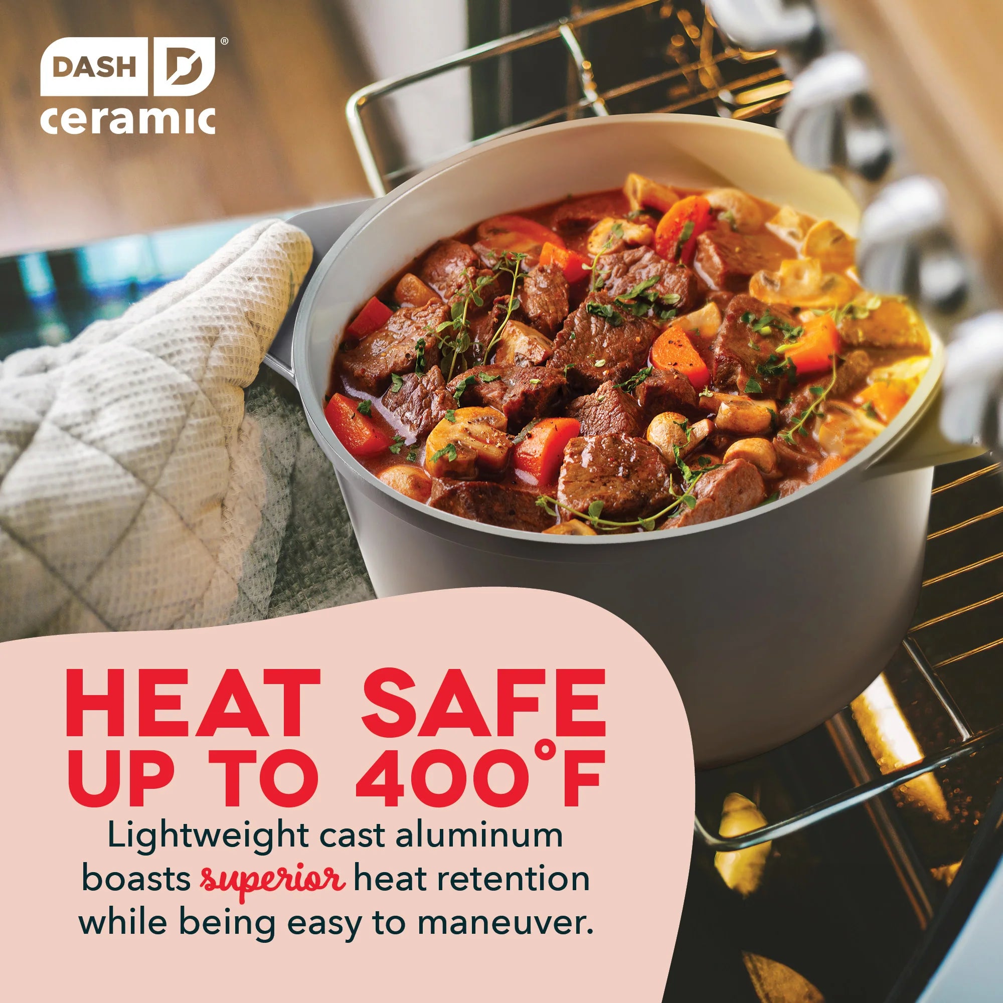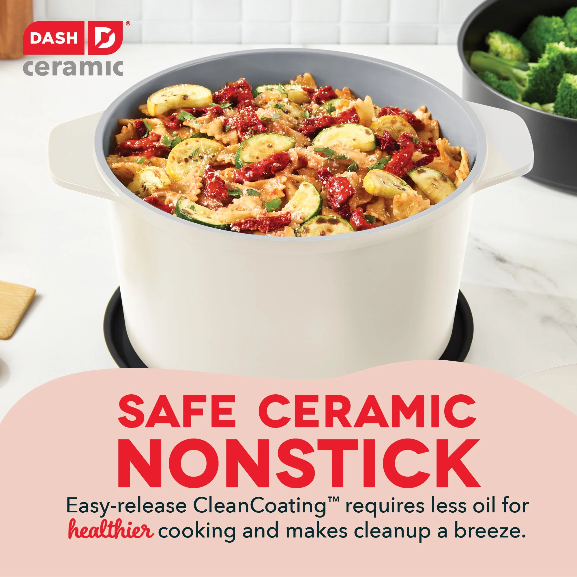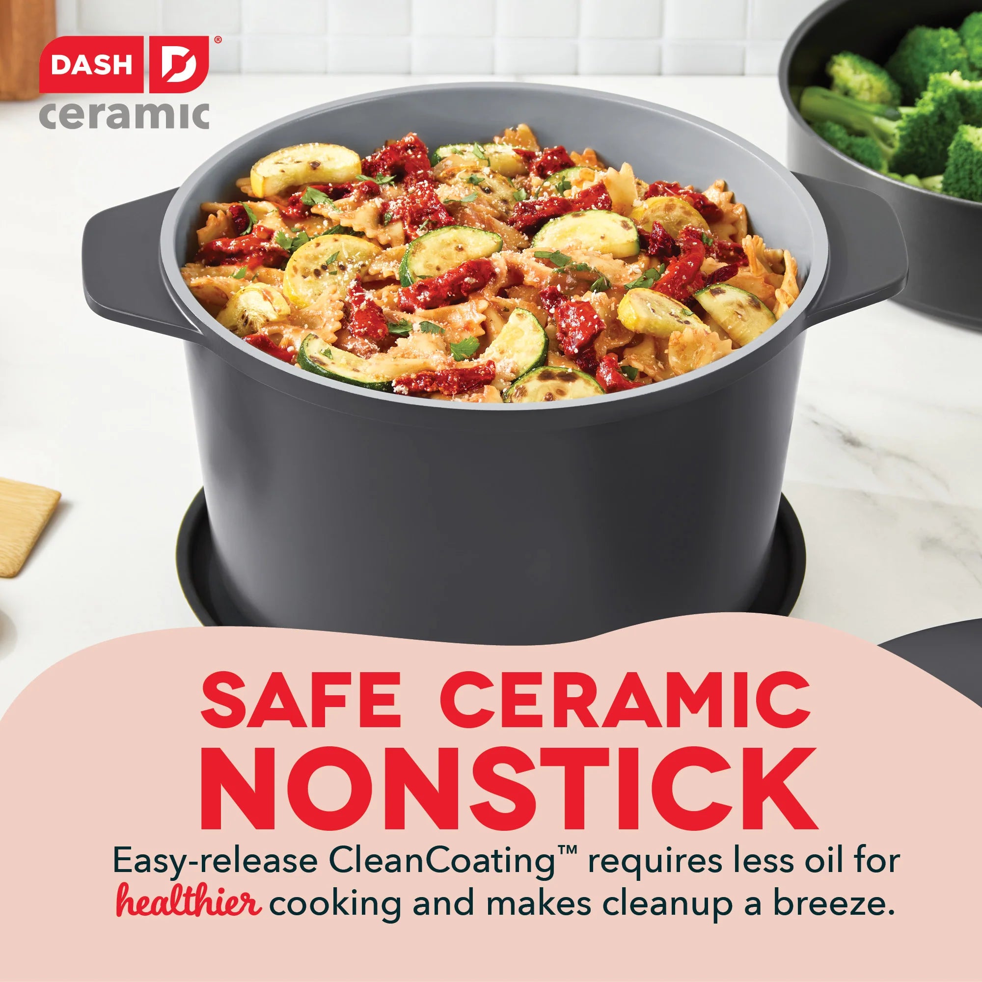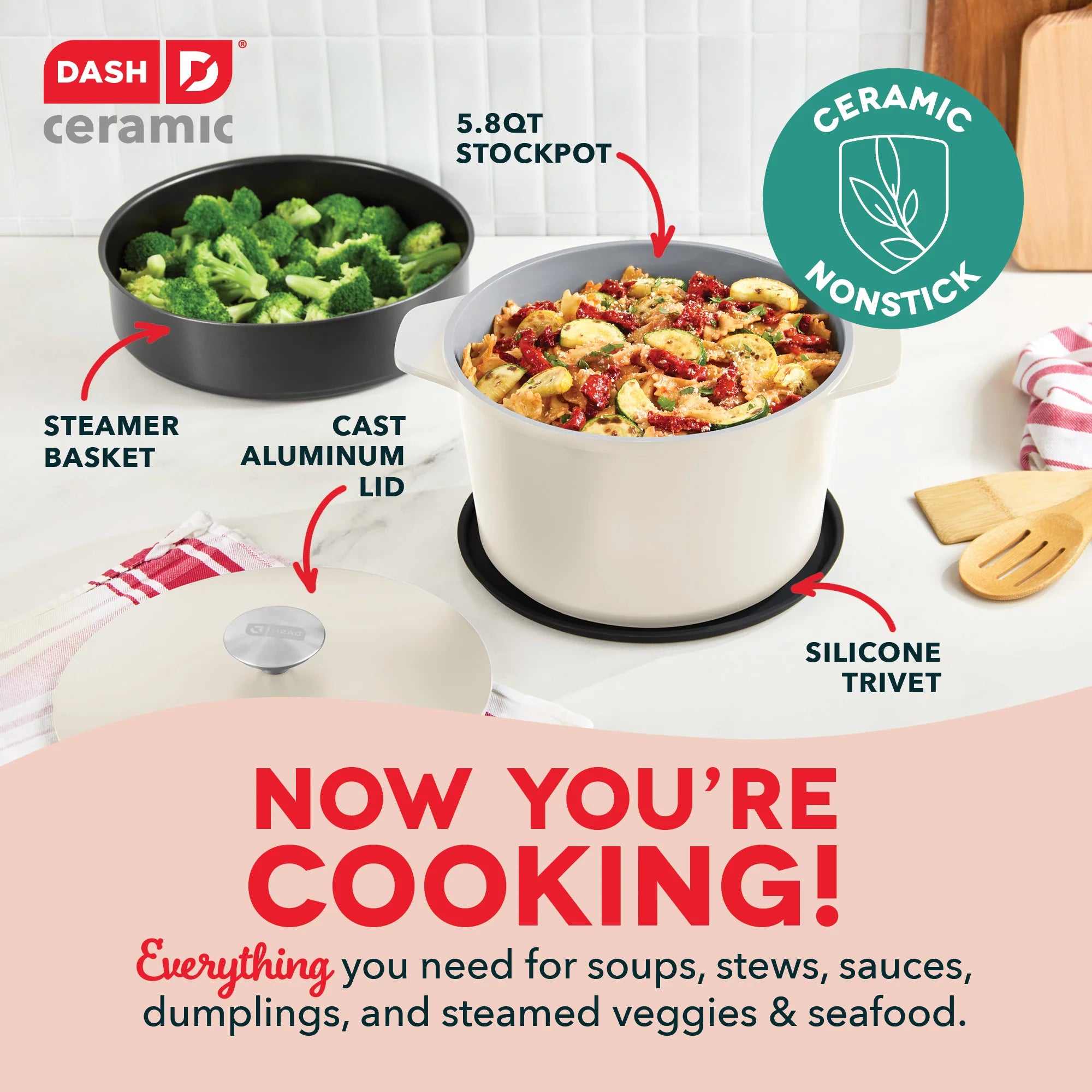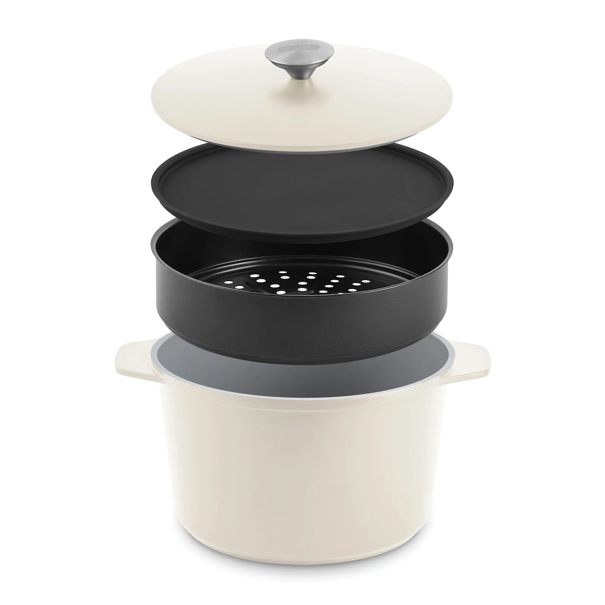 It’s time to cook healthier and store smarter! Each piece in the SmartStore™ 5.8QT Multi-Pot + Steamer Set is uniquely designed to pull double duty for endless meal possibilities while taking up minimal storage space. Make hearty soups and stews with the 5.8QT Stockpot along with family-sized pasta dishes and savory sauces. Lightweight but durable, this Stockpot heats up quickly and distributes heat evenly for faster and more efficient everyday cooking. When paired with the Steamer Basket, it steams vegetables, seafood, and dumplings to perfection. Compatible with all cooktops and oven-safe up to 400°F, this Set effortlessly moves from stove to oven to table, and the included Silicone Trivet protects countertops and tabletops. Each piece of this set boasts CleanCoating™ Ceramic Nonstick for easy food release that requires minimal oil for healthier cooking! This SmartStore™ set is constructed with recycled cast aluminum, so you can cook sustainably and enjoy lightweight maneuverability. When you’re done dishing out delicious dishes, simply nest the pieces together to store and reclaim your cabinet space. Healthier, effortless cooking is now on the menu!