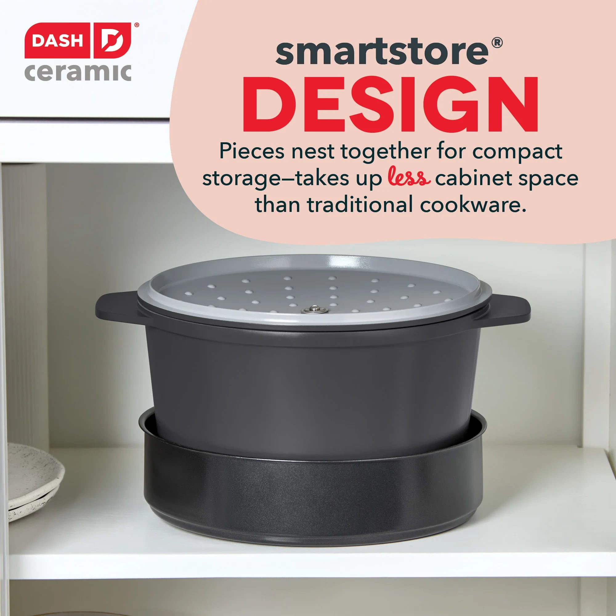 It’s time to cook healthier and store smarter! Each piece in the SmartStore™ 5.8QT Multi-Pot + Steamer Set is uniquely designed to pull double duty for endless meal possibilities while taking up minimal storage space.