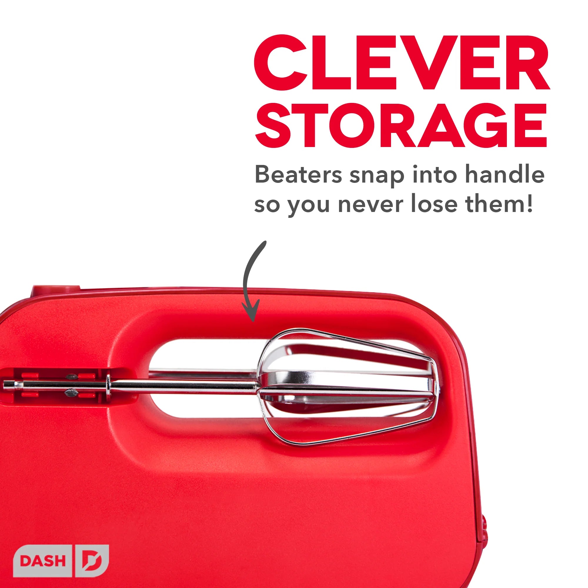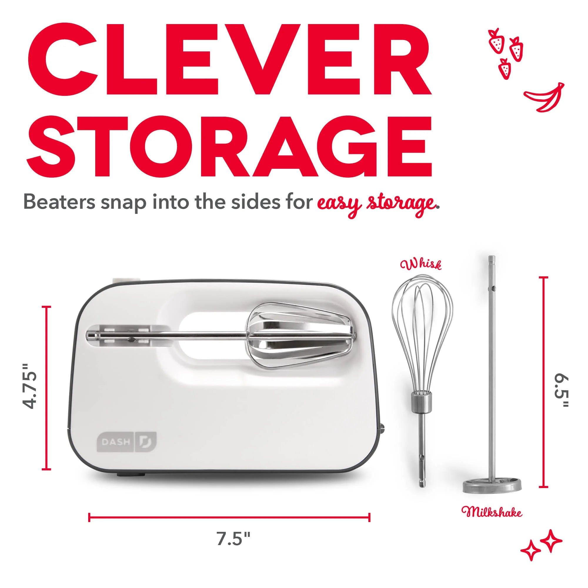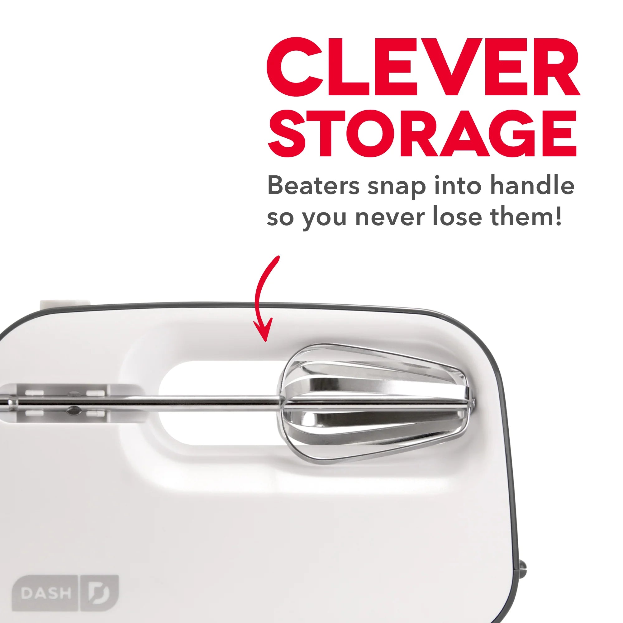 Compact storage combines with three-speed power in the Dash SmartStore® Hand Mixer.
