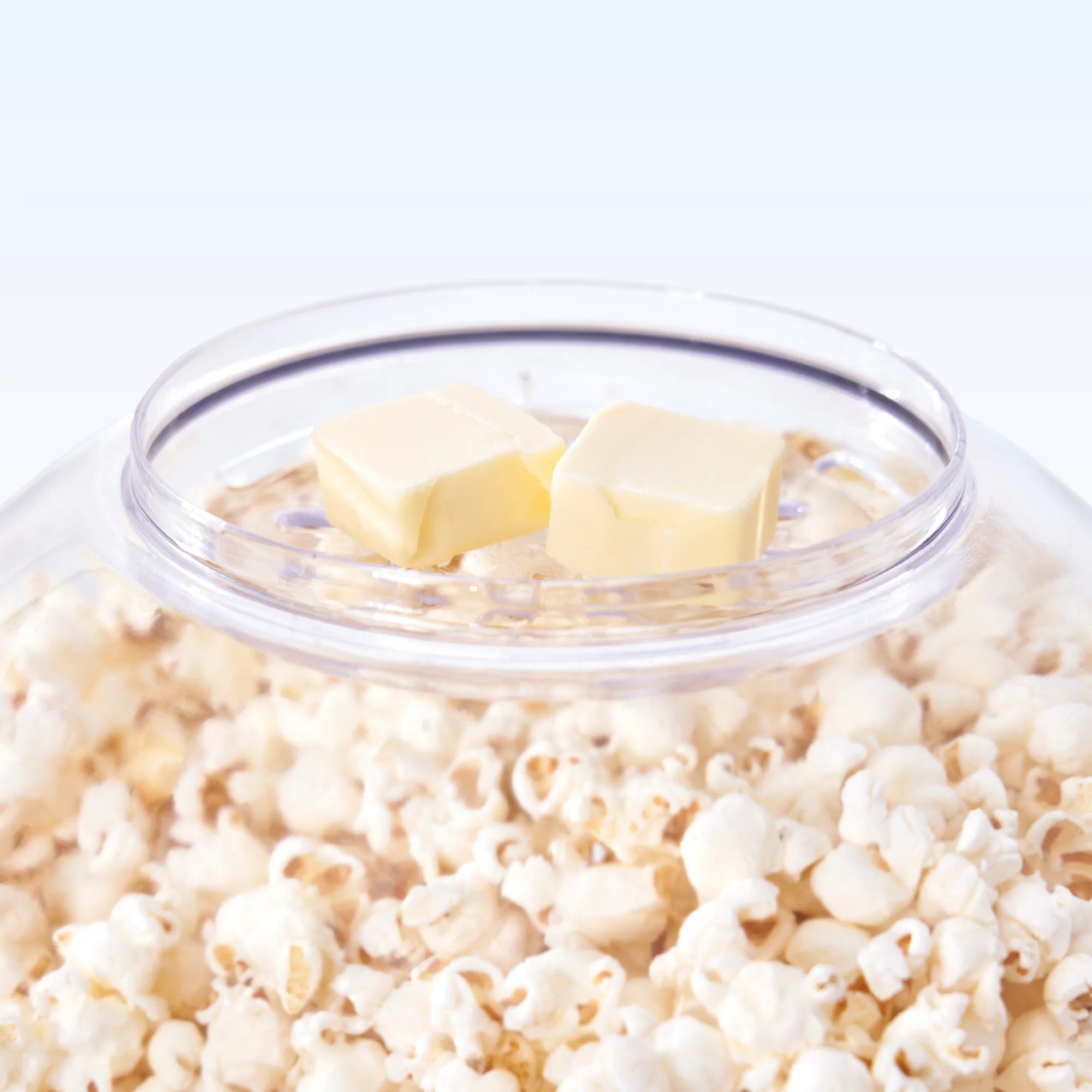 Pop and serve fresh homemade popcorn in one easy-to-store PTFE nonstick popcorn maker! Pop popcorn without having to heat the stove with the Stirring Popcorn Maker’s one-touch power: just add kernels, a little oil, and press the Power Button! Perfect for enjoying movie-theater-style popcorn, the Bowl of the SmartStore® Popcorn Maker lets you watch popcorn popping. and also doubles as a serving dish. With the included Measuring Cup, you’ll always make just the right amount for friends and family. The SmartStore® design makes it so the lid and base stack together, taking up less space in your cabinets. Get started enjoying delicious homemade popcorn right away — recipes included!