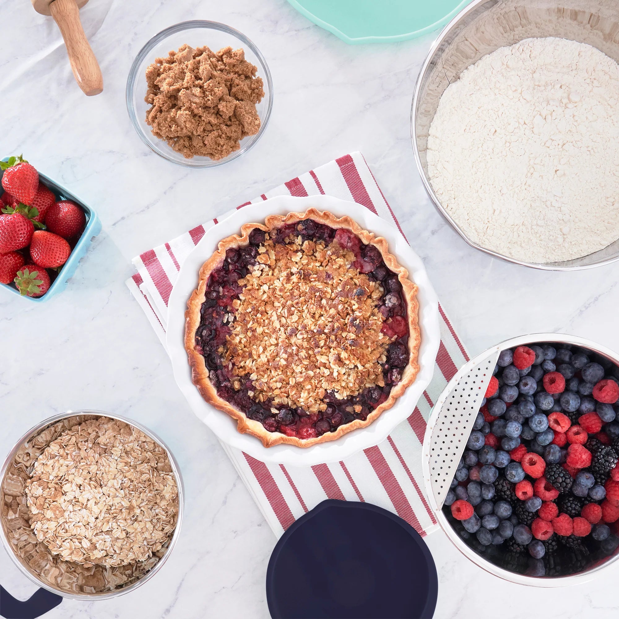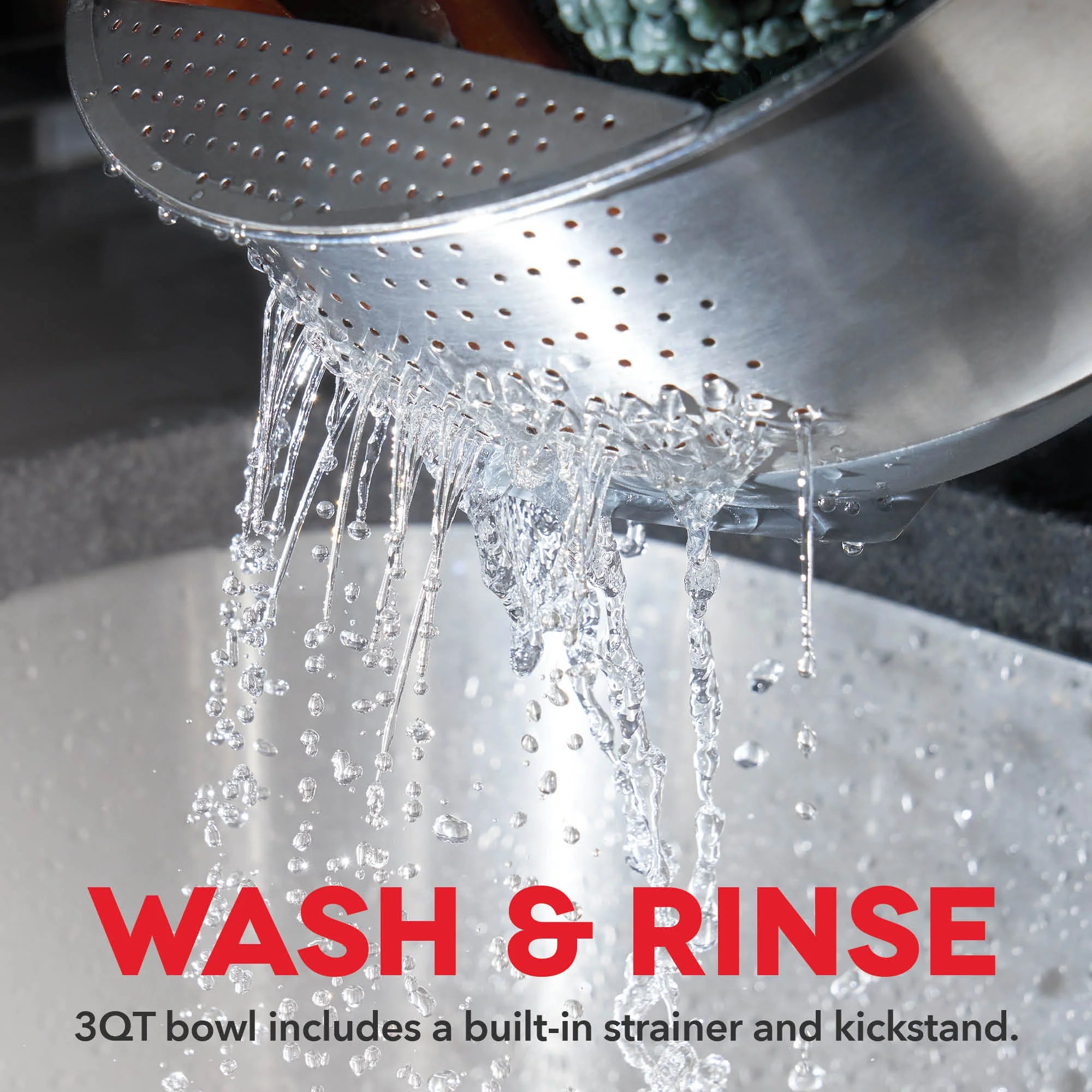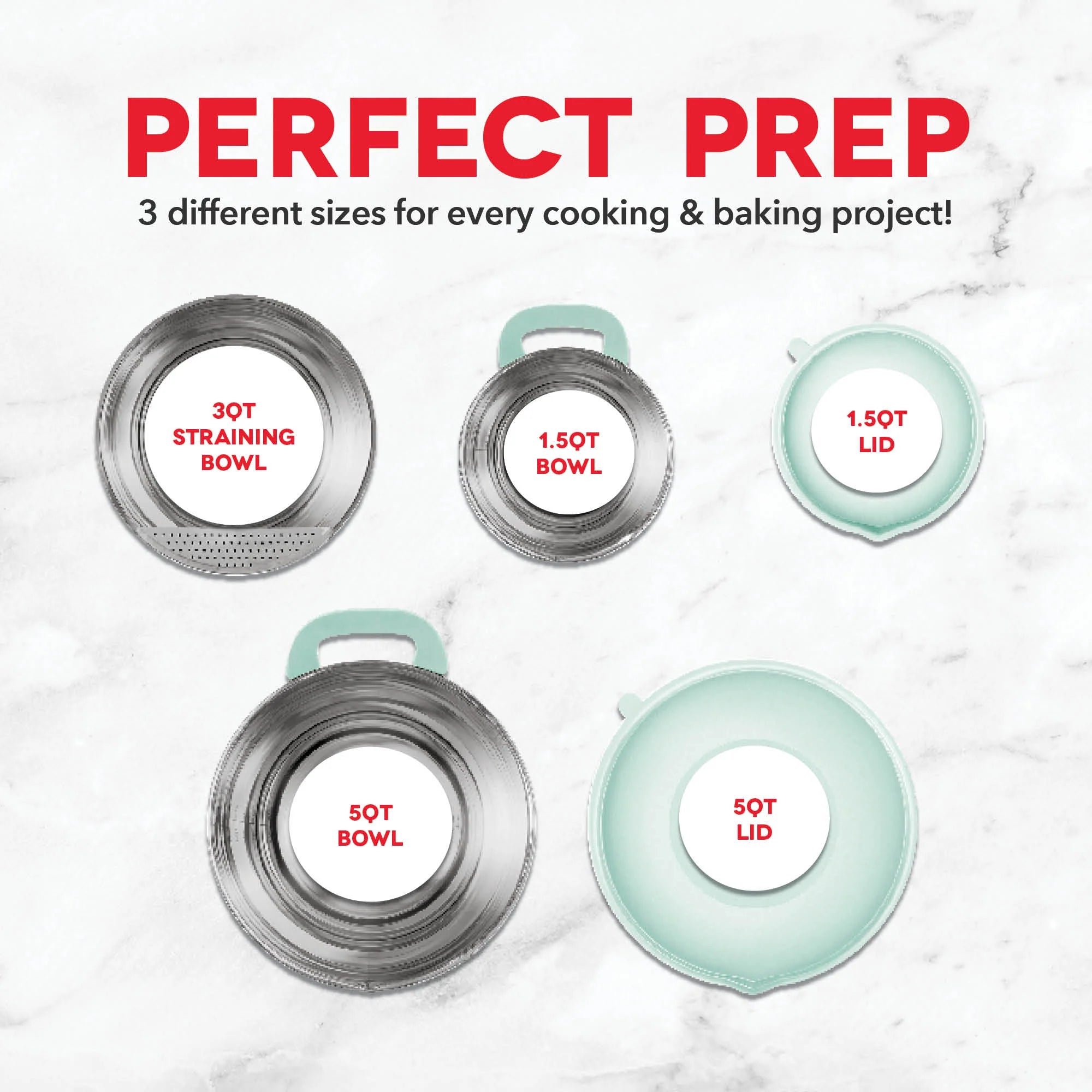 Multi-purpose Dash Stainless Steel Mixing Bowls are durable kitchen bowls for all your cooking and baking needs. Silicone bases and built-in handles ensure that these bowls are easy to grip while combining ingredients, and there are measurements indicated on the inside of each bowl for precise mixing. The bowls each have a spout for easily pouring out ingredients, and the 3 QT bowl has a strainer perfect for pasta, vegetables, and more. 2 lids are included so you can store leftovers without using another container.