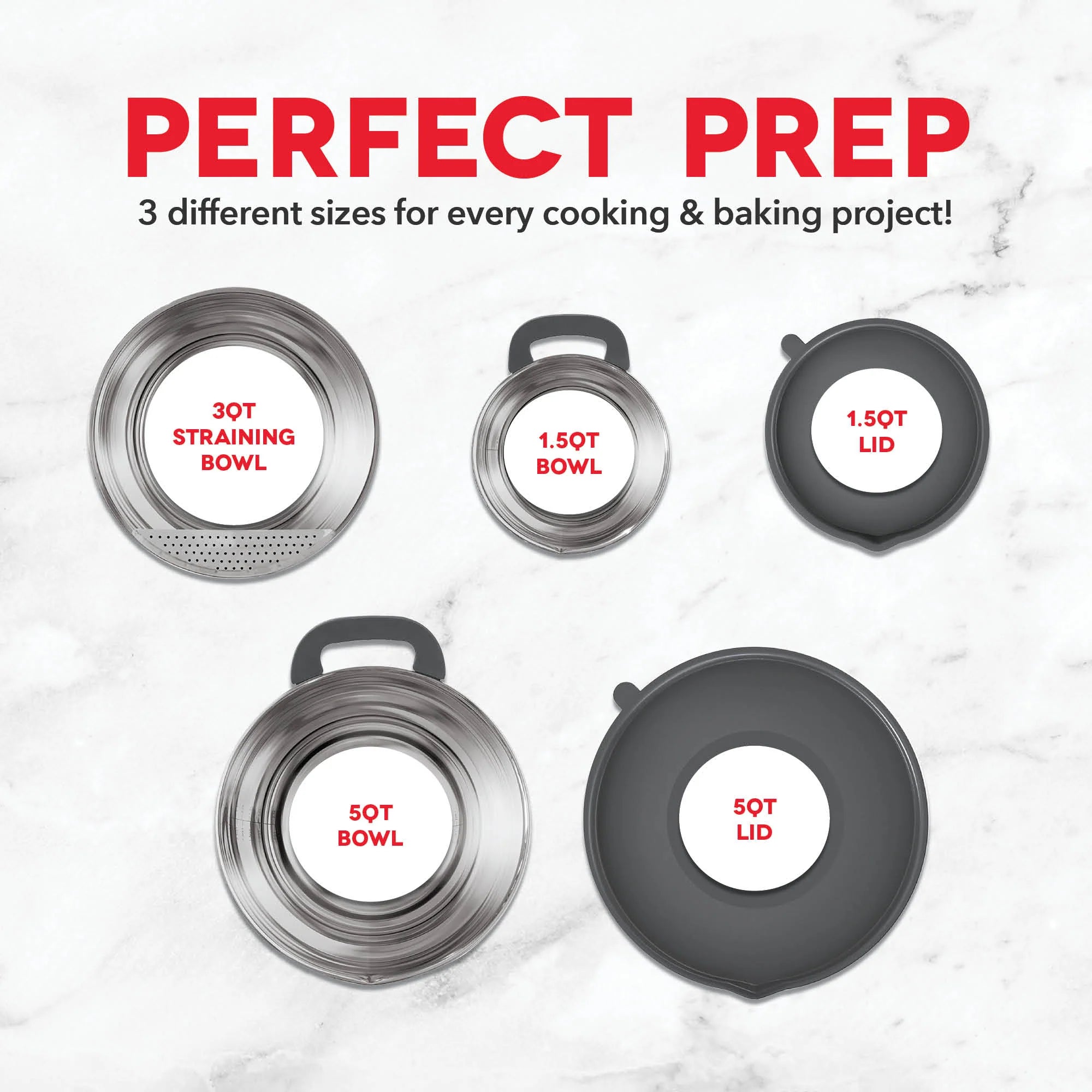Set of 3 multi-function Stainless Steel Mixing Bowls, perfect for food prep and storage.