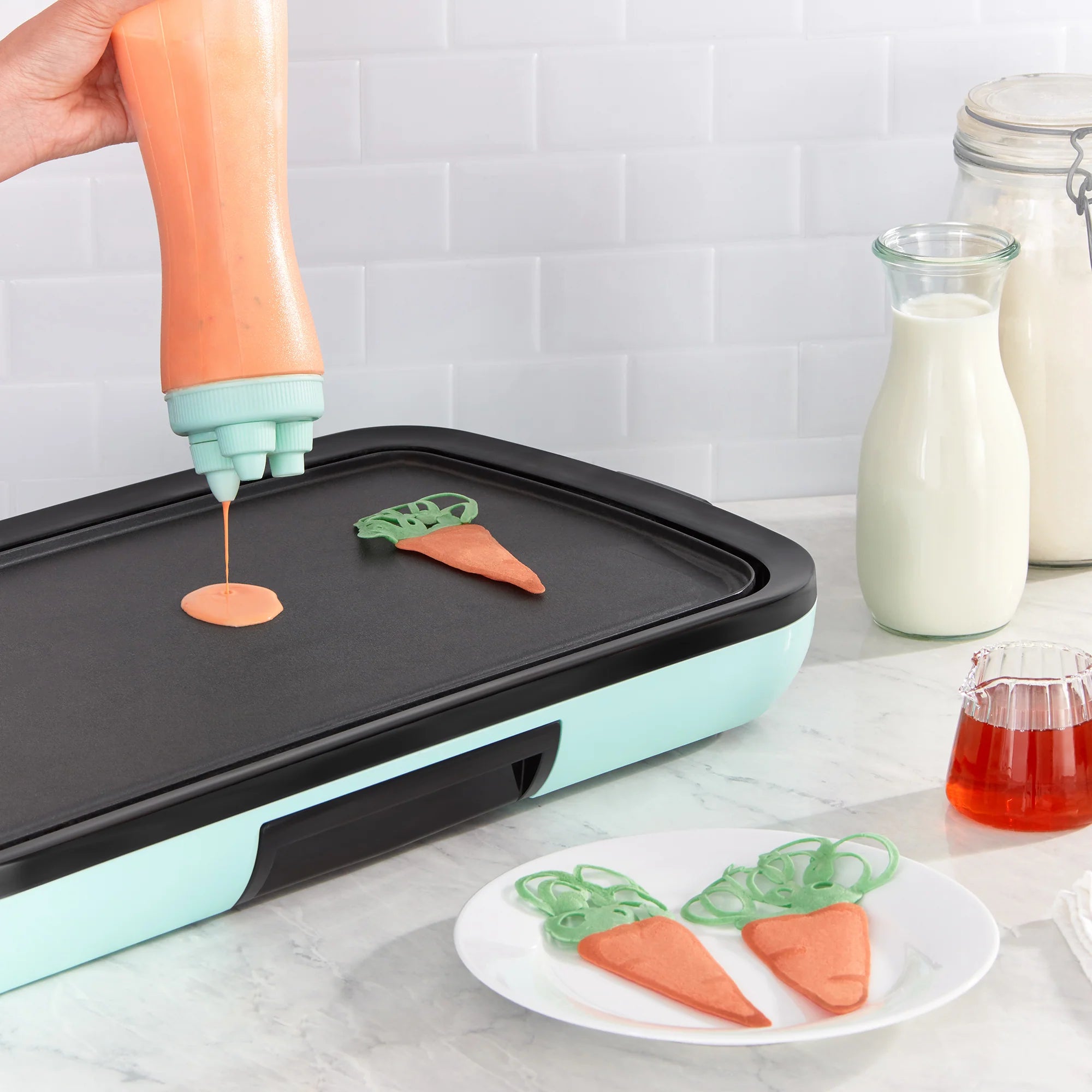 Unleash your creativity with the SuperSqueeze™ Batter Bottle! This easy-to-use squeeze bottle makes pancake art a snap, with three tips that allow you to create detailed drawings on any pan or griddle. Not just for pancakes, the Batter Bottle is also great for serving dips and sauces for precision plating and restaurant-style presentation. When you’re done, the tips store conveniently on the top of the Bottle, and it’s dishwasher safe so cleanup is a snap! Get doodling with the SuperSqueeze™ Batter Bottle!